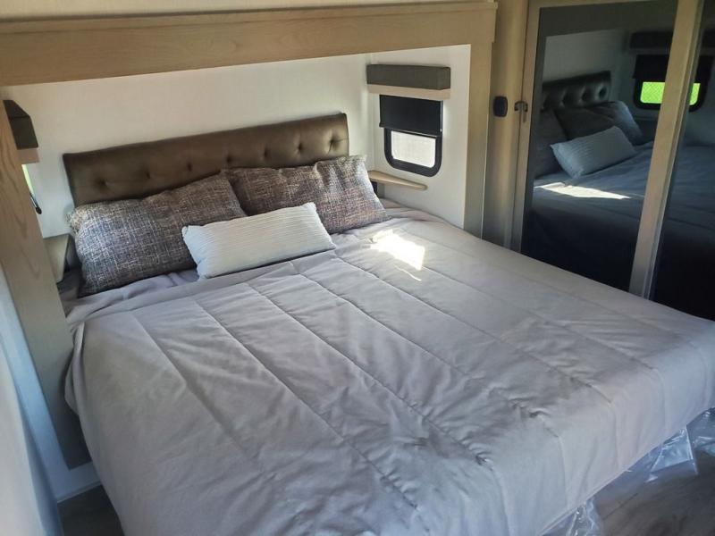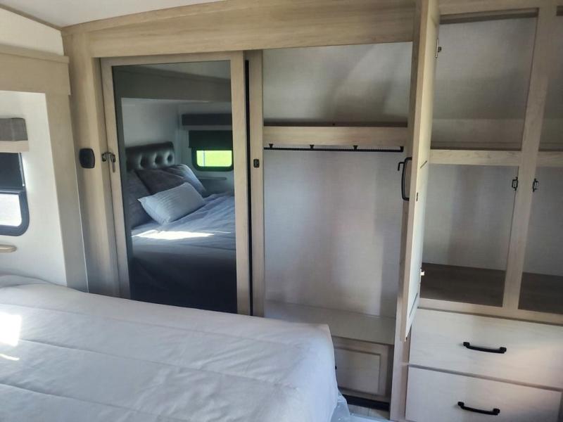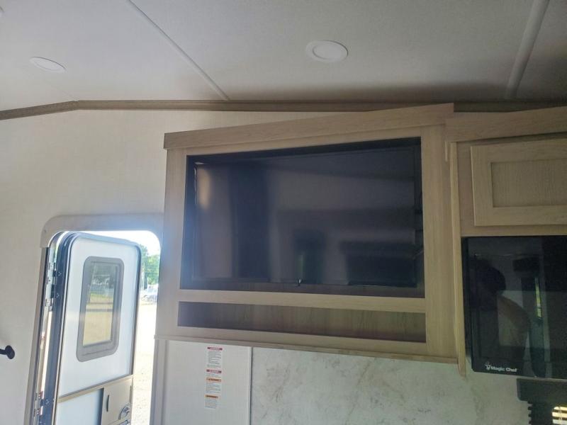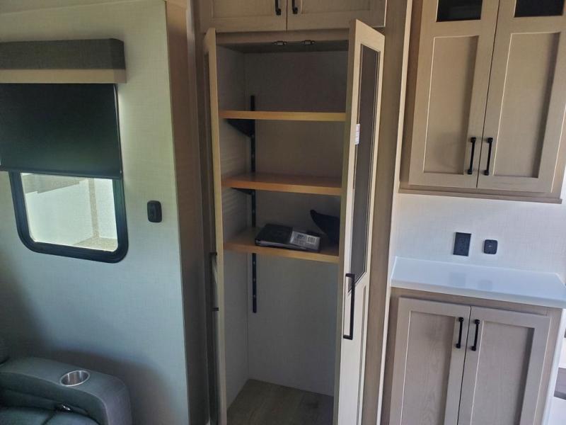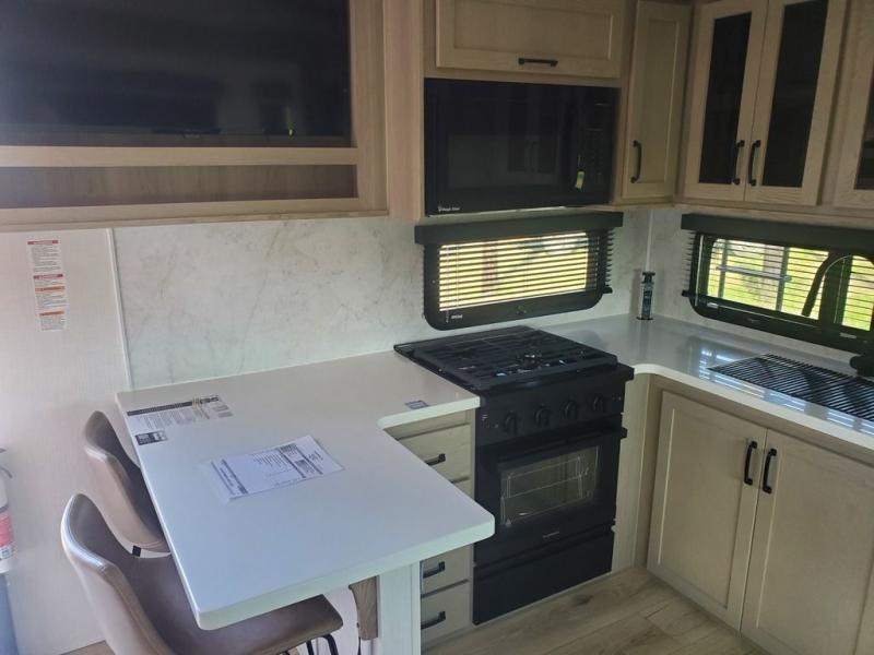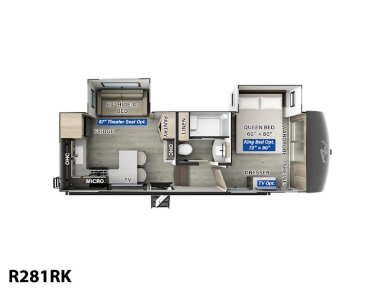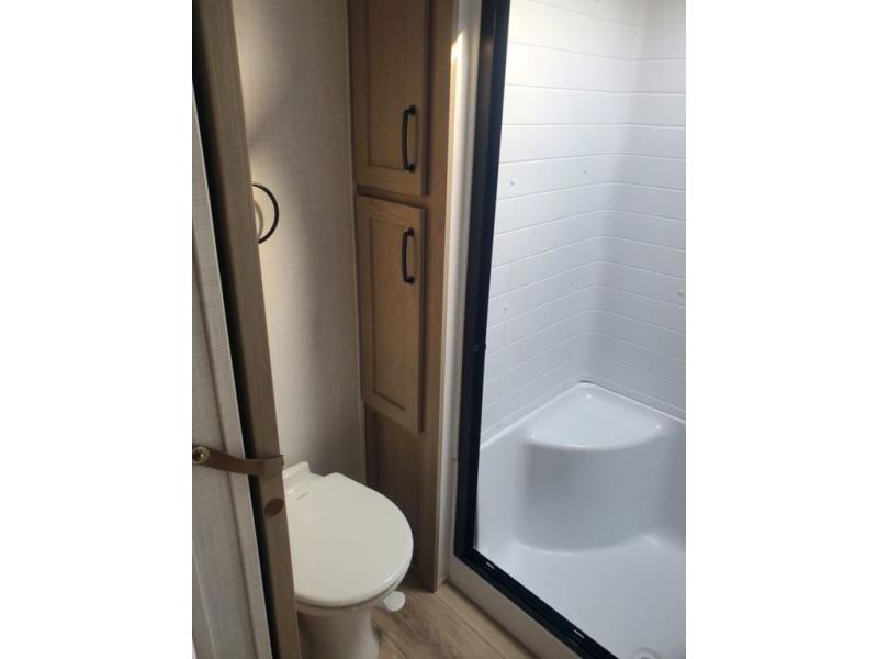 Looking for a spacious bedroom and bathroom for the perfect couple's RV with extra sleeping space for guests? This model provides a queen bed slide out for more interior floor space to get to the front wardrobe with shelves, and the dresser with a window above for great views of your campsite. The bathroom offers a shower with a seat, linen storage, and counter space for your toiletries. The main living and kitchen combined area has a hide-a-bed sofa slide that allows two guests to stay the night or you can choose the optional theater seat. There is also a breakfast bar with stools to dine at, and a U-shaped counter including appliances to make meals and store leftovers. And you will find exterior storage to bring along camping chairs and extra gear.