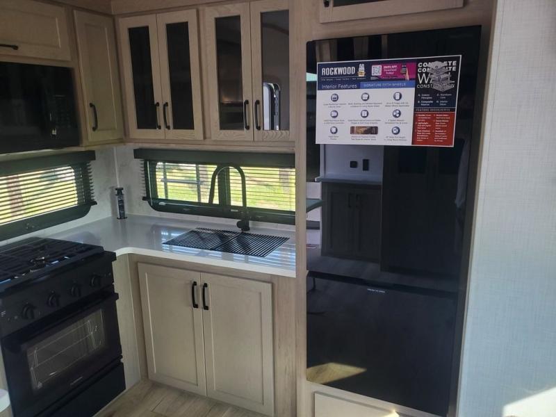 With any Rockwood Signature fifth wheel or travel trailer by Forest River RV, you will enjoy superior construction that includes laminated white fiberglass sidewalls, a radius roof with vaulted interior ceilings, plus radiant foil insulation and an enclosed underbelly for use in all types of weather. Some convenient exterior features include Keyed Alike locks, a rear ladder, a 200W solar panel, and a tire pressure monitor system with a monitor for added safety. The interior offers a One Touch OneControl panel with WeRV app control, for lights, awning, slides, water heater and more, and the Air 360+ omnidirectional antenna with WiFi prep lets you work while away from home if needed. You will also appreciate the interior vaulted ceilings, residential soft close doors and drawers, solid surface kitchen countertops, and designer kitchen backsplash!