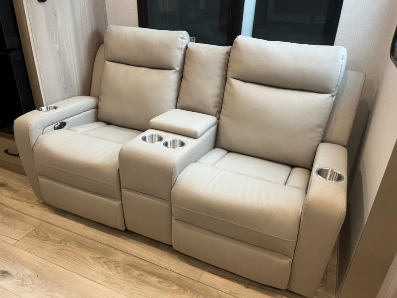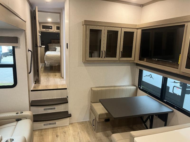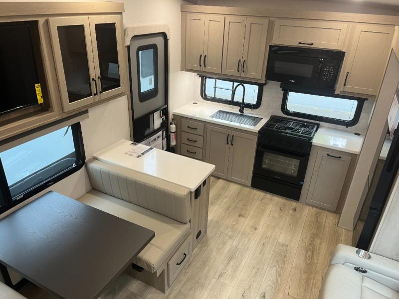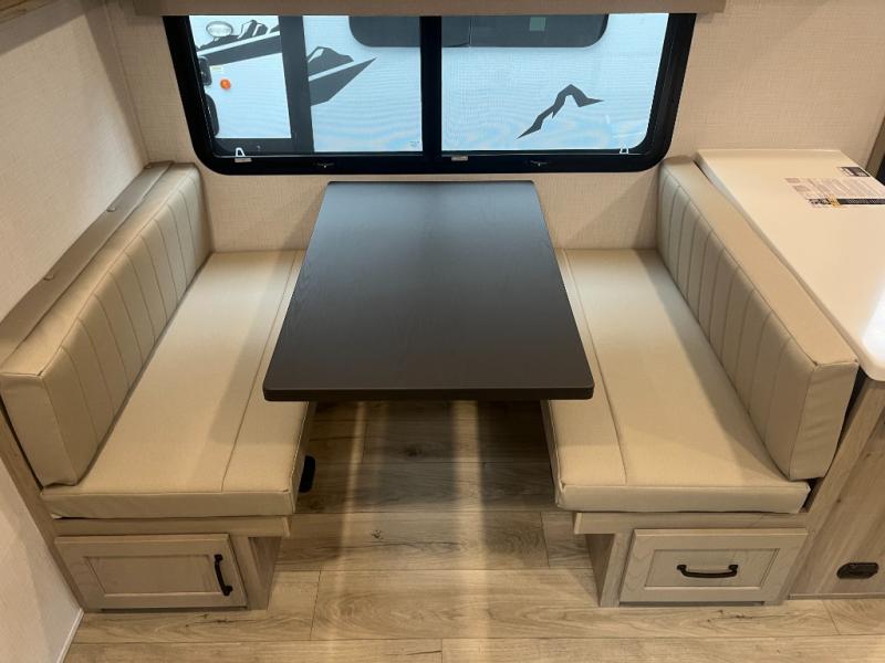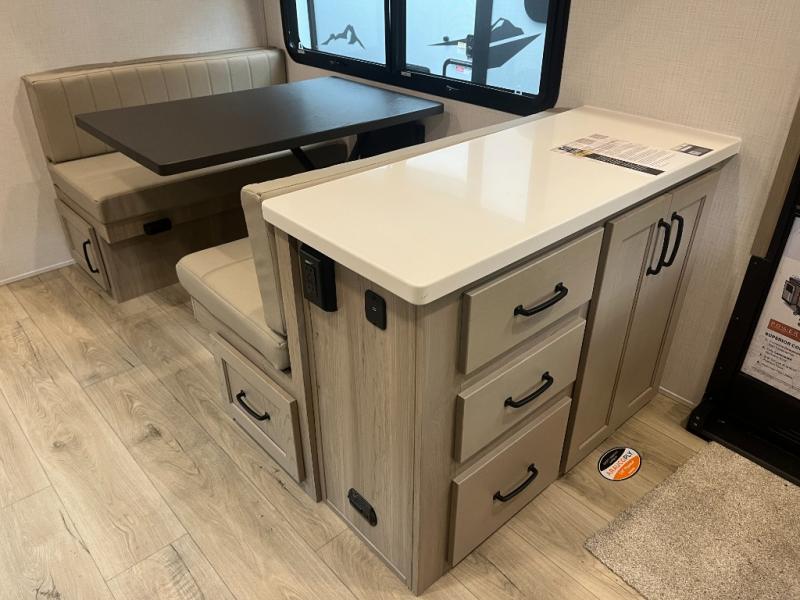 This unit with a theater seat slide will provide added space and comfort! Opposite, you will find a 44" booth dinette for dining indoors, plus overhead storage for your things. The chef of your group will love the rear kitchen with ample counter space plus a pantry and refrigerator for food storage. On the outside, you'll find a large pass-through exterior compartment to bring along camping chairs, along with additional storage space, a 20' awning, and Solid Step entry steps!