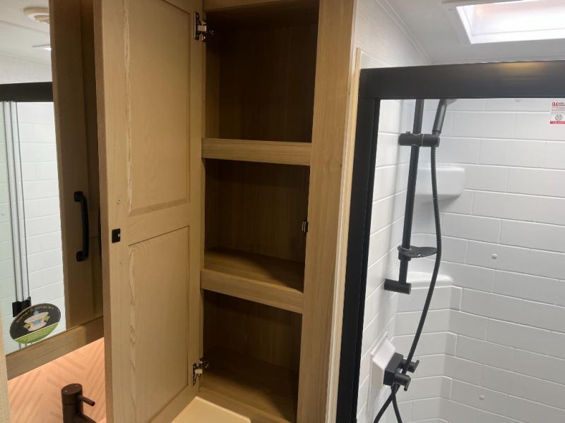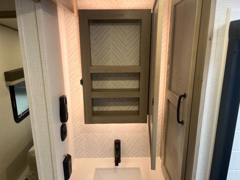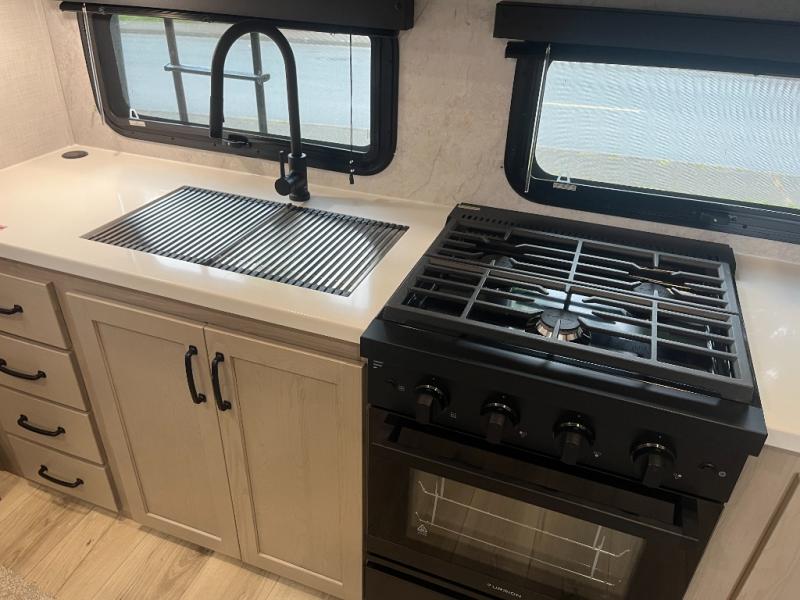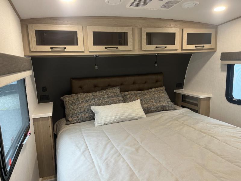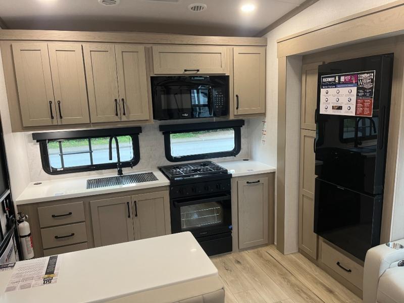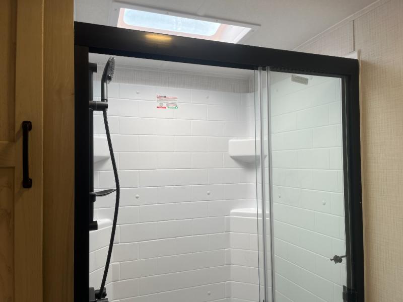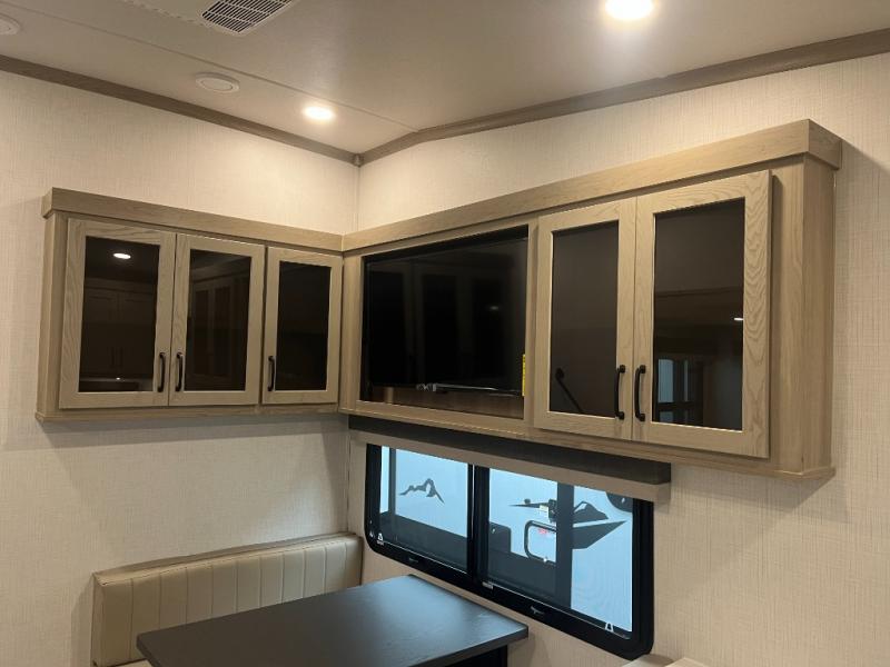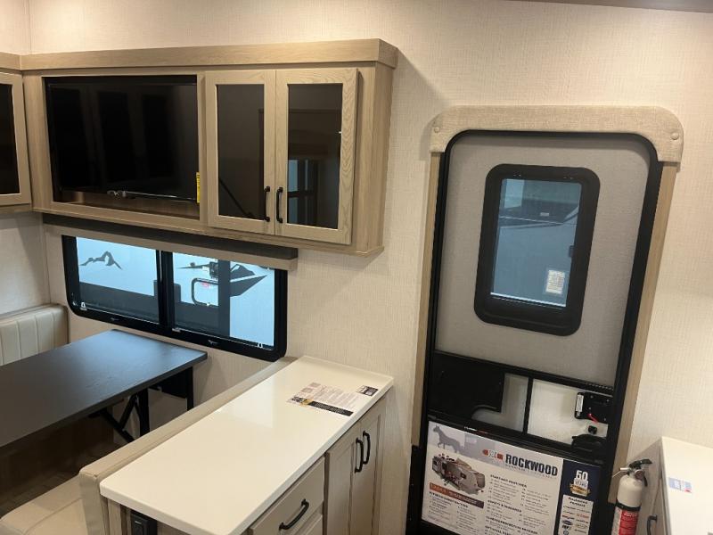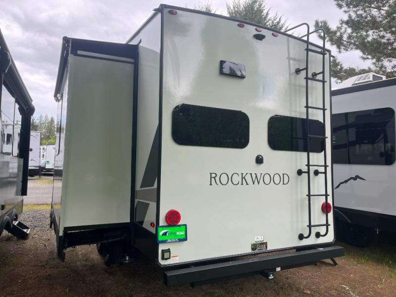 With any Rockwood Signature fifth wheel or travel trailer by Forest River RV, you will enjoy superior construction that includes laminated white fiberglass sidewalls, a radius roof with vaulted interior ceilings, plus radiant foil insulation and an enclosed underbelly for use in all types of weather. Some convenient exterior features include Keyed Alike locks, a rear ladder, a 200W solar panel, and a tire pressure monitor system with a monitor for added safety. The interior offers a One Touch OneControl panel with WeRV app control, for lights, awning, slides, water heater and more, and the Air 360+ omnidirectional antenna with WiFi prep lets you work while away from home if needed. You will also appreciate the interior vaulted ceilings, residential soft close doors and drawers, solid surface kitchen countertops, and designer kitchen backsplash!