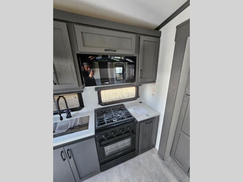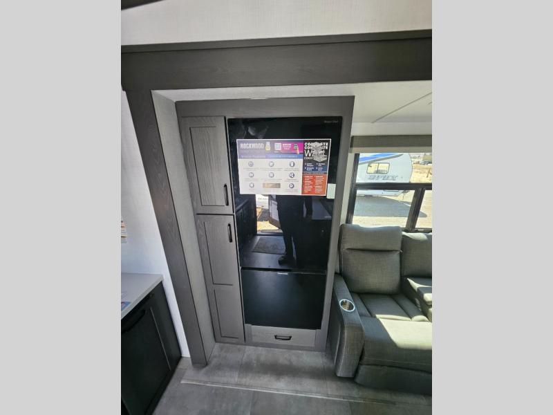 With any Rockwood Signature fifth wheel or travel trailer by Forest River RV, you will enjoy superior construction that includes laminated white fiberglass sidewalls, a radius roof with vaulted interior ceilings, plus radiant foil insulation and an enclosed underbelly for use in all types of weather. Some convenient exterior features include Keyed Alike locks, a rear ladder, a 200W solar panel, and a tire pressure monitor system with a monitor for added safety. The interior offers a One Touch OneControl panel with WeRV app control, for lights, awning, slides, water heater and more, and the Air 360+ omnidirectional antenna with WiFi prep lets you work while away from home if needed. You will also appreciate the interior vaulted ceilings, residential soft close doors and drawers, solid surface kitchen countertops, and designer kitchen backsplash!