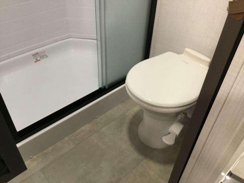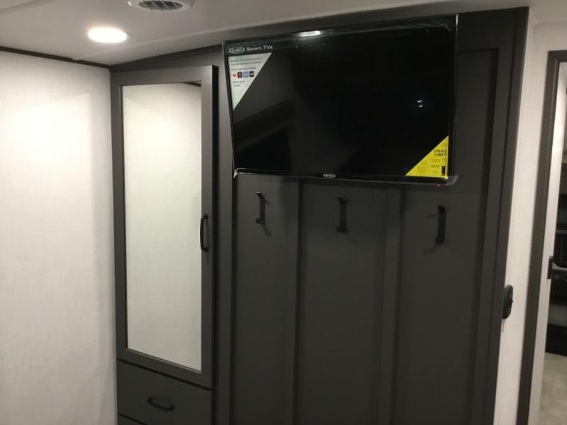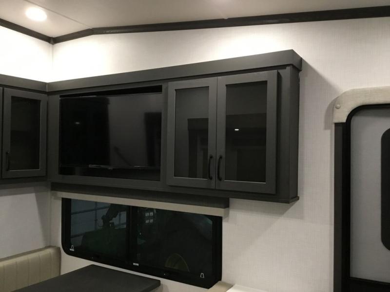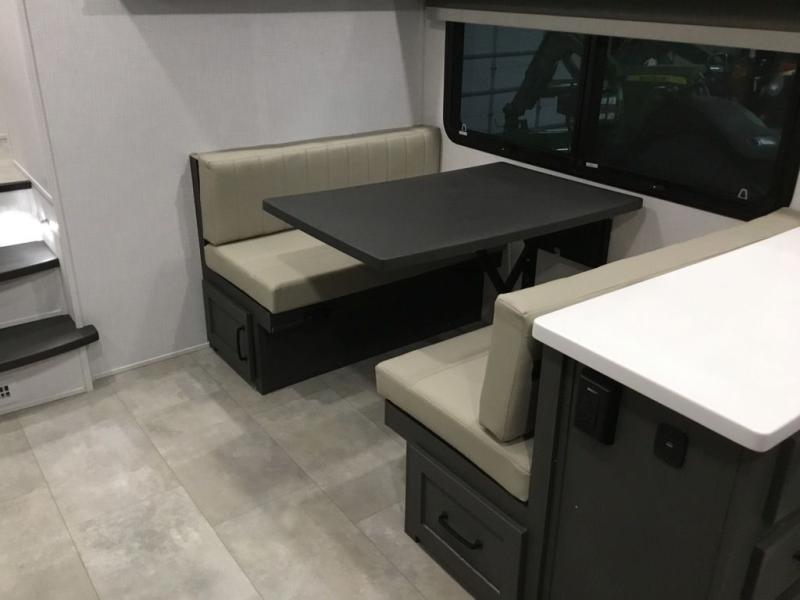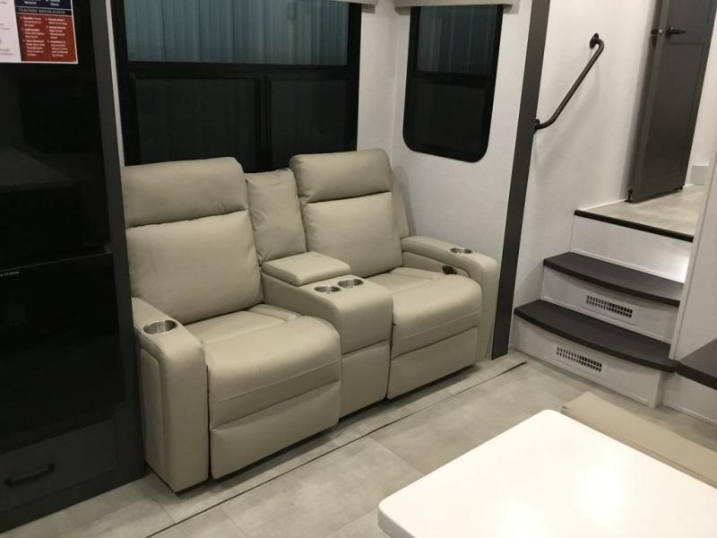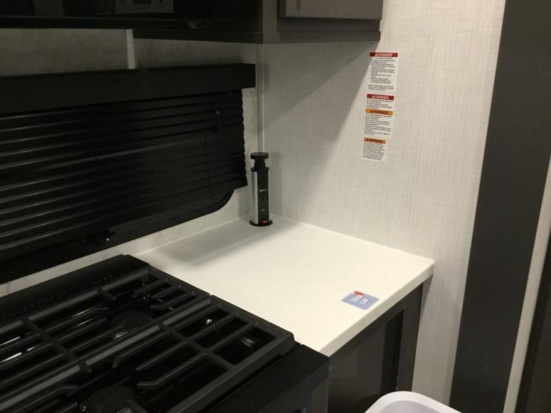 This unit with a theater seat slide will provide added space and comfort! Opposite, you will find a 44" booth dinette for dining indoors, plus overhead storage for your things. The chef of your group will love the rear kitchen with ample counter space plus a pantry and refrigerator for food storage. On the outside, you'll find a large pass-through exterior compartment to bring along camping chairs, along with additional storage space, a 20' awning, and Solid Step entry steps!