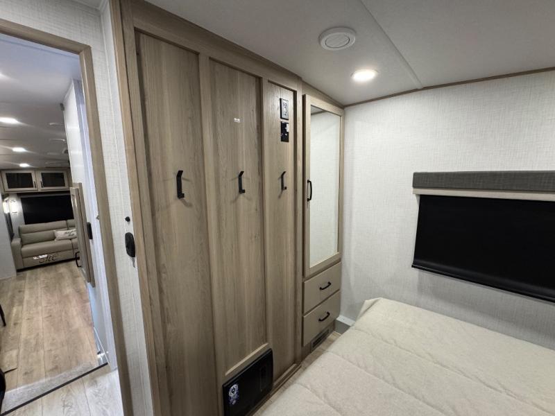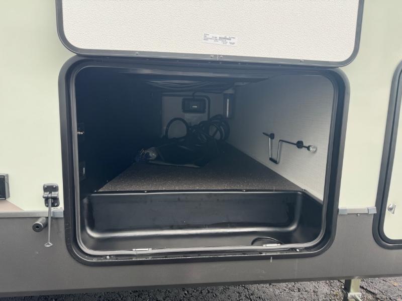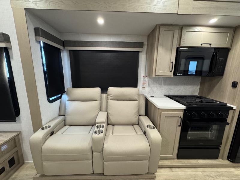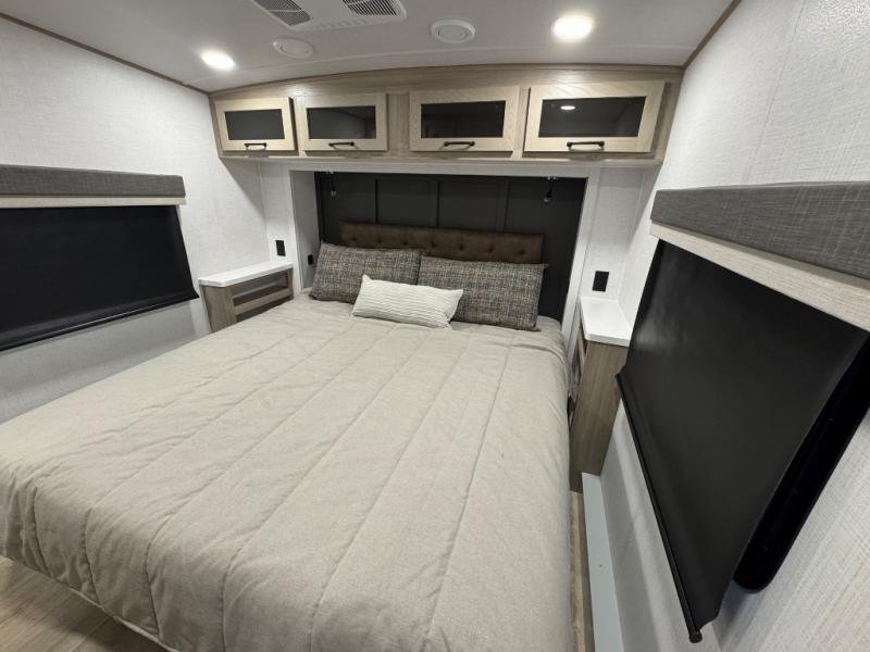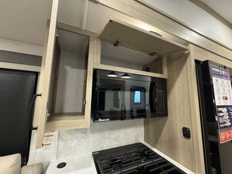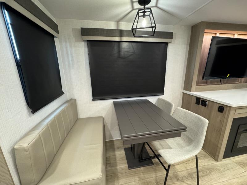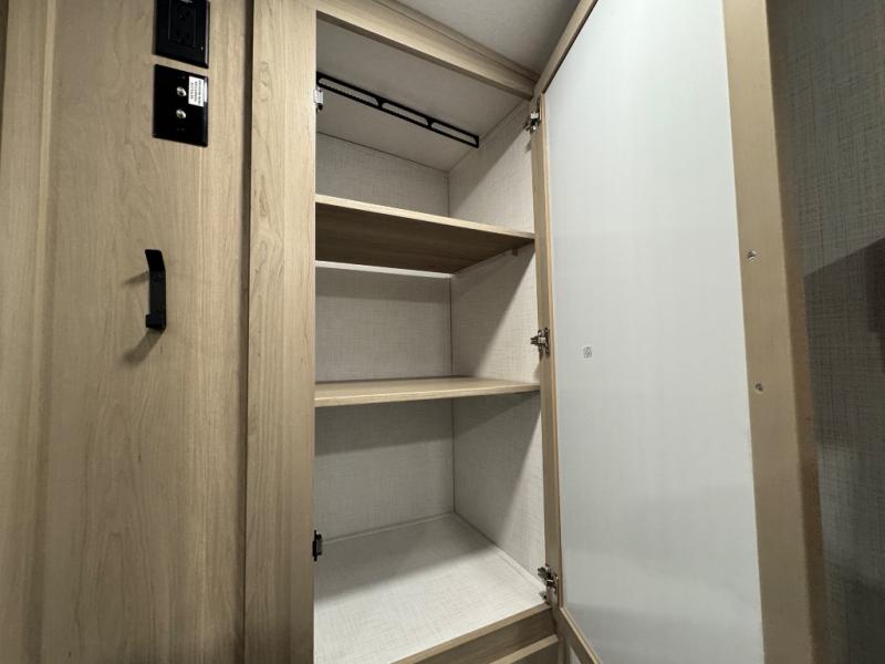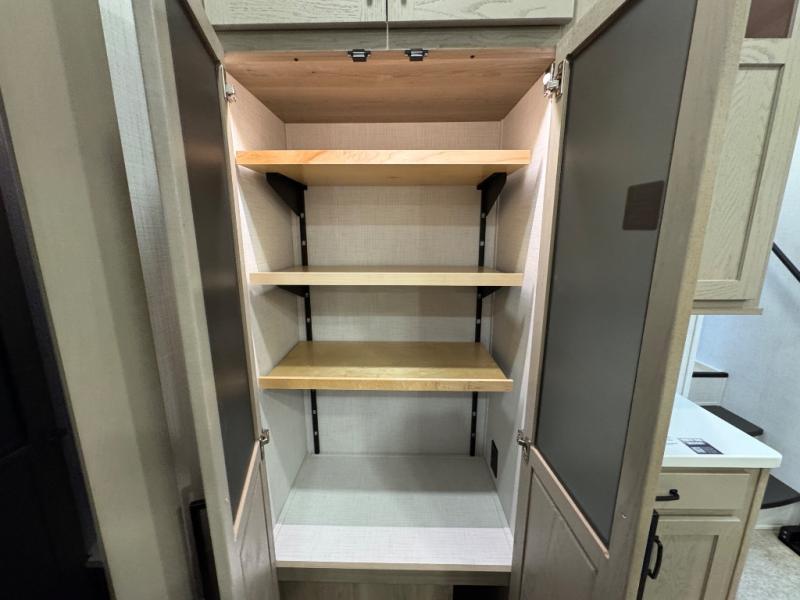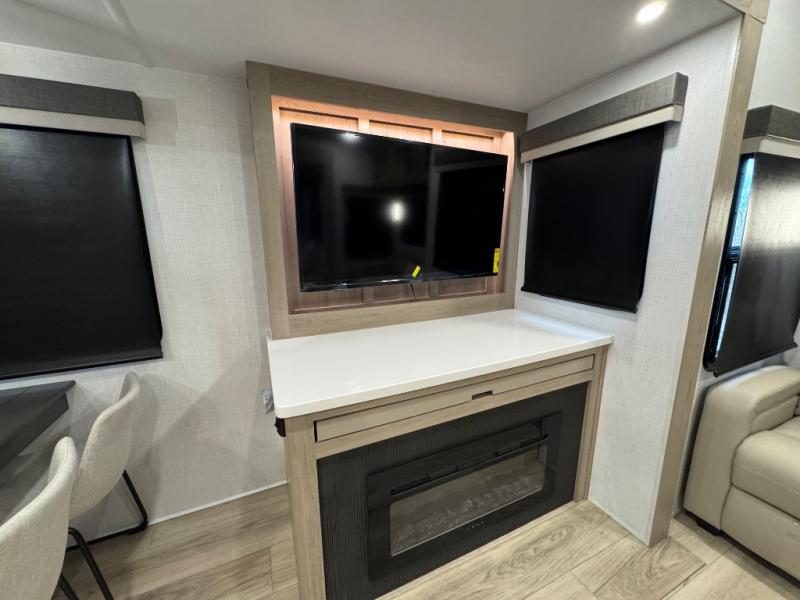 You can enjoy views from inside or outside each day once this RV is set up at the campgrounds! The large windows in the furniture slide and the windows throughout allow you to take in the scenery, and the dual opposing slides give you a spacious main living and kitchen area. You will find lots of seating for guests on the hide-a-bed sofa in the rear, and on the theater seats and table in the slide. The cook will love the 12V refrigerator and large pantry to store food, and everyone can enjoy the Smart TV and fireplace when visiting and relaxing. This unit also includes a pull-out desk which will be perfect if you plan to telecommute. And don't overlook the front private bedroom with its queen bed, wardrobe, and TV option!