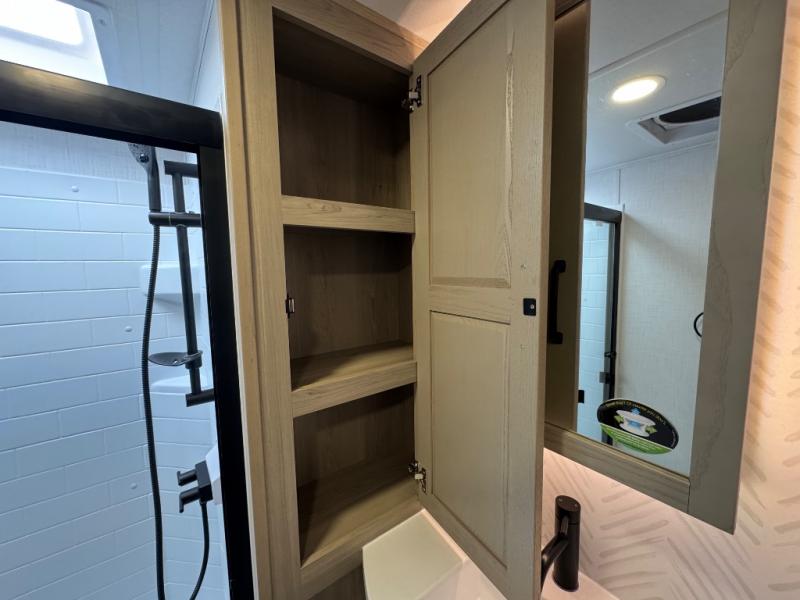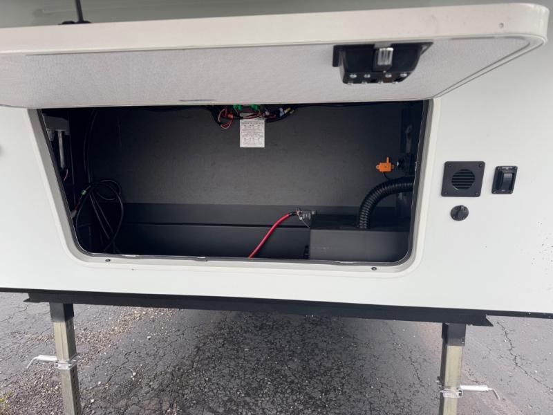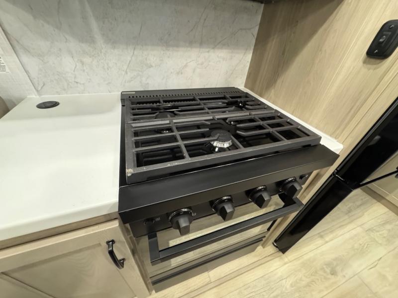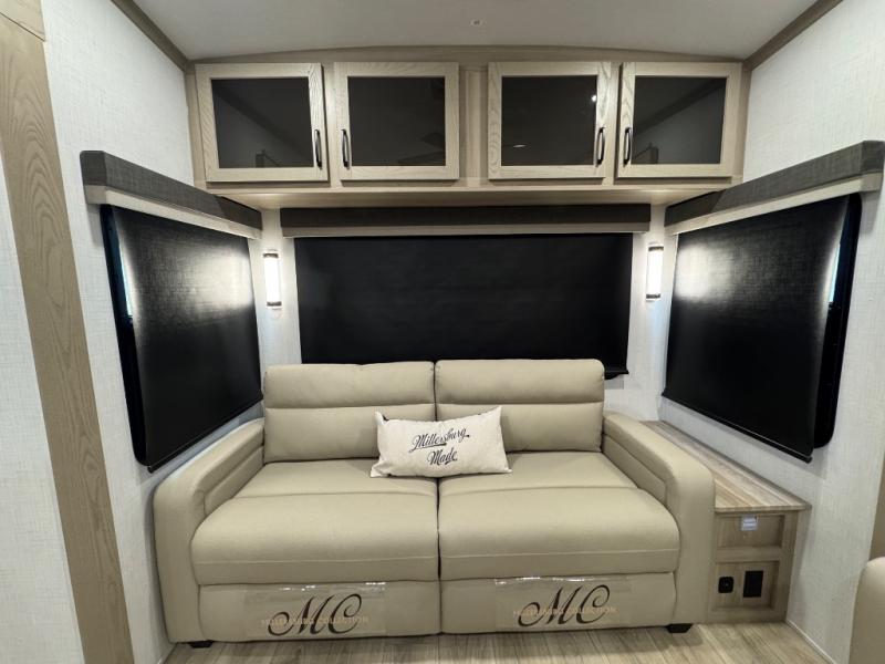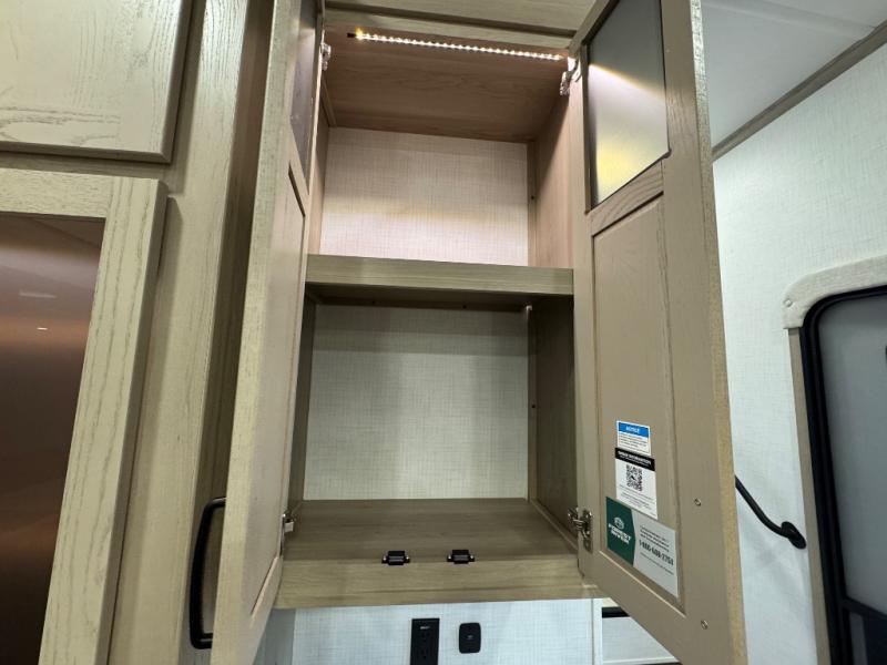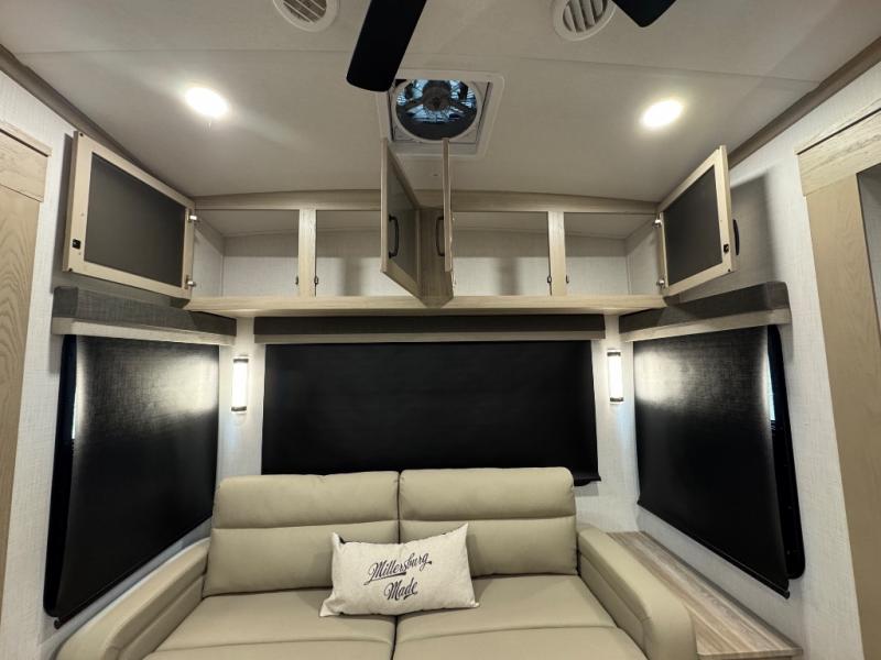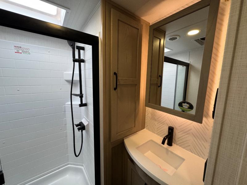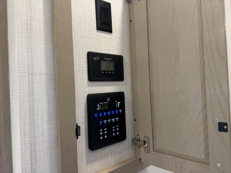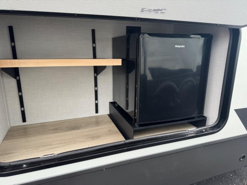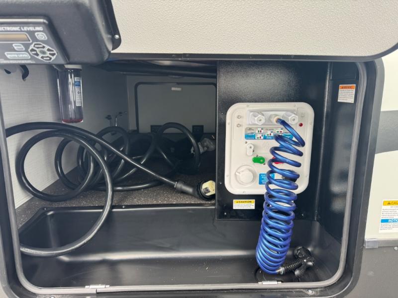 You can enjoy views from inside or outside each day once this RV is set up at the campgrounds! The large windows in the furniture slide and the windows throughout allow you to take in the scenery, and the dual opposing slides give you a spacious main living and kitchen area. You will find lots of seating for guests on the hide-a-bed sofa in the rear, and on the theater seats and table in the slide. The cook will love the 12V refrigerator and large pantry to store food, and everyone can enjoy the Smart TV and fireplace when visiting and relaxing. This unit also includes a pull-out desk which will be perfect if you plan to telecommute. And don't overlook the front private bedroom with its queen bed, wardrobe, and TV option!