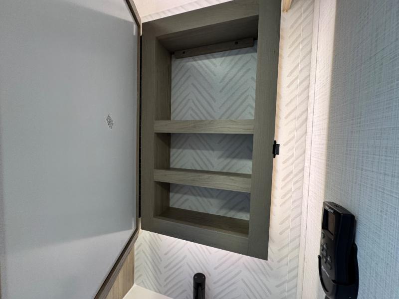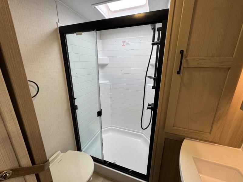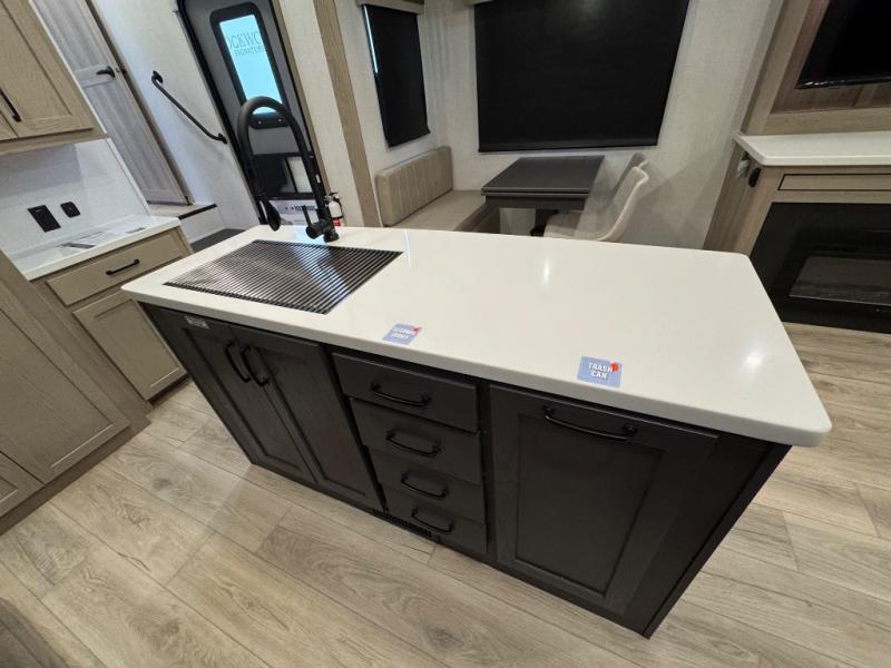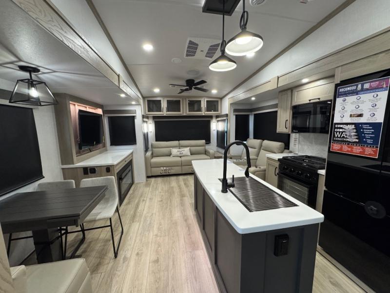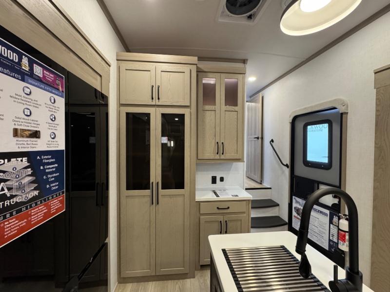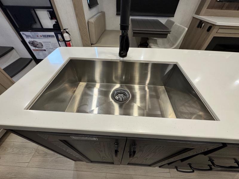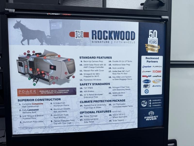 With any Rockwood Signature fifth wheel or travel trailer by Forest River RV, you will enjoy superior construction that includes laminated white fiberglass sidewalls, a radius roof with vaulted interior ceilings, plus radiant foil insulation and an enclosed underbelly for use in all types of weather. Some convenient exterior features include Keyed Alike locks, a rear ladder, a 200W solar panel, and a tire pressure monitor system with a monitor for added safety. The interior offers a One Touch OneControl panel with WeRV app control, for lights, awning, slides, water heater and more, and the Air 360+ omnidirectional antenna with WiFi prep lets you work while away from home if needed. You will also appreciate the interior vaulted ceilings, residential soft close doors and drawers, solid surface kitchen countertops, and designer kitchen backsplash!