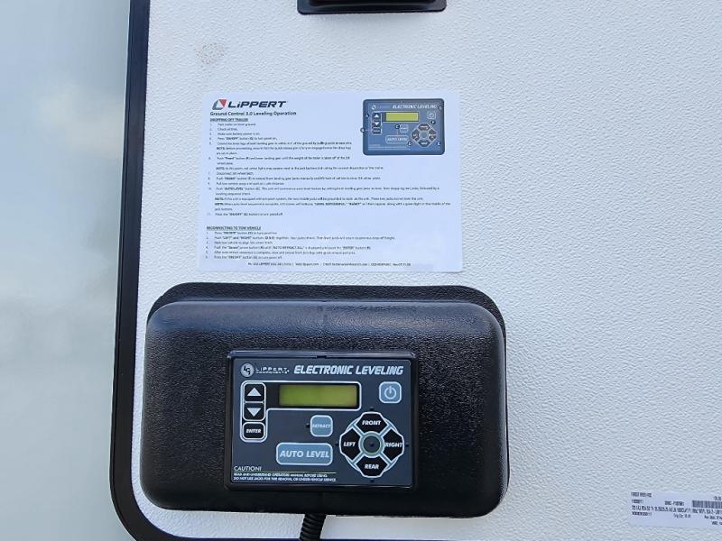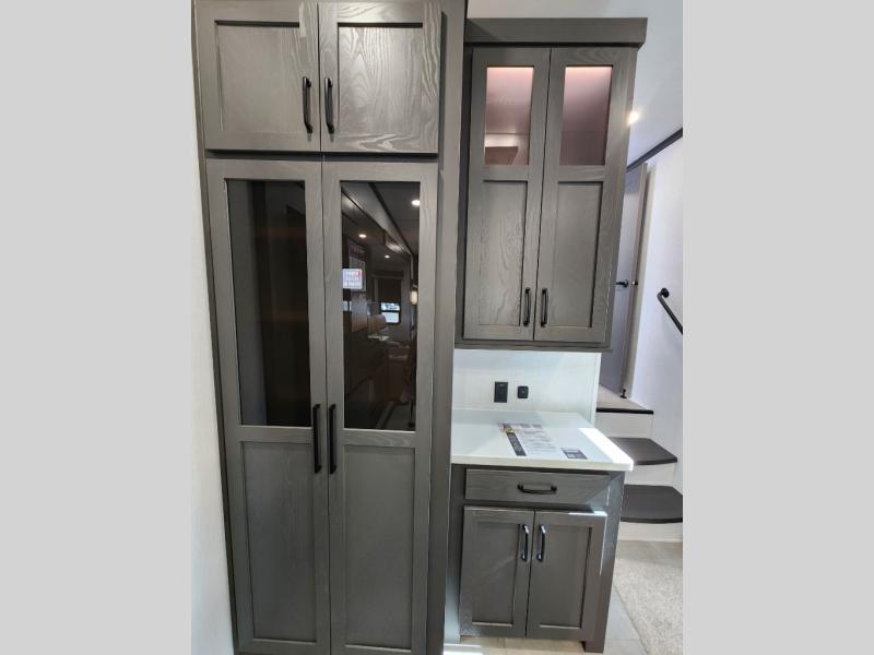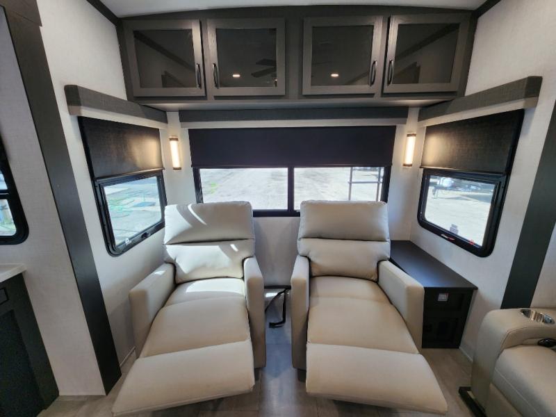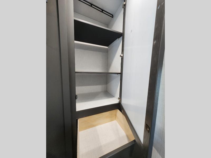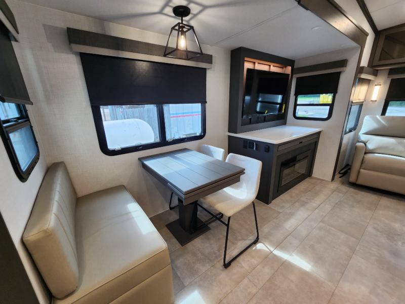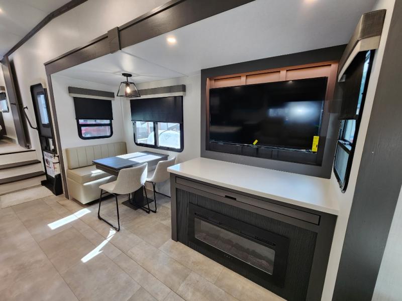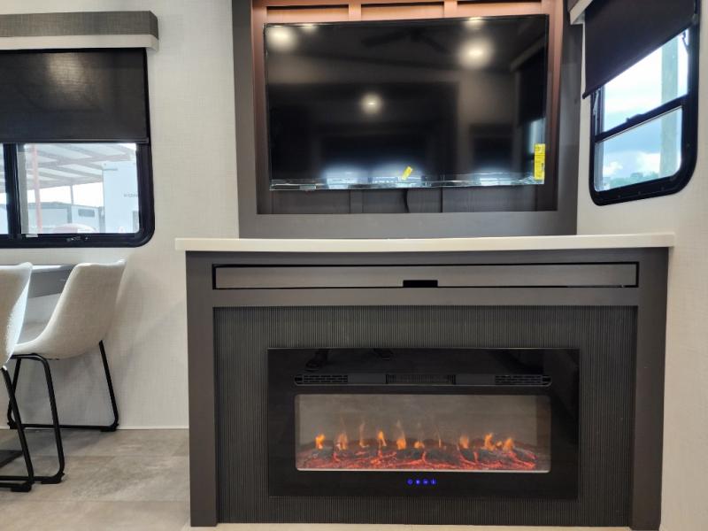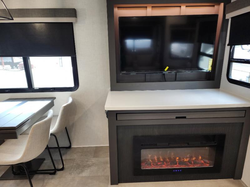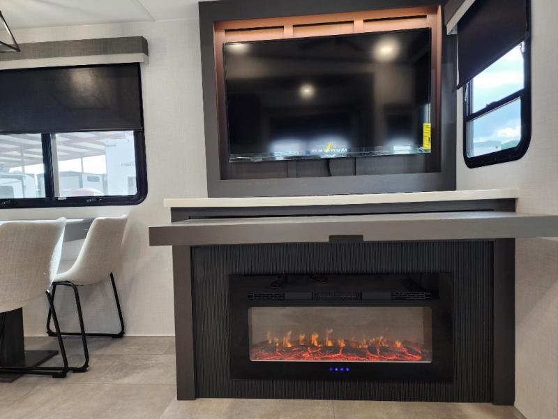 You can enjoy views from inside or outside each day once this RV is set up at the campgrounds! The large windows in the furniture slide and the windows throughout allow you to take in the scenery, and the dual opposing slides give you a spacious main living and kitchen area. You will find lots of seating for guests on the hide-a-bed sofa in the rear, and on the theater seats and table in the slide. The cook will love the 12V refrigerator and large pantry to store food, and everyone can enjoy the Smart TV and fireplace when visiting and relaxing. This unit also includes a pull-out desk which will be perfect if you plan to telecommute. And don't overlook the front private bedroom with its queen bed, wardrobe, and TV option!