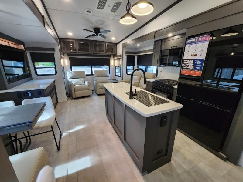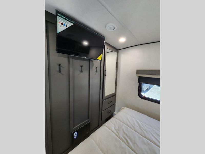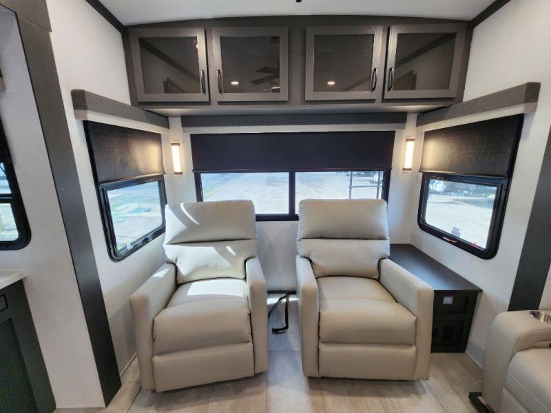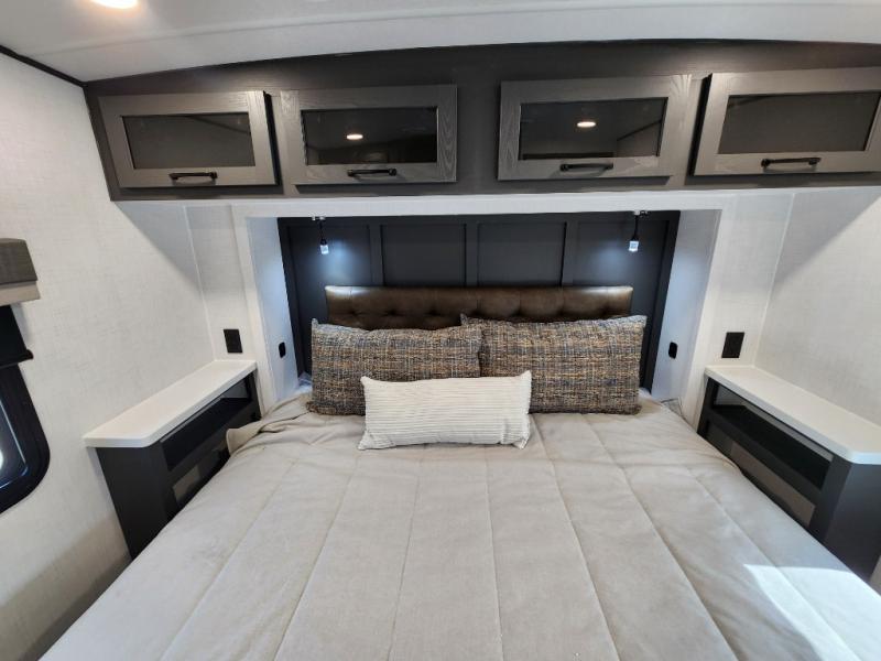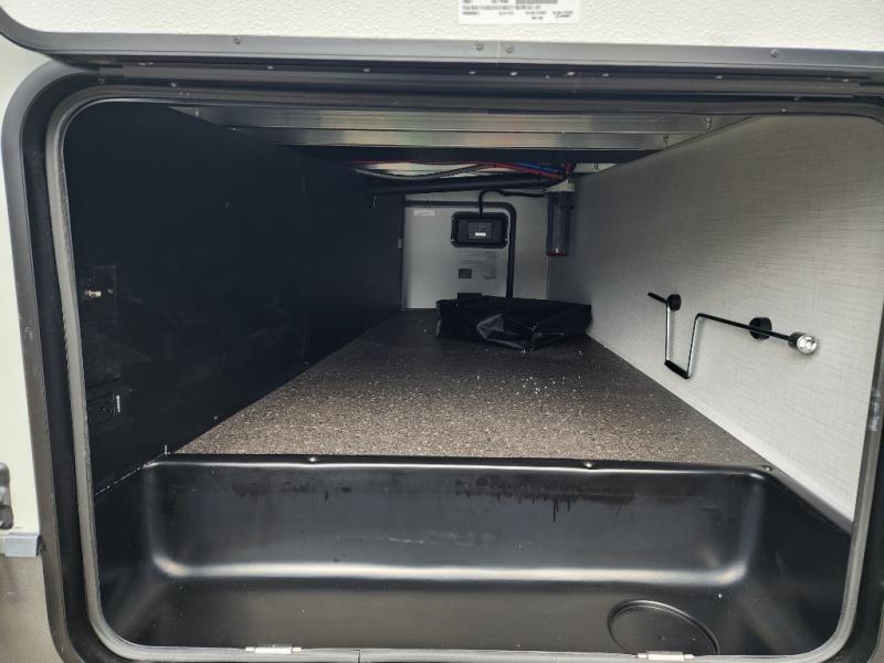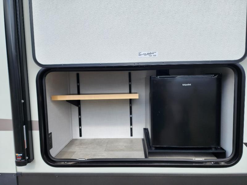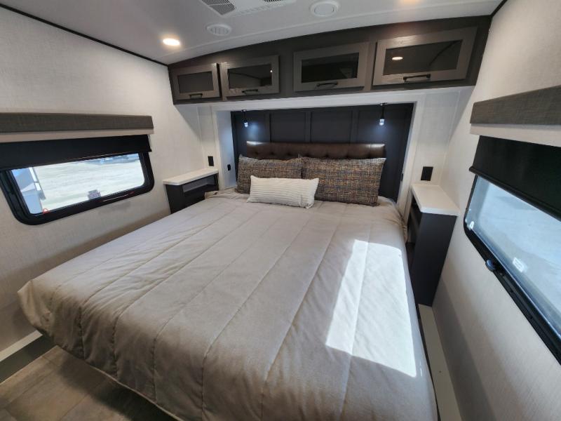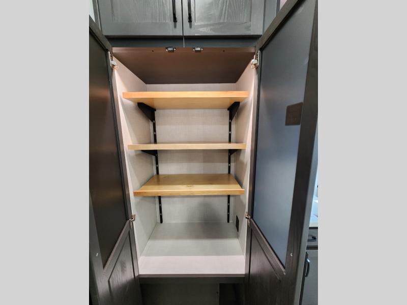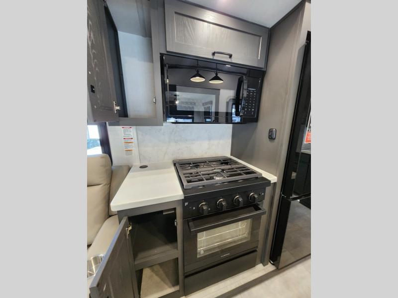 You can enjoy views from inside or outside each day once this RV is set up at the campgrounds! The large windows in the furniture slide and the windows throughout allow you to take in the scenery, and the dual opposing slides give you a spacious main living and kitchen area. You will find lots of seating for guests on the hide-a-bed sofa in the rear, and on the theater seats and table in the slide. The cook will love the 12V refrigerator and large pantry to store food, and everyone can enjoy the Smart TV and fireplace when visiting and relaxing. This unit also includes a pull-out desk which will be perfect if you plan to telecommute. And don't overlook the front private bedroom with its queen bed, wardrobe, and TV option!