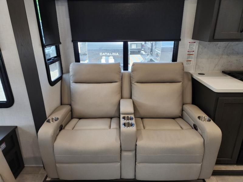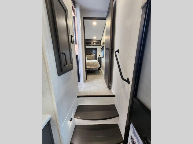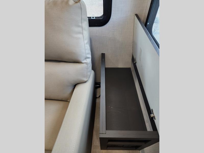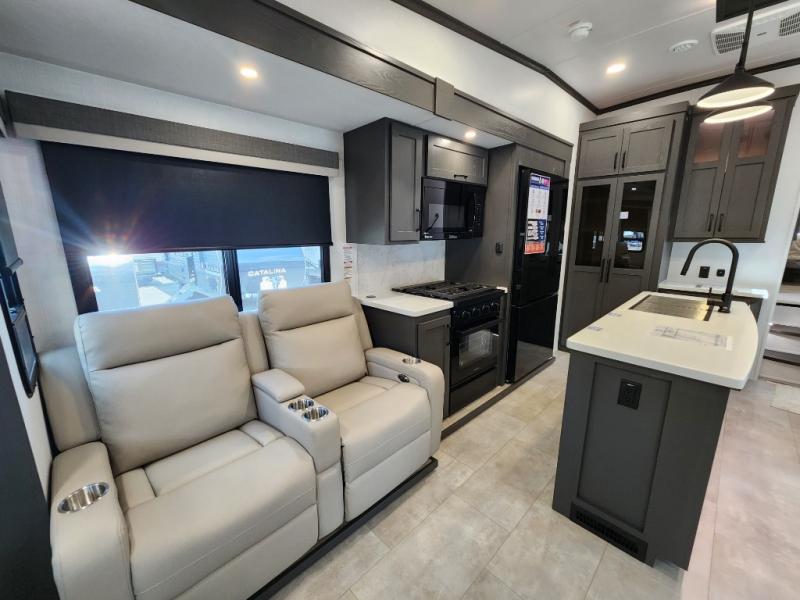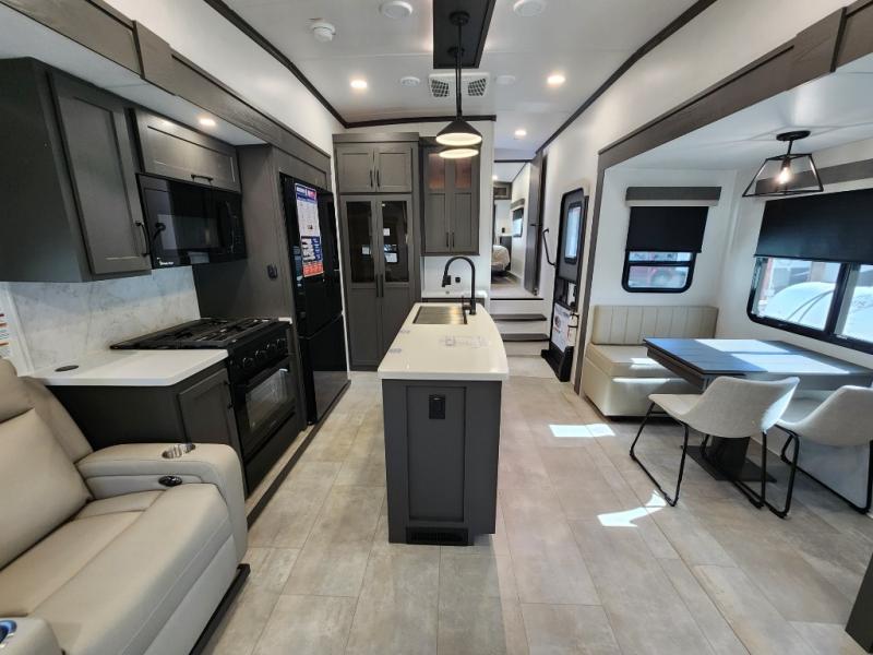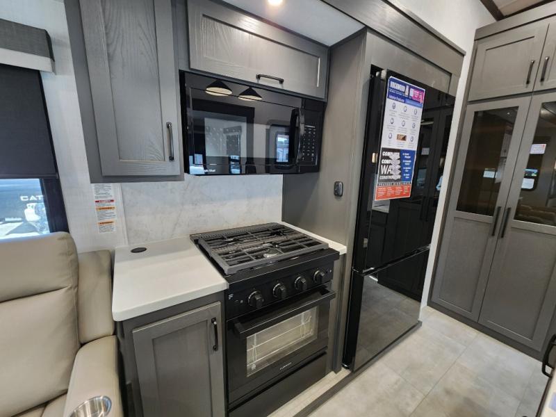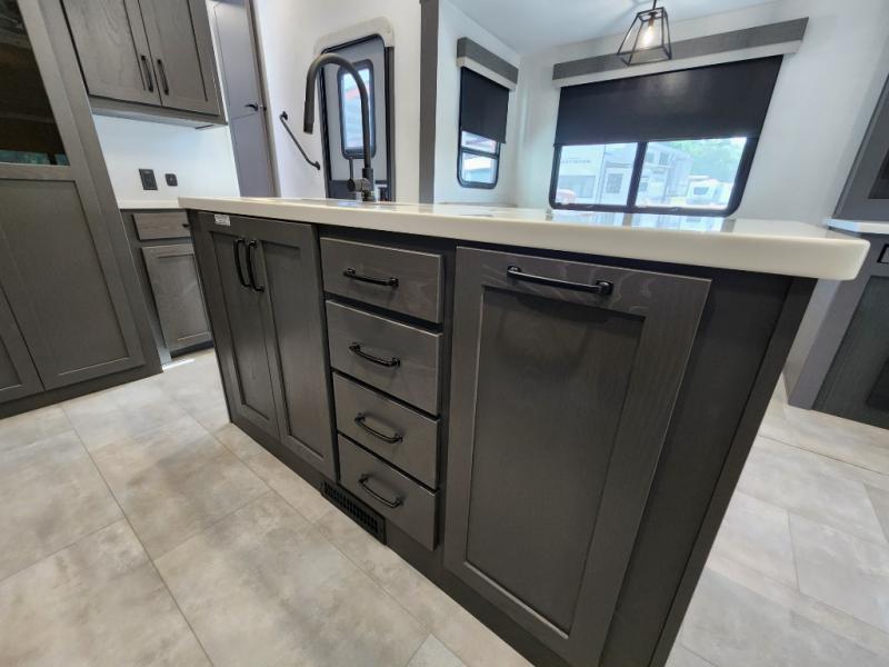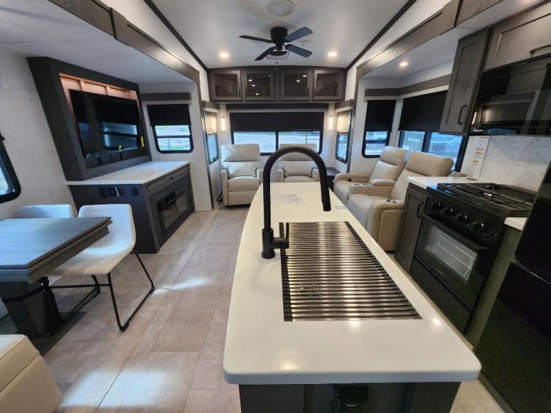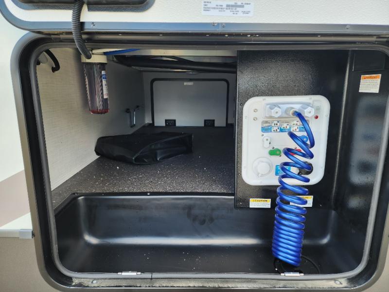 You can enjoy views from inside or outside each day once this RV is set up at the campgrounds! The large windows in the furniture slide and the windows throughout allow you to take in the scenery, and the dual opposing slides give you a spacious main living and kitchen area. You will find lots of seating for guests on the hide-a-bed sofa in the rear, and on the theater seats and table in the slide. The cook will love the 12V refrigerator and large pantry to store food, and everyone can enjoy the Smart TV and fireplace when visiting and relaxing. This unit also includes a pull-out desk which will be perfect if you plan to telecommute. And don't overlook the front private bedroom with its queen bed, wardrobe, and TV option!