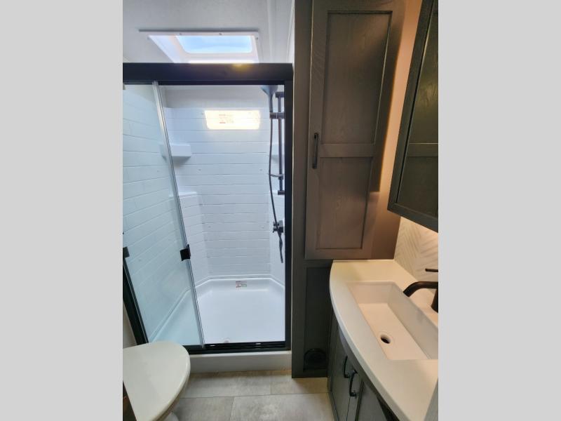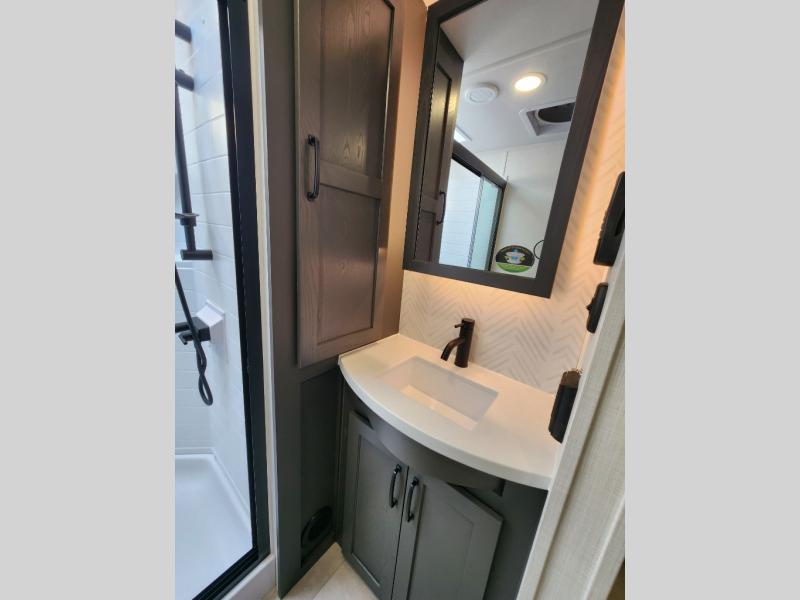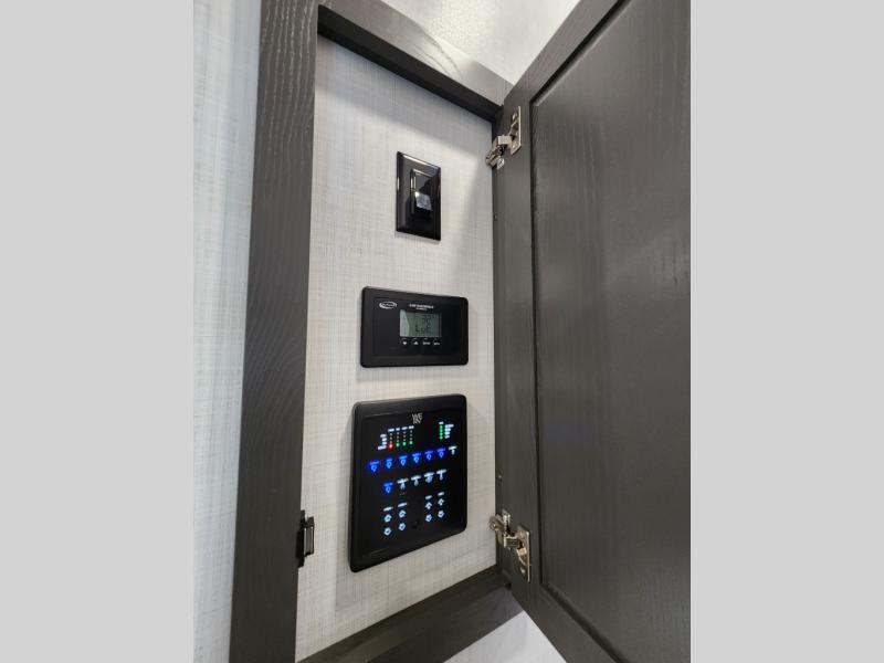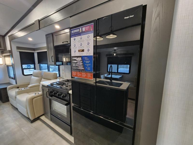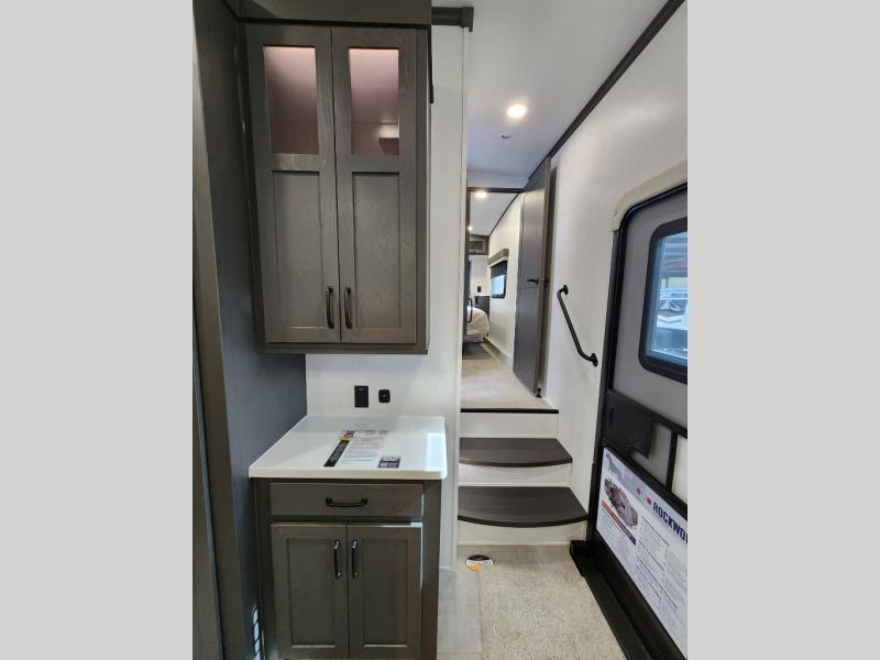 With any Rockwood Signature fifth wheel or travel trailer by Forest River RV, you will enjoy superior construction that includes laminated white fiberglass sidewalls, a radius roof with vaulted interior ceilings, plus radiant foil insulation and an enclosed underbelly for use in all types of weather. Some convenient exterior features include Keyed Alike locks, a rear ladder, a 200W solar panel, and a tire pressure monitor system with a monitor for added safety. The interior offers a One Touch OneControl panel with WeRV app control, for lights, awning, slides, water heater and more, and the Air 360+ omnidirectional antenna with WiFi prep lets you work while away from home if needed. You will also appreciate the interior vaulted ceilings, residential soft close doors and drawers, solid surface kitchen countertops, and designer kitchen backsplash!