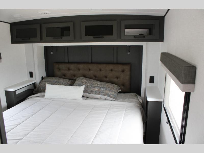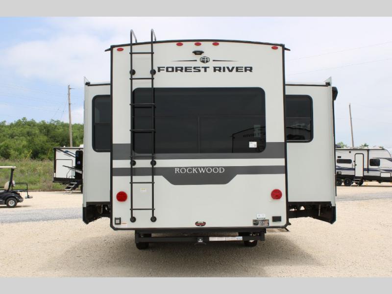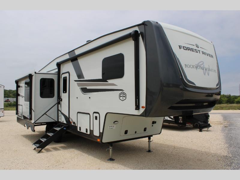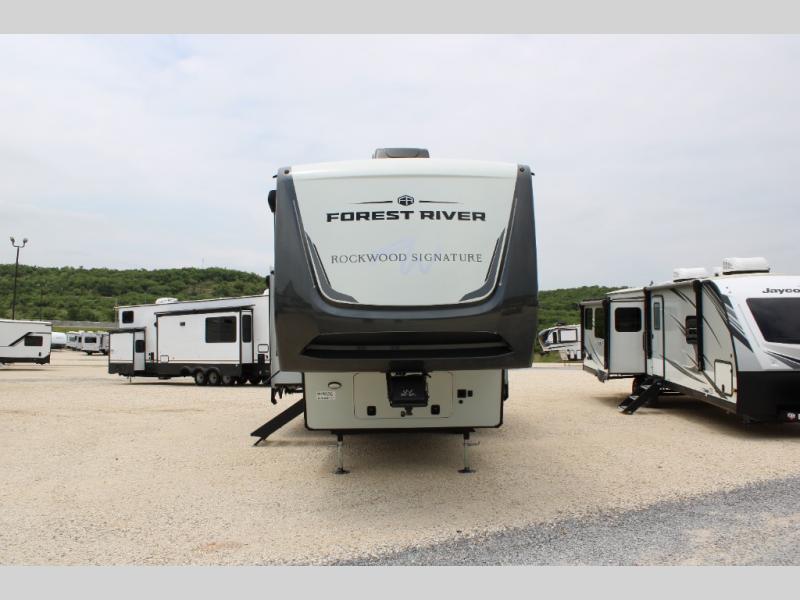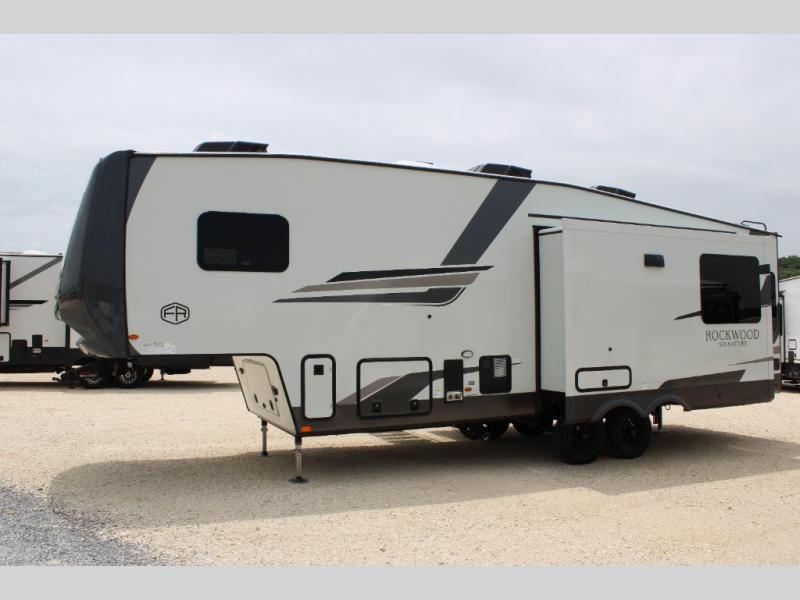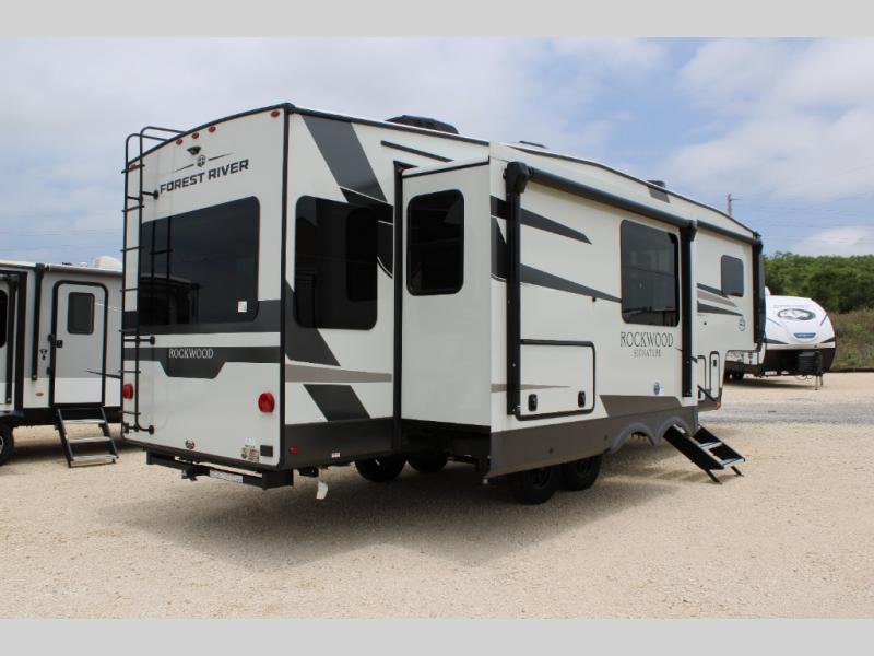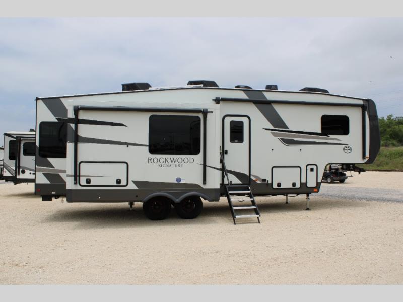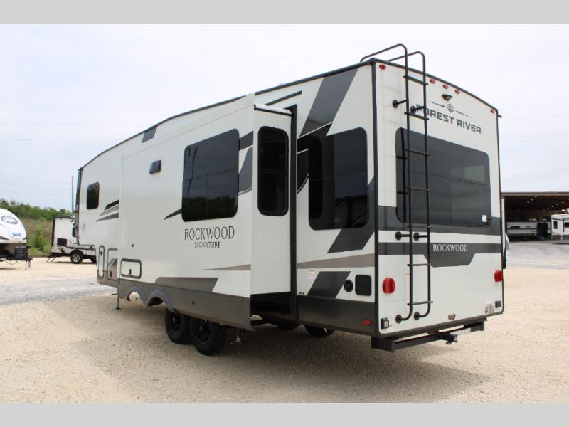 With any Rockwood Signature fifth wheel or travel trailer by Forest River RV, you will enjoy superior construction that includes laminated white fiberglass sidewalls, a radius roof with vaulted interior ceilings, plus radiant foil insulation and an enclosed underbelly for use in all types of weather. Some convenient exterior features include Keyed Alike locks, a rear ladder, a 200W solar panel, and a tire pressure monitor system with a monitor for added safety. The interior offers a One Touch OneControl panel with WeRV app control, for lights, awning, slides, water heater and more, and the Air 360+ omnidirectional antenna with WiFi prep lets you work while away from home if needed. You will also appreciate the interior vaulted ceilings, residential soft close doors and drawers, solid surface kitchen countertops, and designer kitchen backsplash!