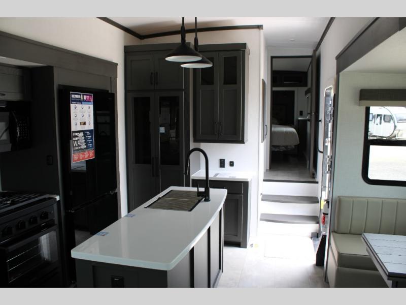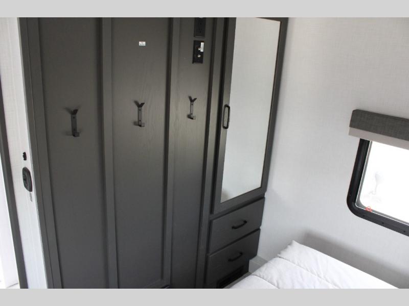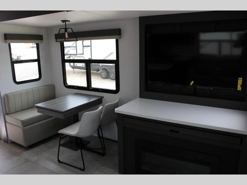 You can enjoy views from inside or outside each day once this RV is set up at the campgrounds! The large windows in the furniture slide and the windows throughout allow you to take in the scenery, and the dual opposing slides give you a spacious main living and kitchen area. You will find lots of seating for guests on the hide-a-bed sofa in the rear, and on the theater seats and table in the slide. The cook will love the 12V refrigerator and large pantry to store food, and everyone can enjoy the Smart TV and fireplace when visiting and relaxing. This unit also includes a pull-out desk which will be perfect if you plan to telecommute. And don't overlook the front private bedroom with its queen bed, wardrobe, and TV option!