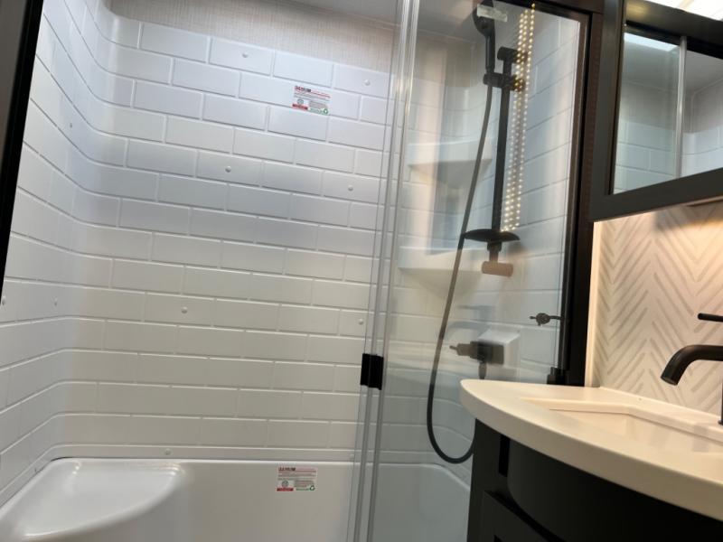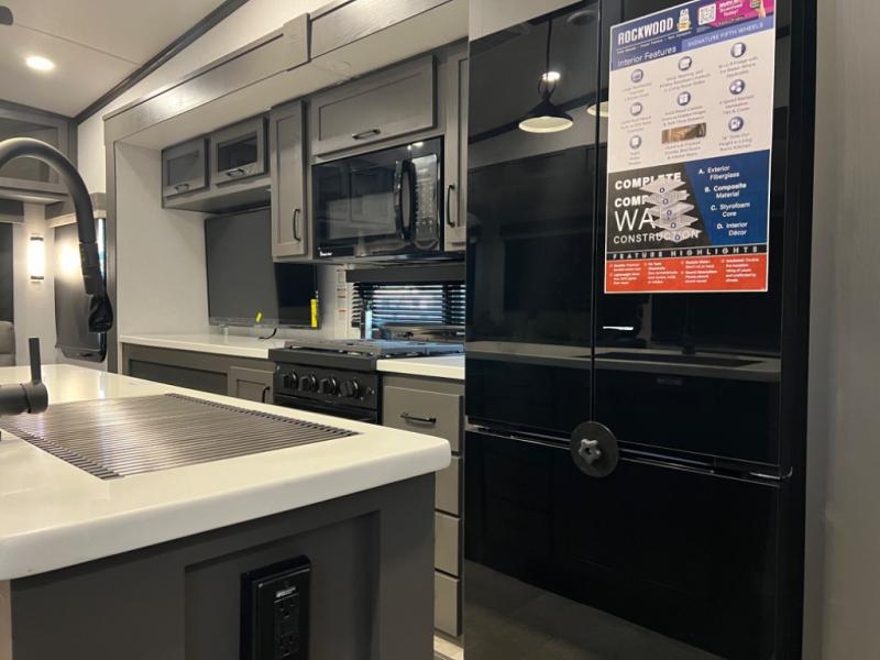 With any Rockwood Signature fifth wheel or travel trailer by Forest River RV, you will enjoy superior construction that includes laminated white fiberglass sidewalls, a radius roof with vaulted interior ceilings, plus radiant foil insulation and an enclosed underbelly for use in all types of weather. Some convenient exterior features include Keyed Alike locks, a rear ladder, a 200W solar panel, and a tire pressure monitor system with a monitor for added safety. The interior offers a One Touch OneControl panel with WeRV app control, for lights, awning, slides, water heater and more, and the Air 360+ omnidirectional antenna with WiFi prep lets you work while away from home if needed. You will also appreciate the interior vaulted ceilings, residential soft close doors and drawers, solid surface kitchen countertops, and designer kitchen backsplash!