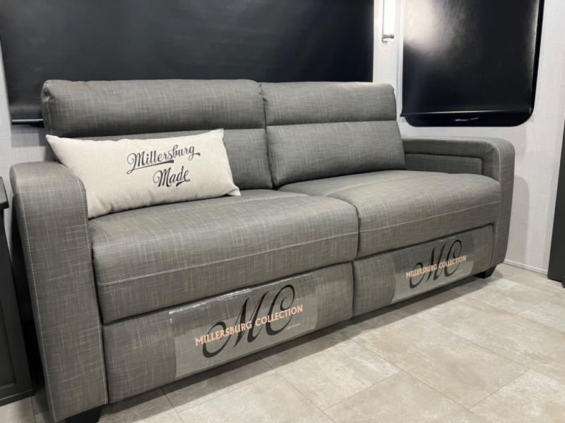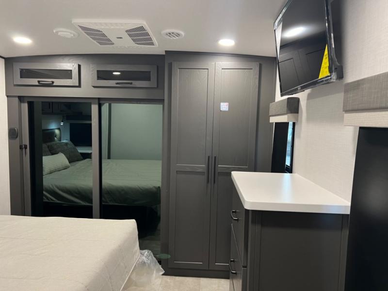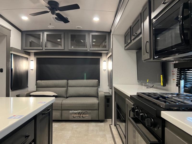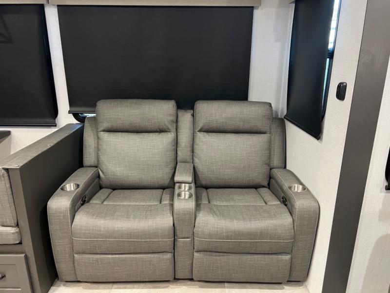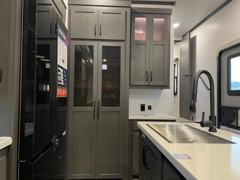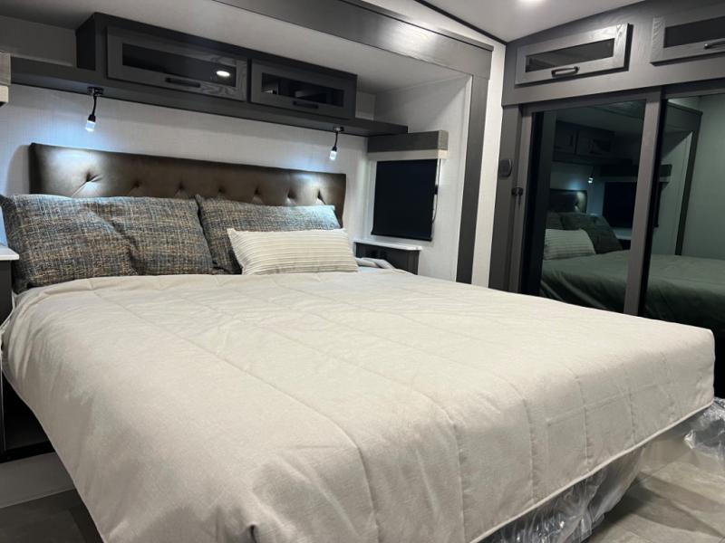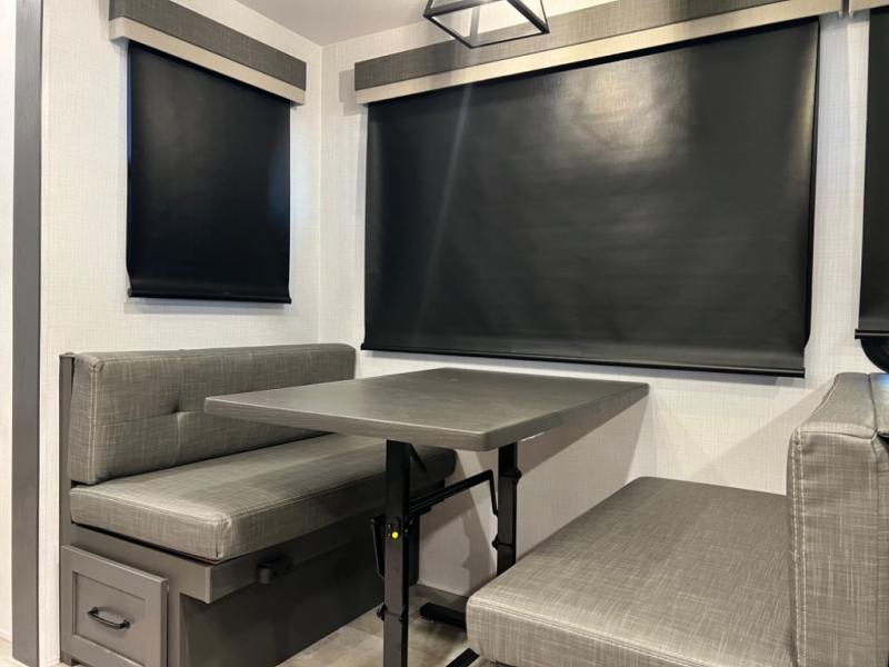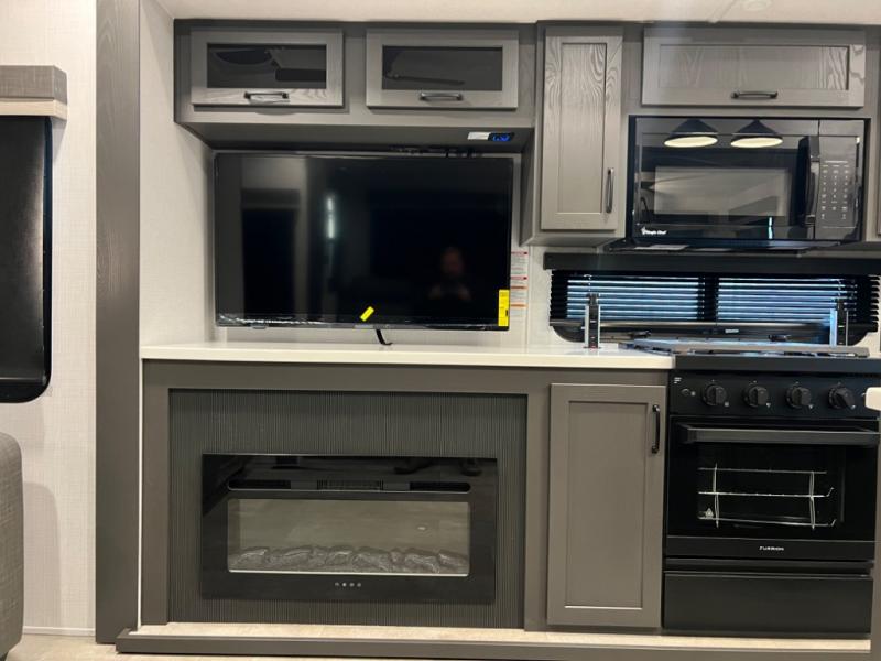 You can enjoy views from inside or outside each day once this RV is set up at the campgrounds! The large windows in the furniture slide and the windows throughout allow you to take in the scenery, and the three slide outs give you a spacious main living and kitchen area as well as front bedroom. You will find lots of seating for guests on the hide-a-bed sofa in the rear, and on the theater seats and booth dinette in the slide. The cook will love the 12V refrigerator and large pantry to store food, and everyone can enjoy the Smart TV and fireplace when visiting and relaxing. The front bedroom offers a king bed slide, a front wardrobe, plus washer and dryer prep if you choose to add those appliances.