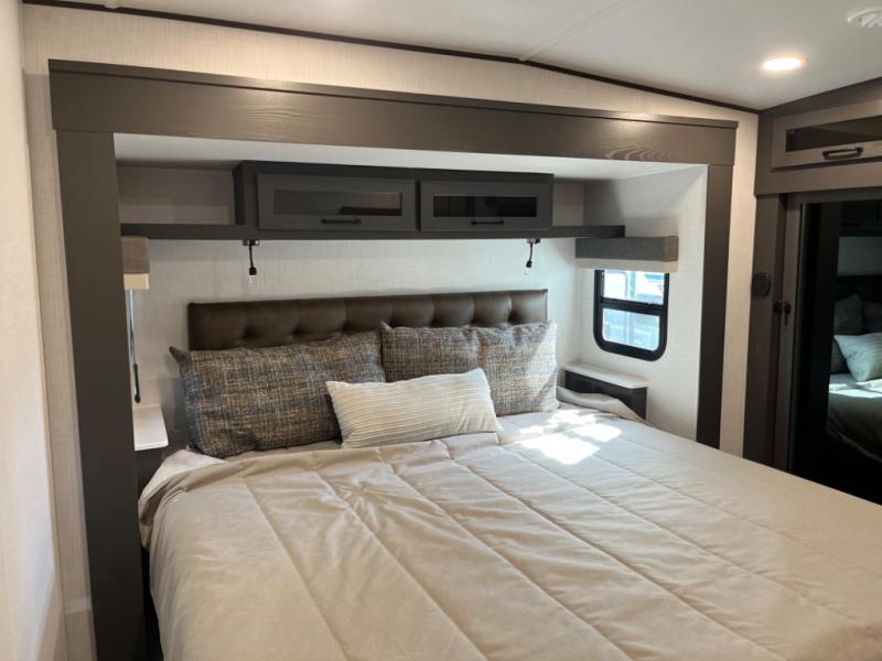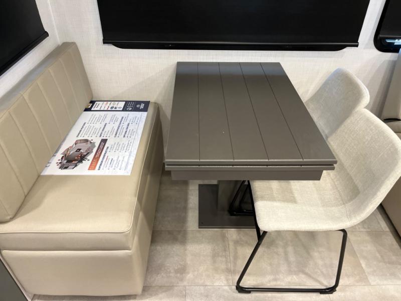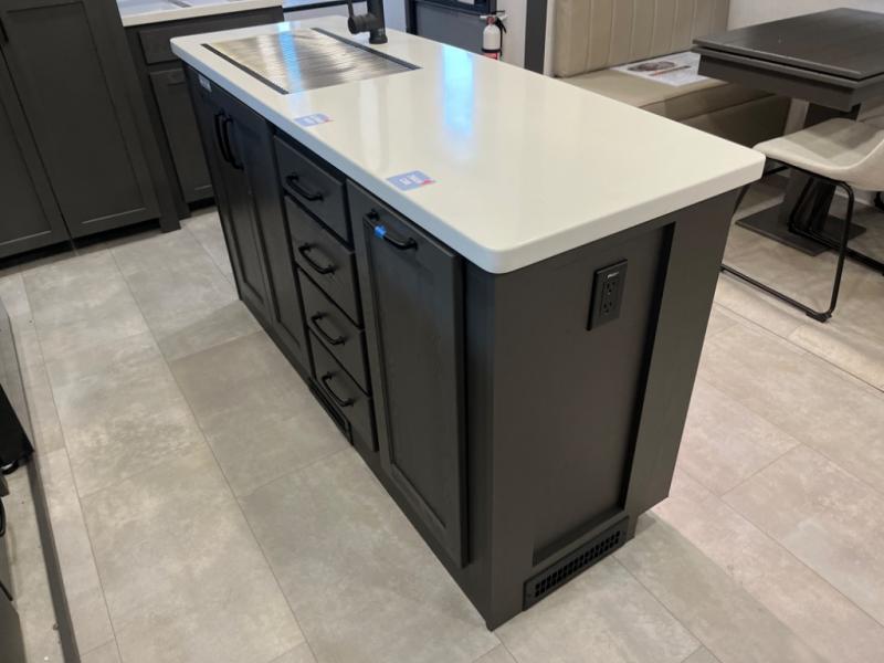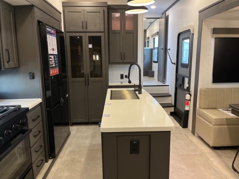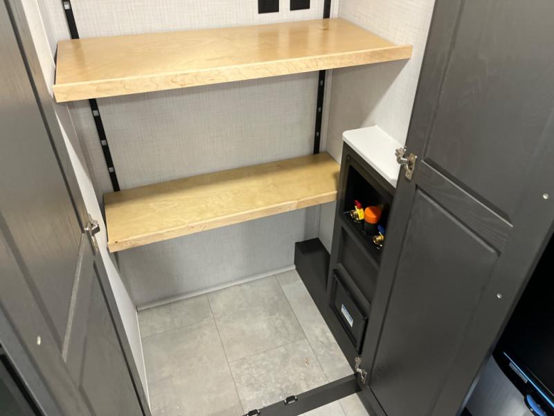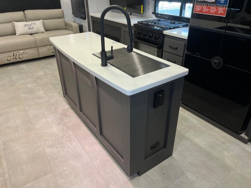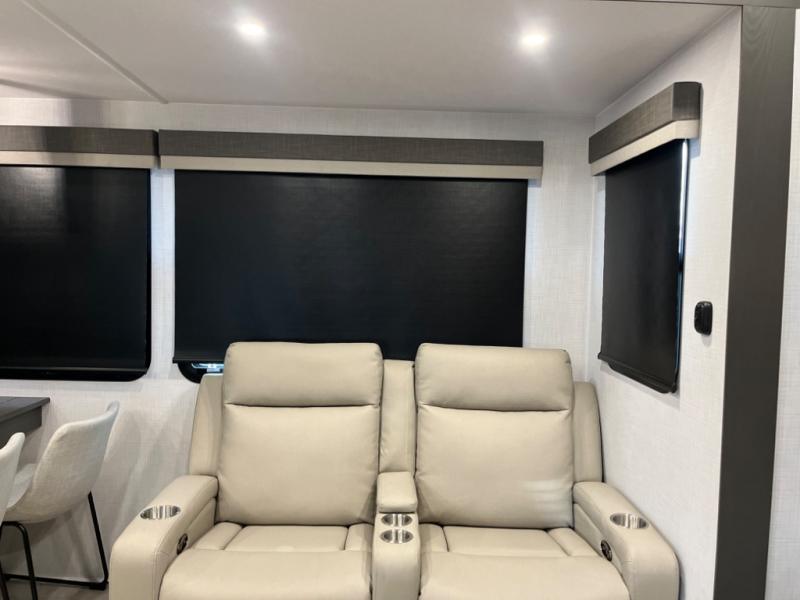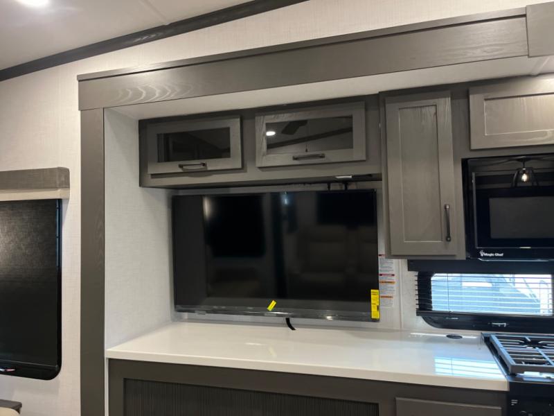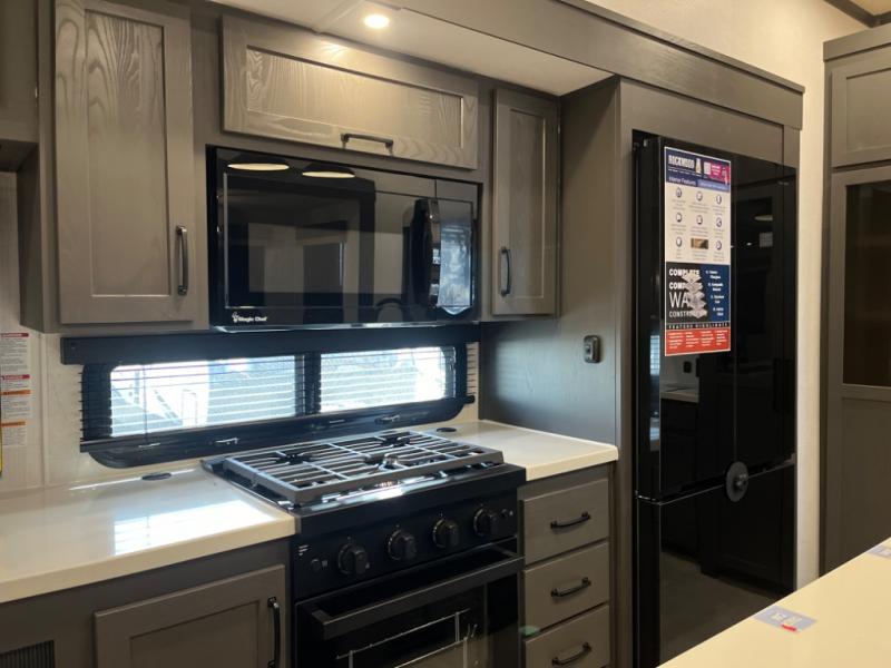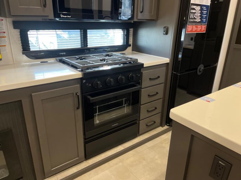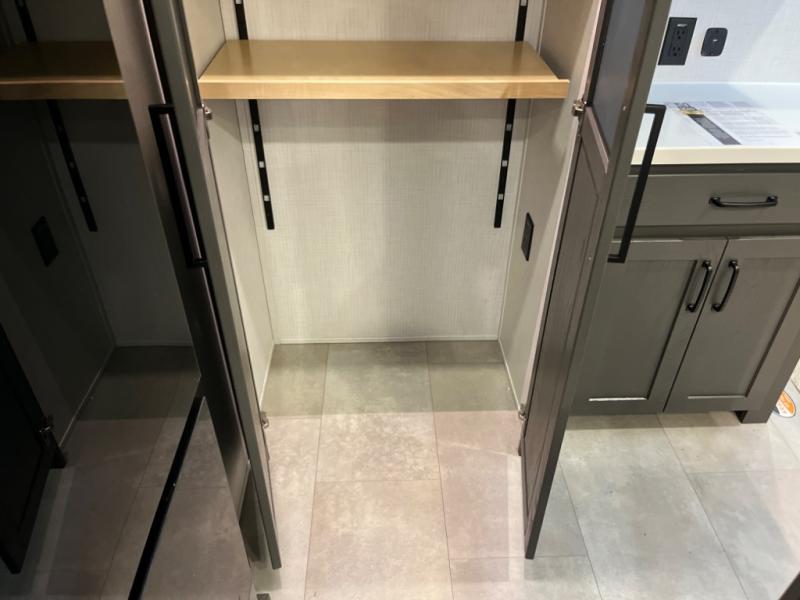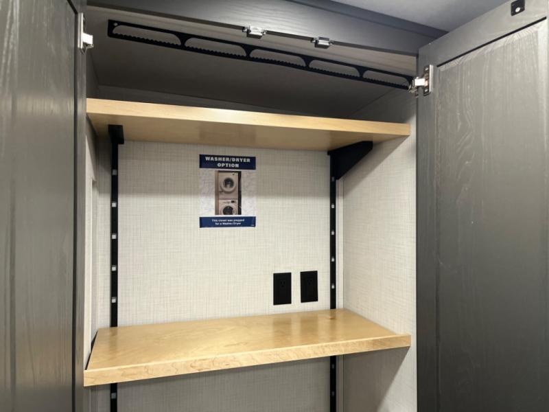 You can enjoy views from inside or outside each day once this RV is set up at the campgrounds! The large windows in the furniture slide and the windows throughout allow you to take in the scenery, and the three slide outs give you a spacious main living and kitchen area as well as front bedroom. You will find lots of seating for guests on the hide-a-bed sofa in the rear, and on the theater seats and booth dinette in the slide. The cook will love the 12V refrigerator and large pantry to store food, and everyone can enjoy the Smart TV and fireplace when visiting and relaxing. The front bedroom offers a king bed slide, a front wardrobe, plus washer and dryer prep if you choose to add those appliances.