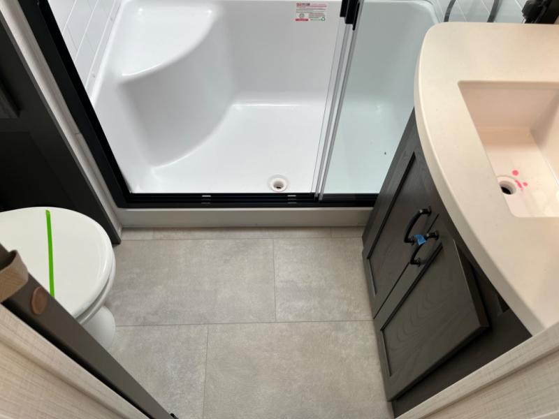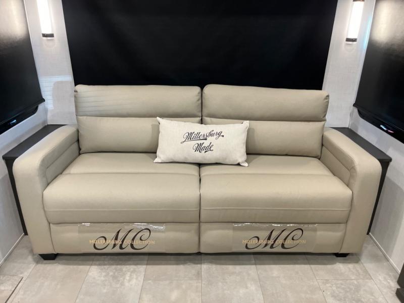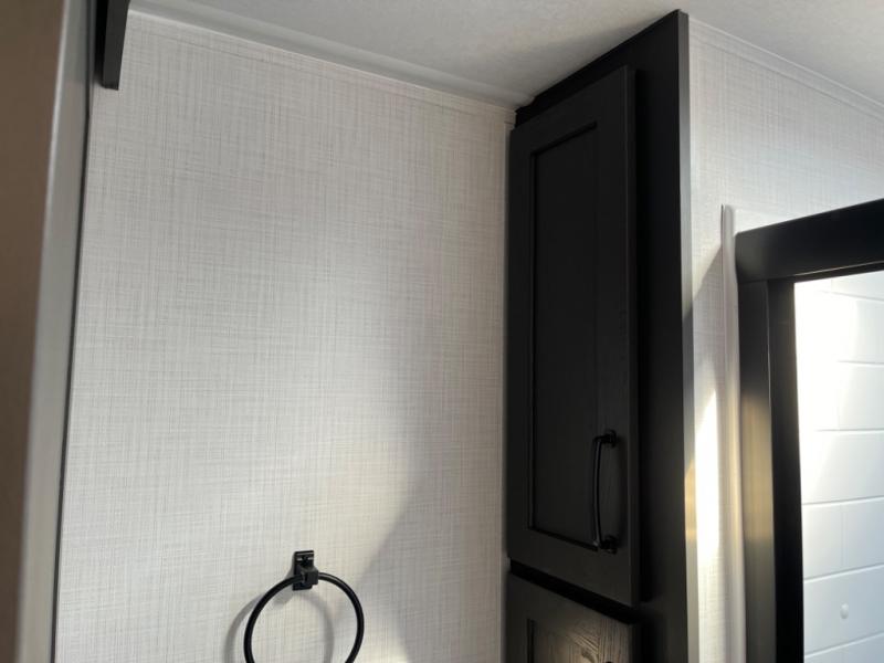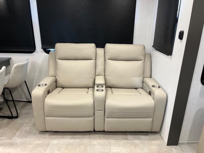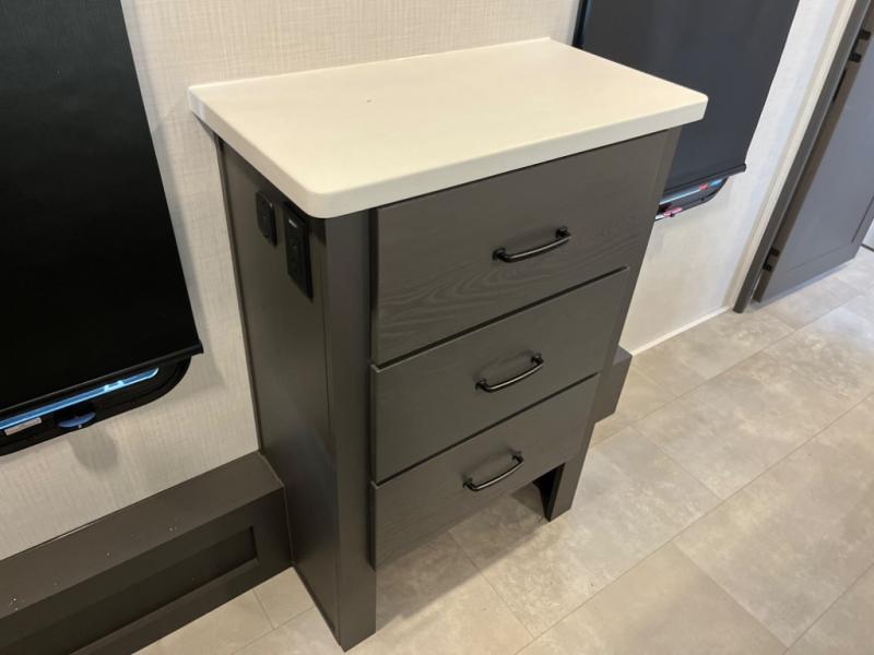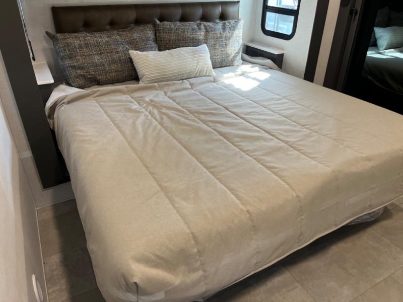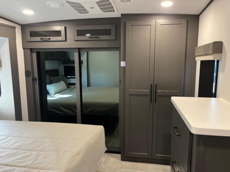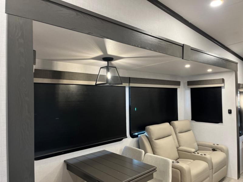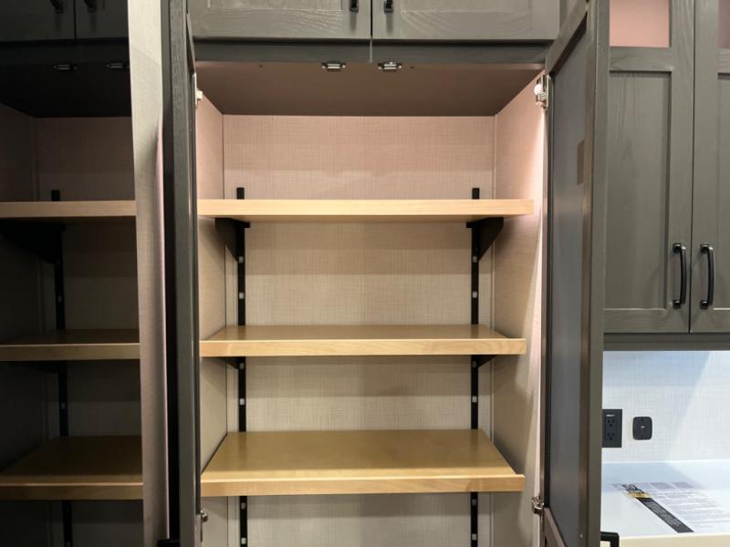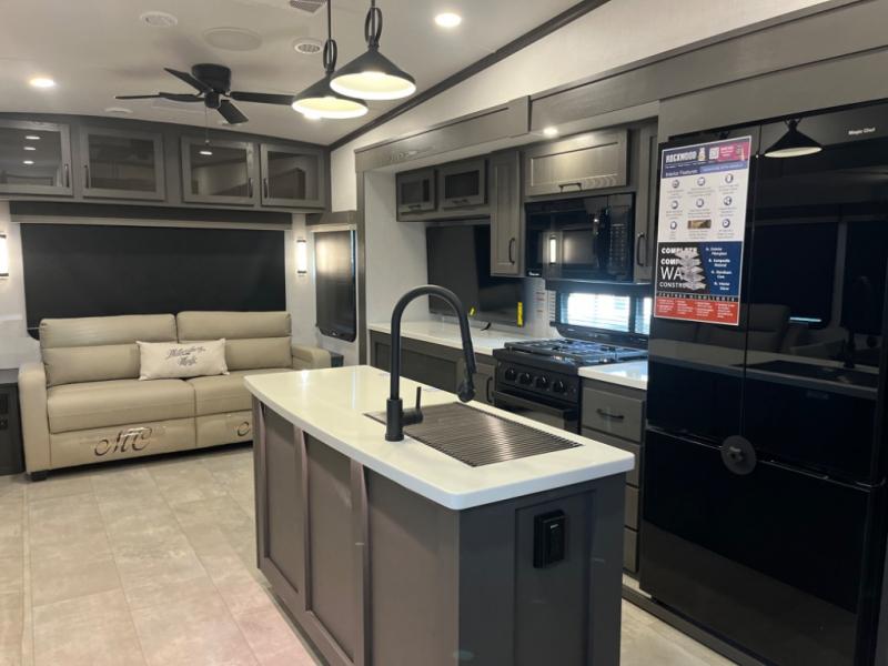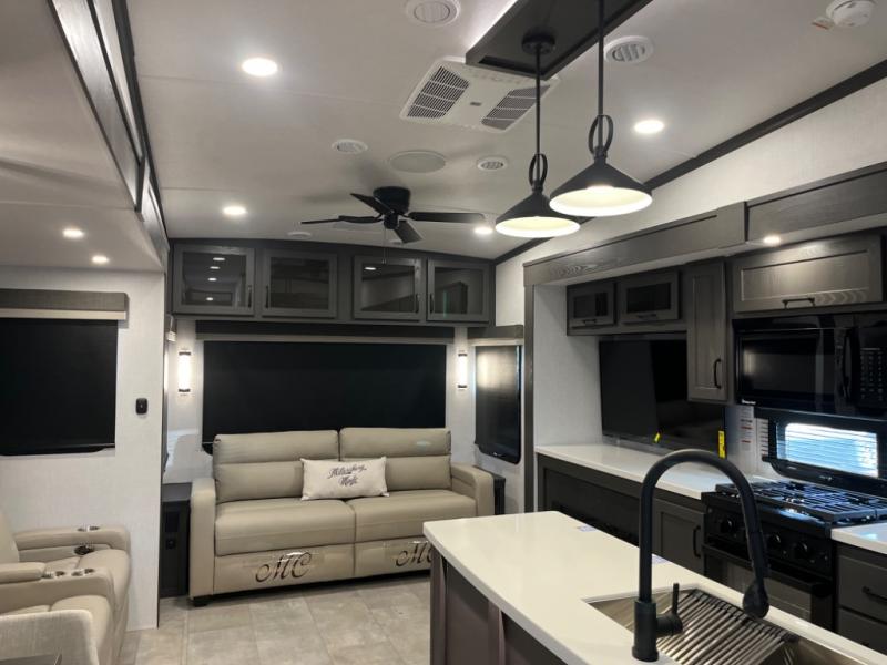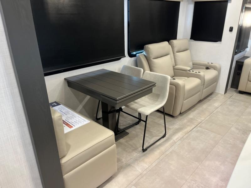 You can enjoy views from inside or outside each day once this RV is set up at the campgrounds! The large windows in the furniture slide and the windows throughout allow you to take in the scenery, and the three slide outs give you a spacious main living and kitchen area as well as front bedroom. You will find lots of seating for guests on the hide-a-bed sofa in the rear, and on the theater seats and booth dinette in the slide. The cook will love the 12V refrigerator and large pantry to store food, and everyone can enjoy the Smart TV and fireplace when visiting and relaxing. The front bedroom offers a king bed slide, a front wardrobe, plus washer and dryer prep if you choose to add those appliances.