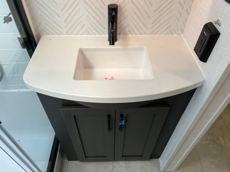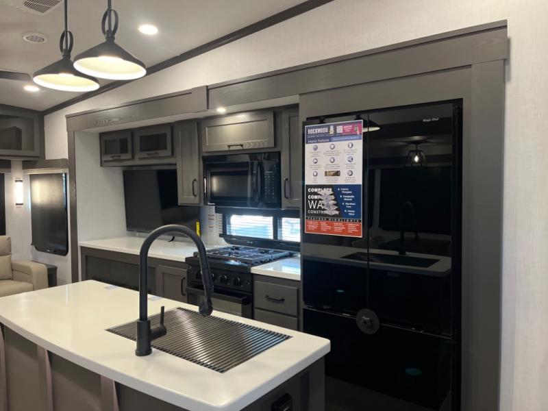 With any Rockwood Signature fifth wheel or travel trailer by Forest River RV, you will enjoy superior construction that includes laminated white fiberglass sidewalls, a radius roof with vaulted interior ceilings, plus radiant foil insulation and an enclosed underbelly for use in all types of weather. Some convenient exterior features include Keyed Alike locks, a rear ladder, a 200W solar panel, and a tire pressure monitor system with a monitor for added safety. The interior offers a One Touch OneControl panel with WeRV app control, for lights, awning, slides, water heater and more, and the Air 360+ omnidirectional antenna with WiFi prep lets you work while away from home if needed. You will also appreciate the interior vaulted ceilings, residential soft close doors and drawers, solid surface kitchen countertops, and designer kitchen backsplash!