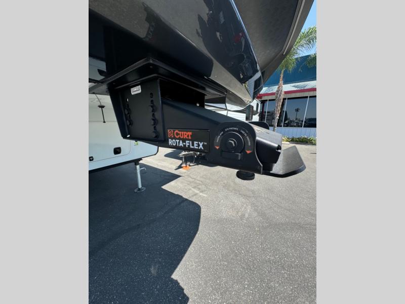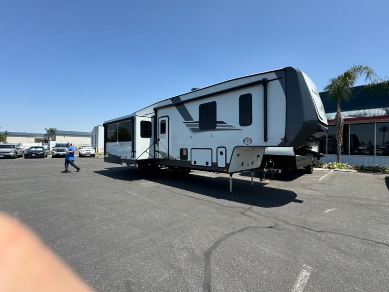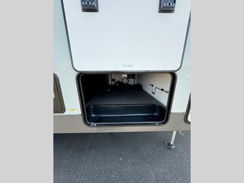 This rear kitchen fifth wheel is the perfect coach for a couple, or one that likes to entertain overnight guests. With two hide-a-bed sofas, one 60" and the other 67", you will have plenty of room for taking along extra family or friends on your adventures. The kitchen is tucked in the back and features a u-shaped counter area, and there is a 39" booth dinette within the slide that houses the 67" HAB sofa. You could also choose the optional theater seating in place of this hide-a-bed if you don't need the extra sleeping space. There is also a 60" theater seat for movie night opposite the TV/fireplace. Head up the steps to your private front bedroom with slide out queen bed, dresser, and large wardrobe with washer and dryer prep. The bathroom is at the top of the steps up and includes a large shower, linen cabinet and sink with medicine cabinet, plus a toilet. This unit also features ample storage on the outside as well as on the interior.