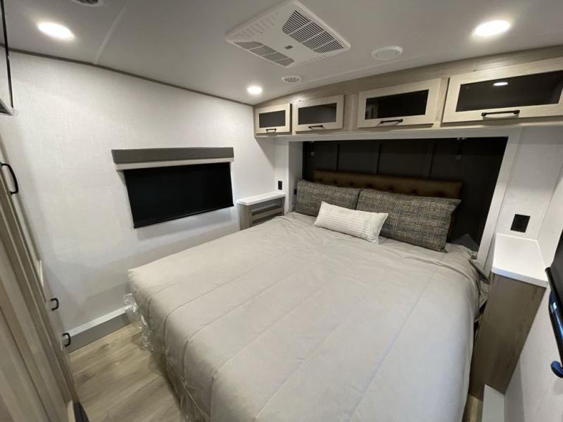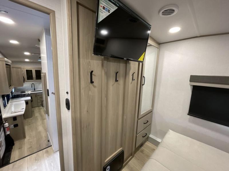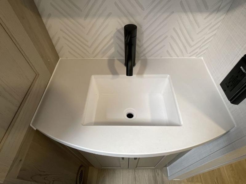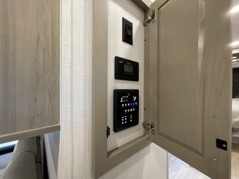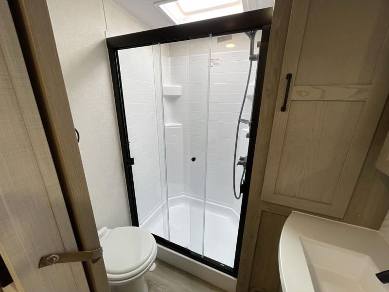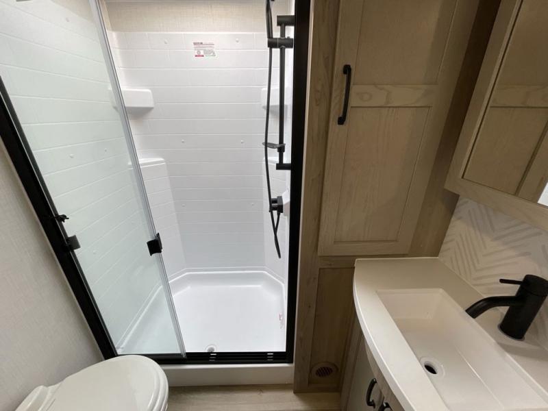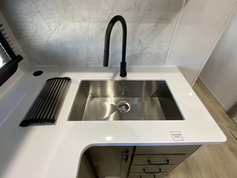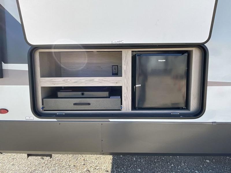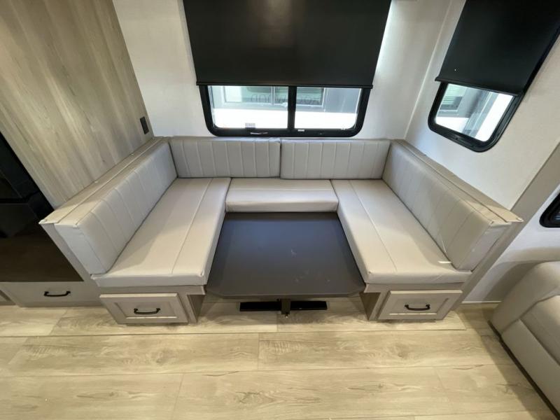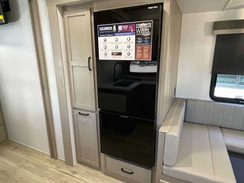 With any Rockwood Signature fifth wheel or travel trailer by Forest River RV, you will enjoy superior construction that includes laminated white fiberglass sidewalls, a radius roof with vaulted interior ceilings, plus radiant foil insulation and an enclosed underbelly for use in all types of weather. Some convenient exterior features include Keyed Alike locks, a rear ladder, a 200W solar panel, and a tire pressure monitor system with a monitor for added safety. The interior offers a One Touch OneControl panel with WeRV app control, for lights, awning, slides, water heater and more, and the Air 360+ omnidirectional antenna with WiFi prep lets you work while away from home if needed. You will also appreciate the interior vaulted ceilings, residential soft close doors and drawers, solid surface kitchen countertops, and designer kitchen backsplash!