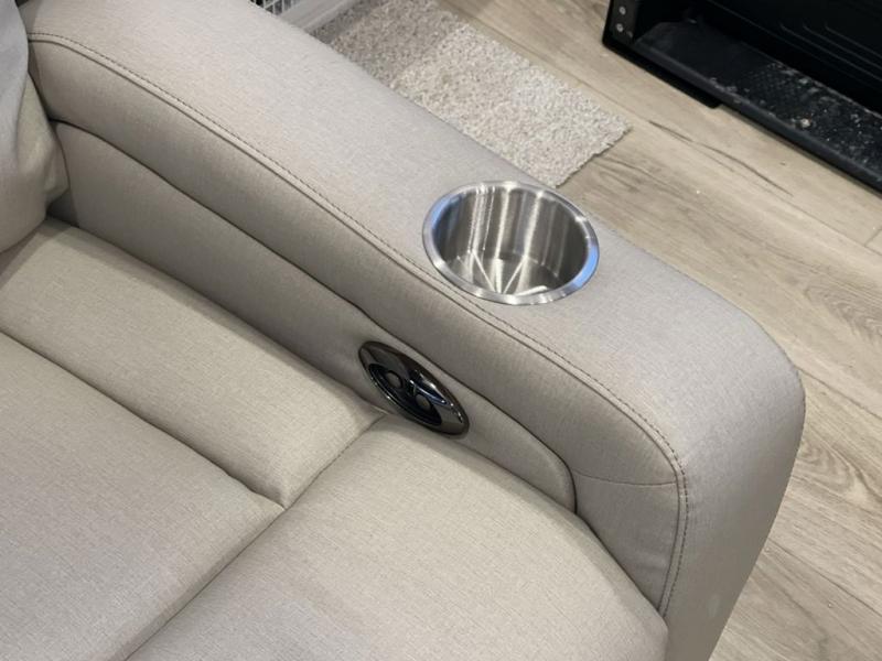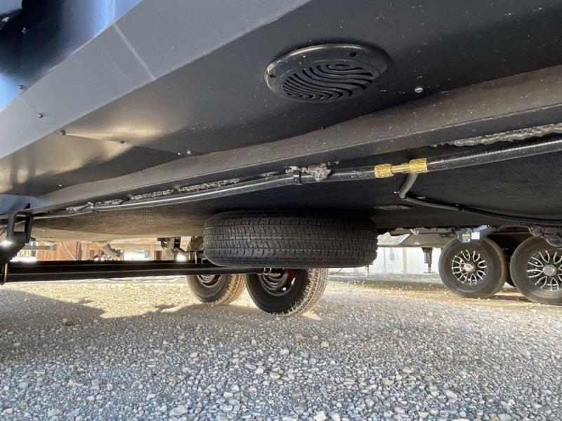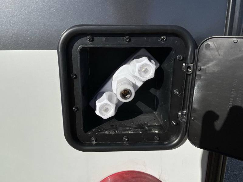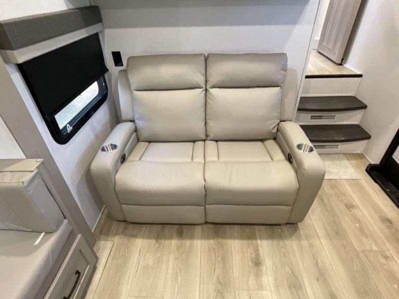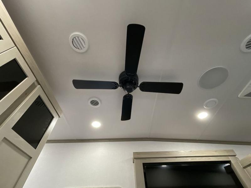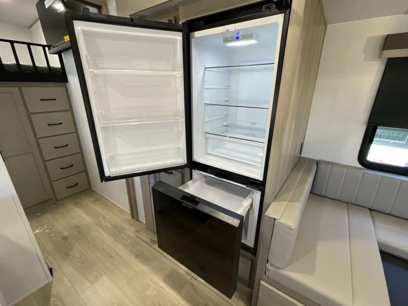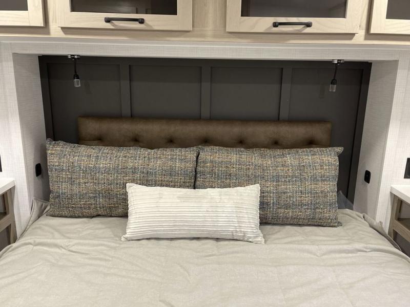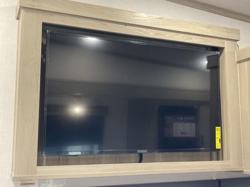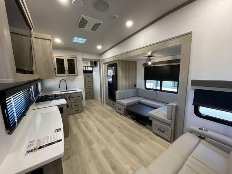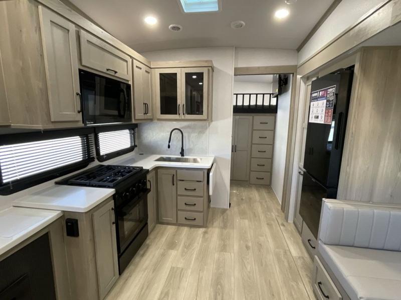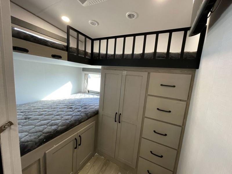 Looking to travel with your family and friends and need lots of space for everyone? This fifth wheel offers a front private bedroom with a queen bed, a spacious wardrobe, and a TV option for shows in bed. On the opposite side of the unit there is a private bunkhouse with triple bunks, plus washer and dryer prep. The main living and kitchen area includes a slide out which offers a king U-shaped dinette to dine at, play games with friends, and provides sleeping if needed, plus a 12V refrigerator and a pantry. There is also a 55" theater seat here for more comfort. The cook will have full amenities indoors plus an outside kitchen when the weather is nice. There are also two power awnings, Solid Entry steps, a rear 2" towing hitch, and more exterior conveniences!