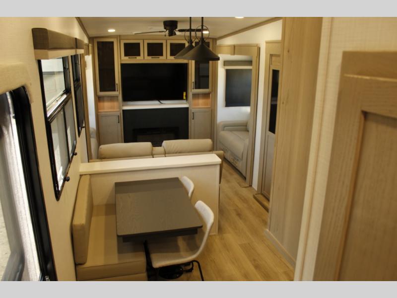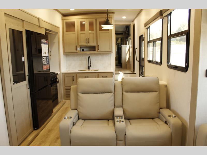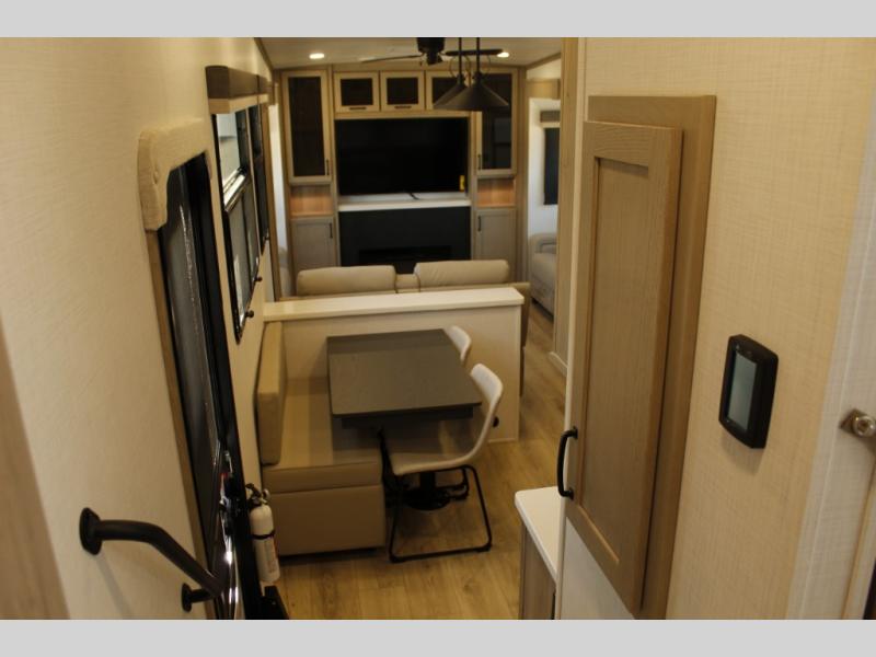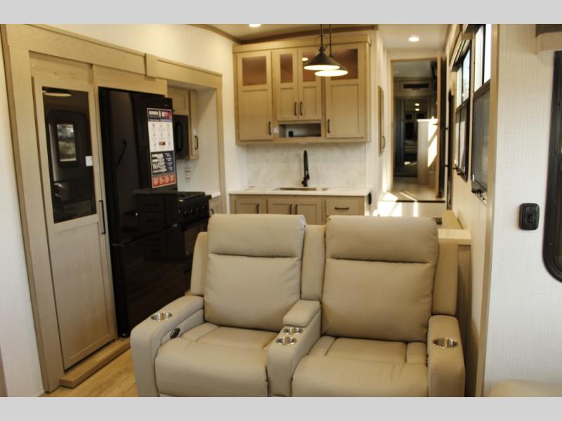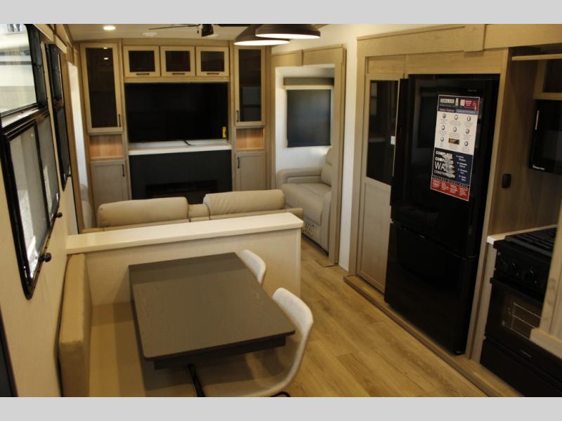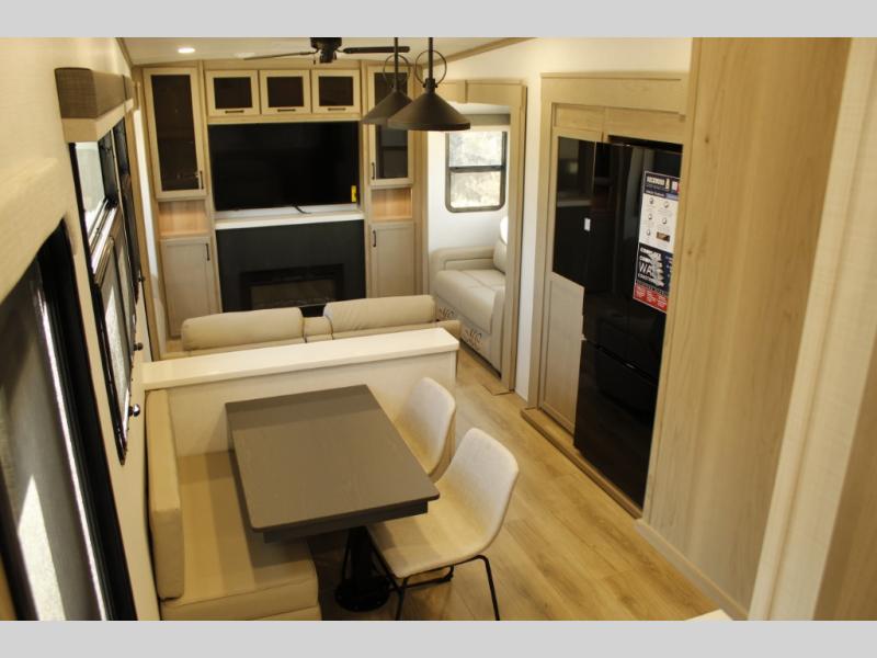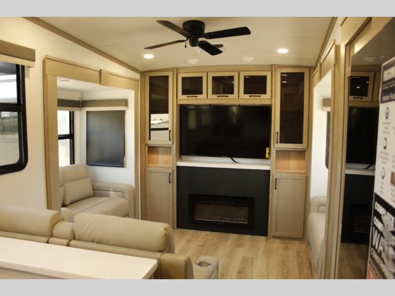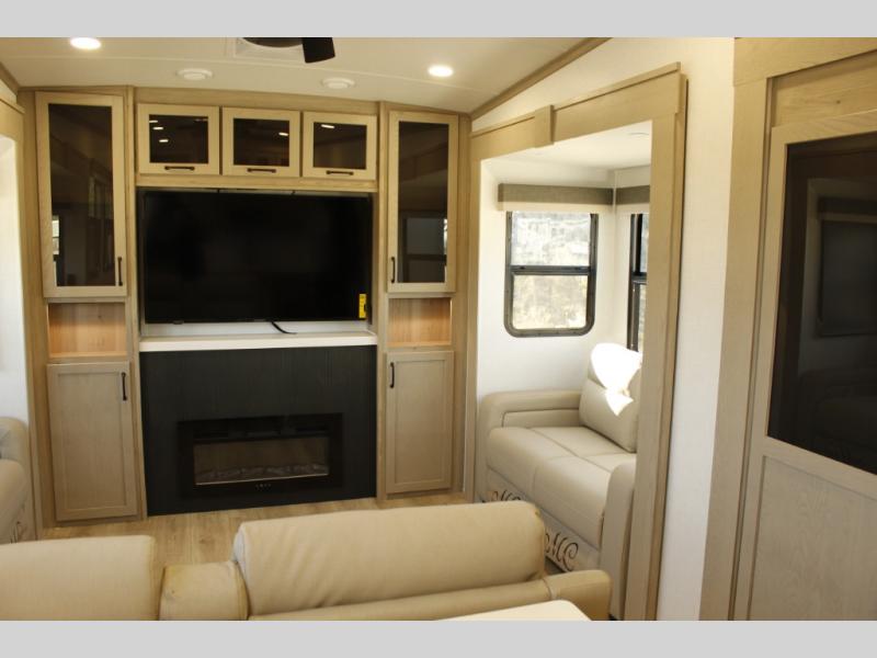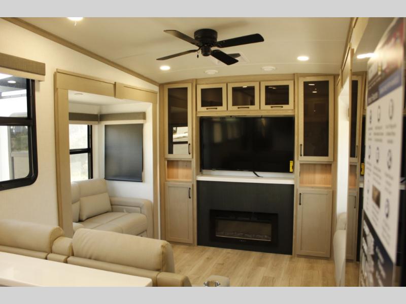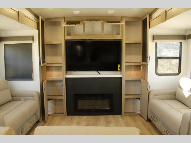 Looking for a fifth wheel to entertain other RVers while at the campgrounds? This is the one that offers seating for up to 10 between the dual opposing hide-a-bed sofa slides and the theater seating in the rear living area. There is a full wall entertainment center here, along with a Smart TV and a fireplace, plus a table with chairs and a bench in the middle kitchen. The cook will have full amenities to keep everyone fed including a 12V refrigerator and a pantry to store lots of food. The full bathroom includes linen storage and a shower with a seat, and the front bedroom offers a slide out queen bed or choose a king option, a dresser and a front wardrobe including shelves. There is even washer and dryer prep if you choose to go full-time!