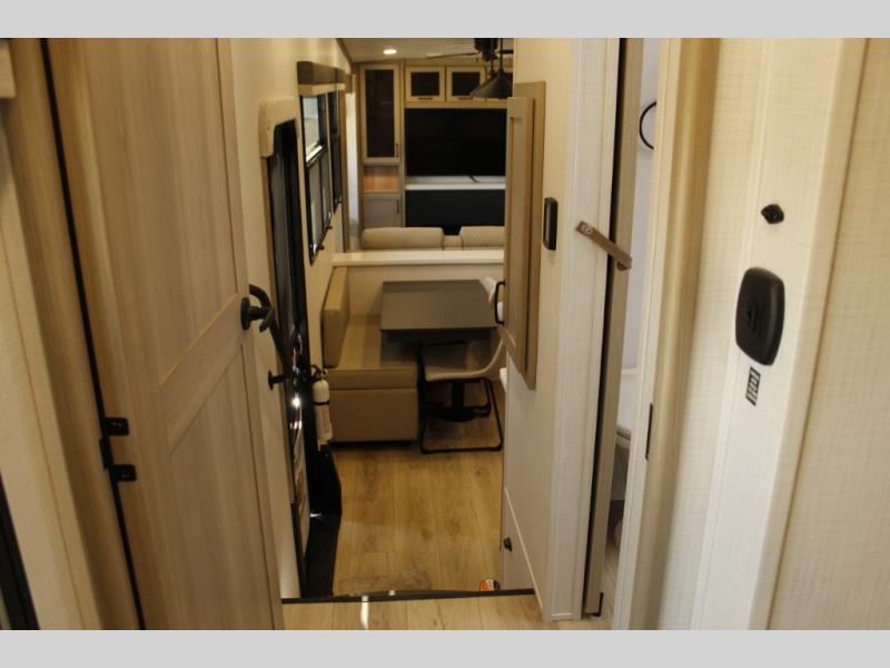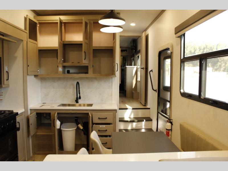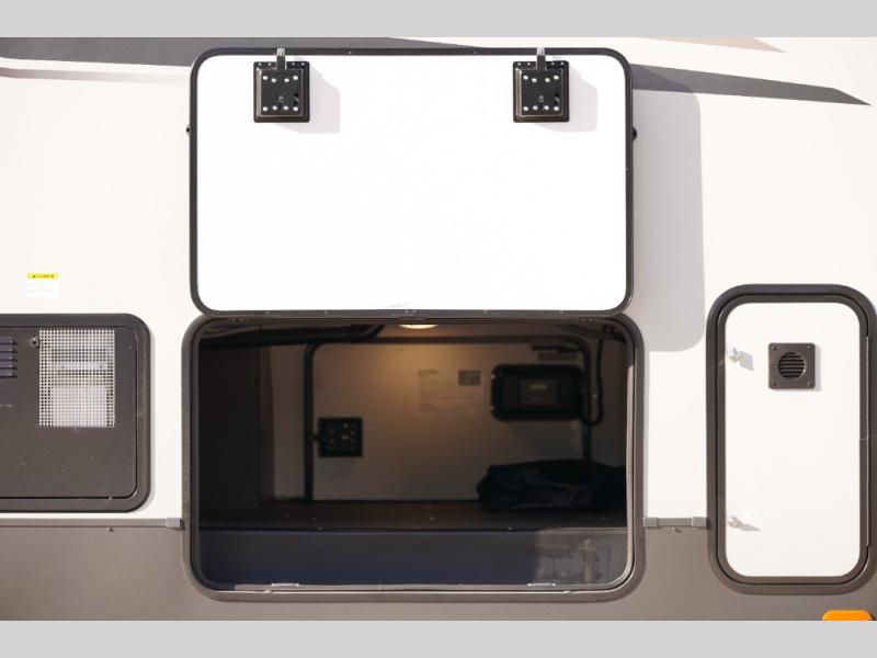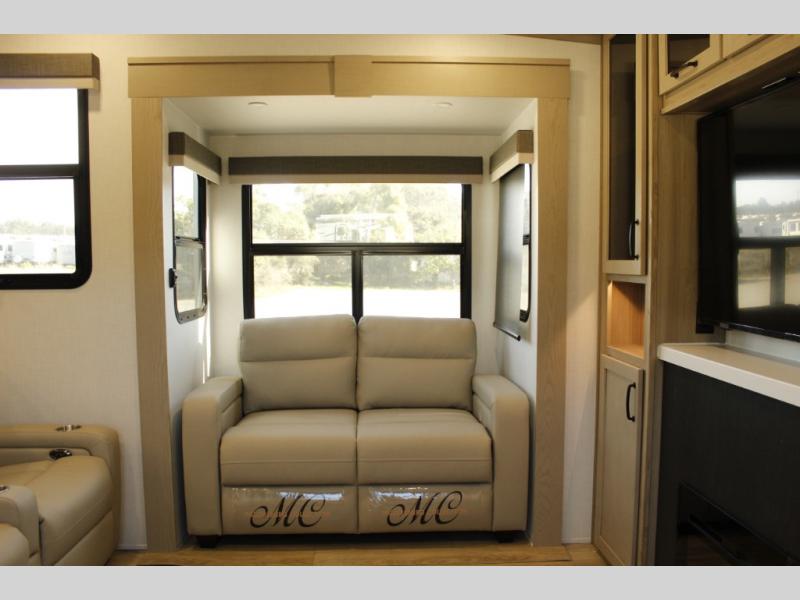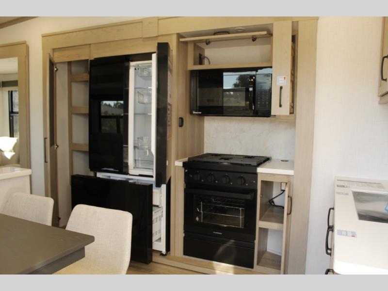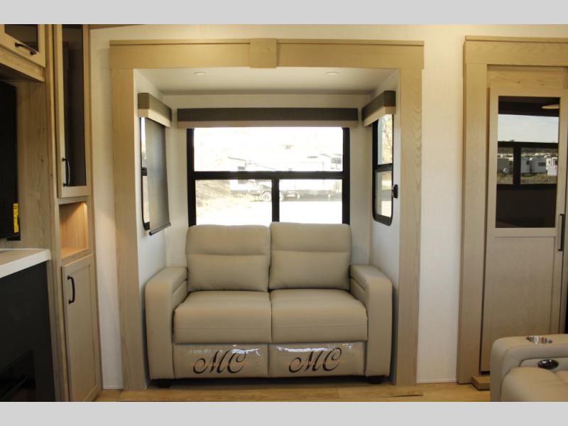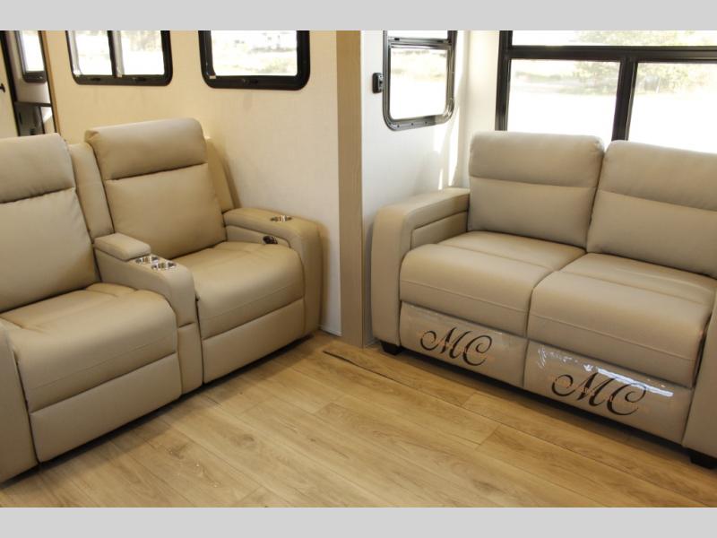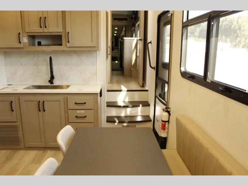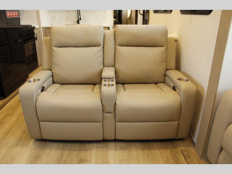 Looking for a fifth wheel to entertain other RVers while at the campgrounds? This is the one that offers seating for up to 10 between the dual opposing hide-a-bed sofa slides and the theater seating in the rear living area. There is a full wall entertainment center here, along with a Smart TV and a fireplace, plus a table with chairs and a bench in the middle kitchen. The cook will have full amenities to keep everyone fed including a 12V refrigerator and a pantry to store lots of food. The full bathroom includes linen storage and a shower with a seat, and the front bedroom offers a slide out queen bed or choose a king option, a dresser and a front wardrobe including shelves. There is even washer and dryer prep if you choose to go full-time!