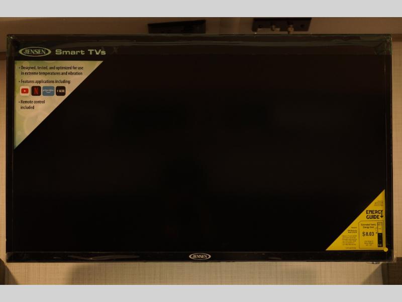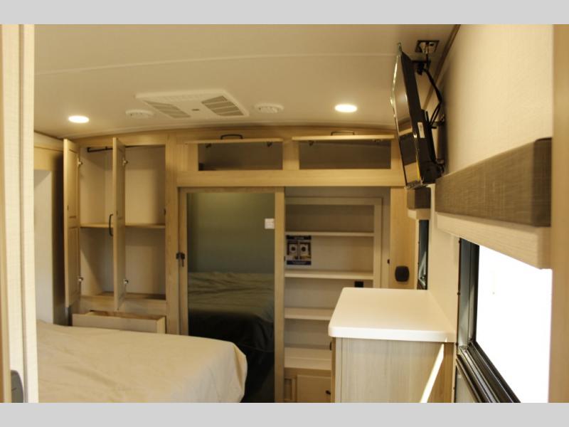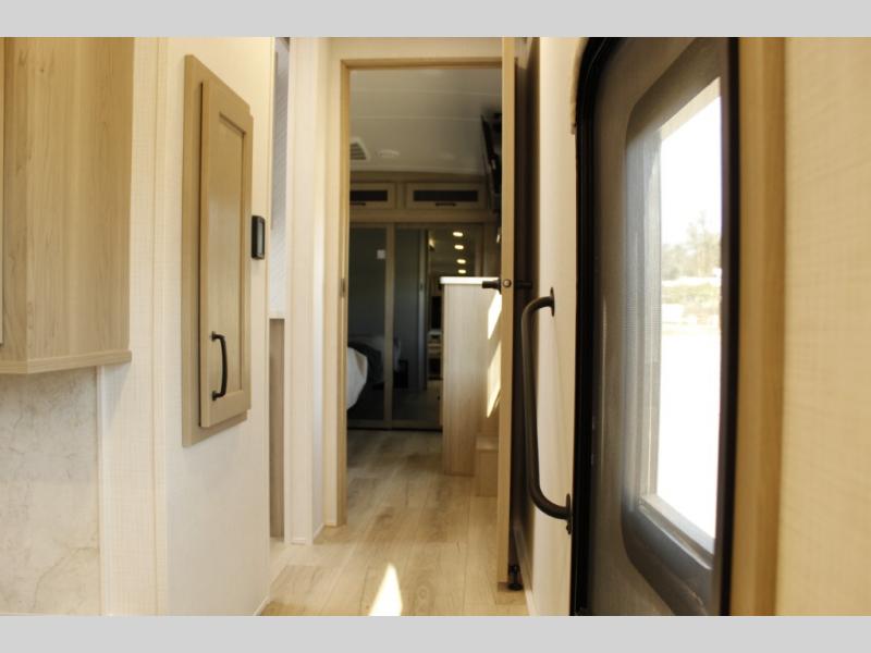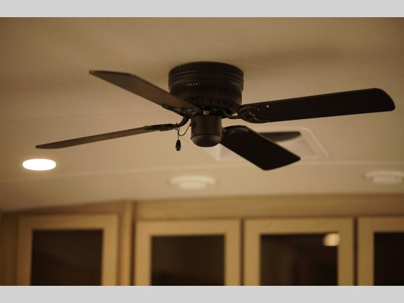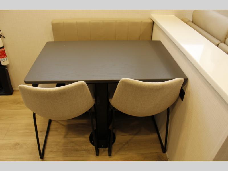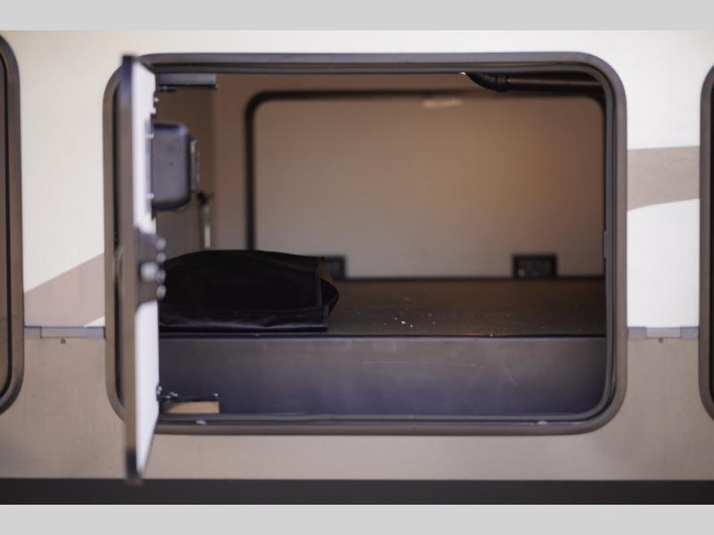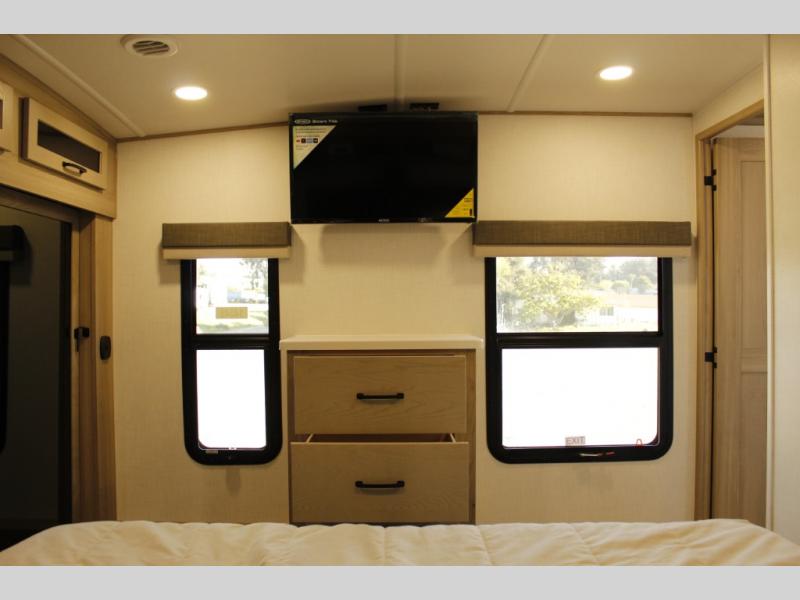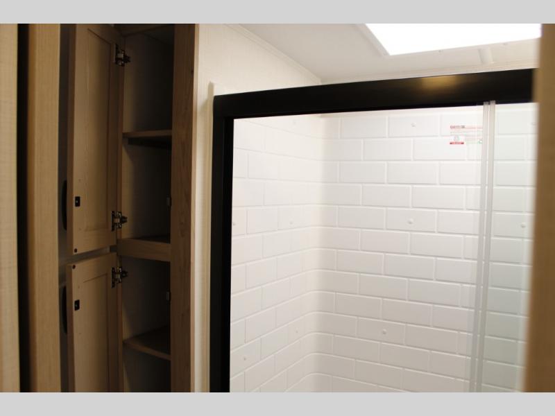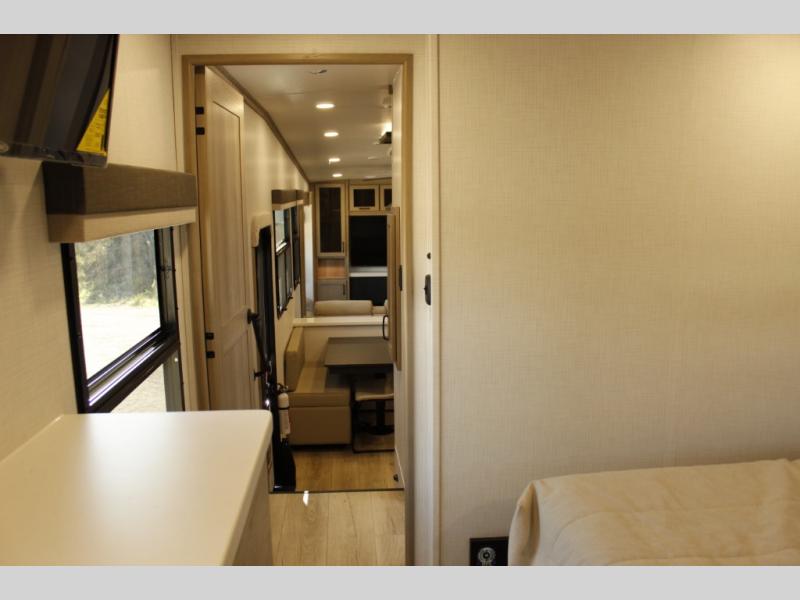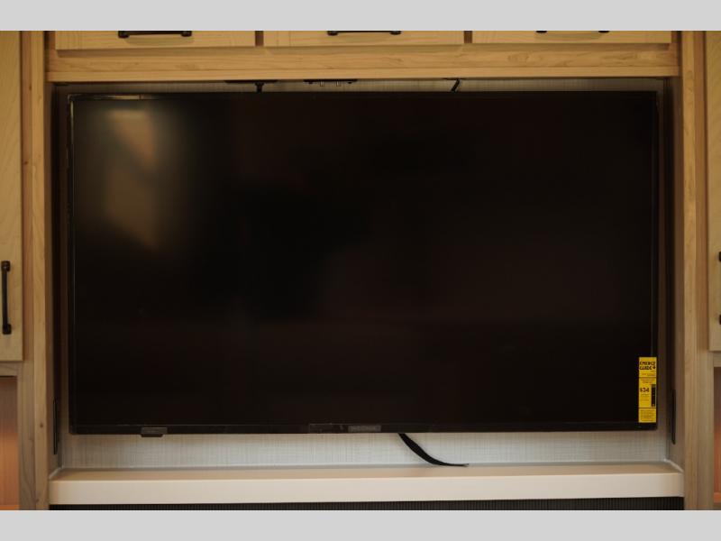 Looking for a fifth wheel to entertain other RVers while at the campgrounds? This is the one that offers seating for up to 10 between the dual opposing hide-a-bed sofa slides and the theater seating in the rear living area. There is a full wall entertainment center here, along with a Smart TV and a fireplace, plus a table with chairs and a bench in the middle kitchen. The cook will have full amenities to keep everyone fed including a 12V refrigerator and a pantry to store lots of food. The full bathroom includes linen storage and a shower with a seat, and the front bedroom offers a slide out queen bed or choose a king option, a dresser and a front wardrobe including shelves. There is even washer and dryer prep if you choose to go full-time!