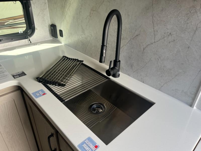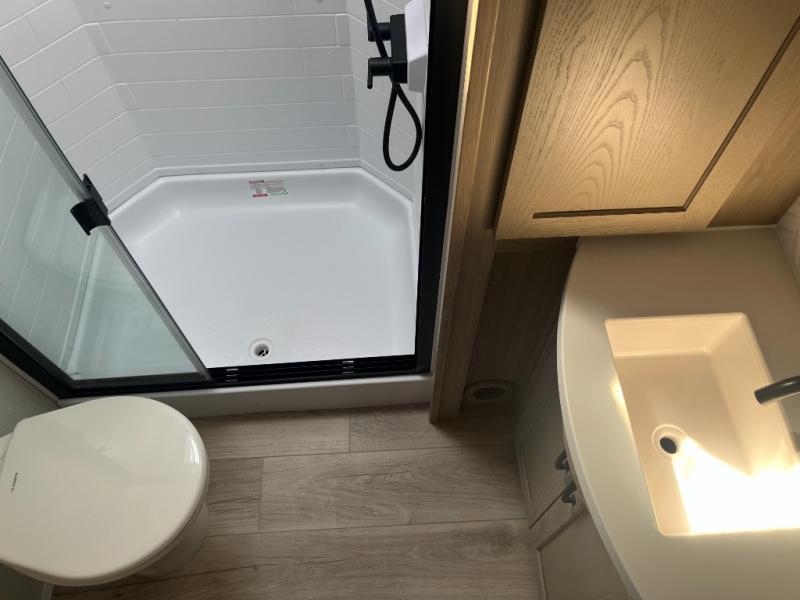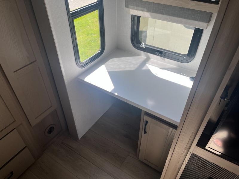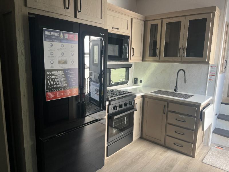 With any Rockwood Signature fifth wheel or travel trailer by Forest River RV, you will enjoy superior construction that includes laminated white fiberglass sidewalls, a radius roof with vaulted interior ceilings, plus radiant foil insulation and an enclosed underbelly for use in all types of weather. Some convenient exterior features include Keyed Alike locks, a rear ladder, a 200W solar panel, and a tire pressure monitor system with a monitor for added safety. The interior offers a One Touch OneControl panel with WeRV app control, for lights, awning, slides, water heater and more, and the Air 360+ omnidirectional antenna with WiFi prep lets you work while away from home if needed. You will also appreciate the interior vaulted ceilings, residential soft close doors and drawers, solid surface kitchen countertops, and designer kitchen backsplash!