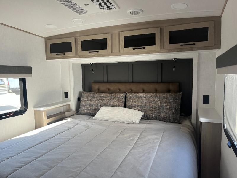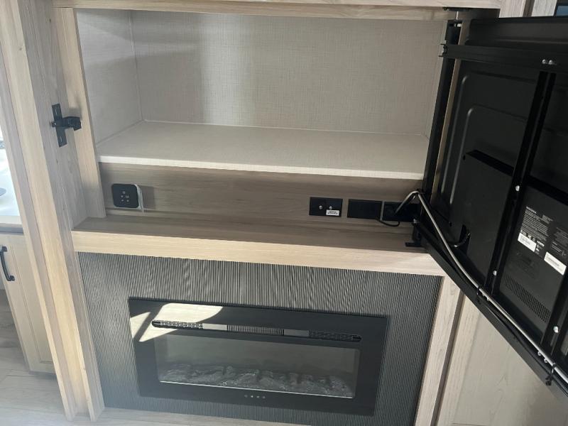 This fifth wheel is one the whole gang will love to camp in! The rear bunkhouse includes two bunk beds, a desk with a chair, plus a wardrobe with washer and dryer prep if you choose to add those appliances. The slide here extends into the main living area and also includes the Smart TV and fireplace. You can get comfortable on the theater seat or play a game at the booth dinette while the chef cooks dinner in the full kitchen. The full bath is close to the front private bedroom for convenience, and you'll sleep soundly on the queen bed!