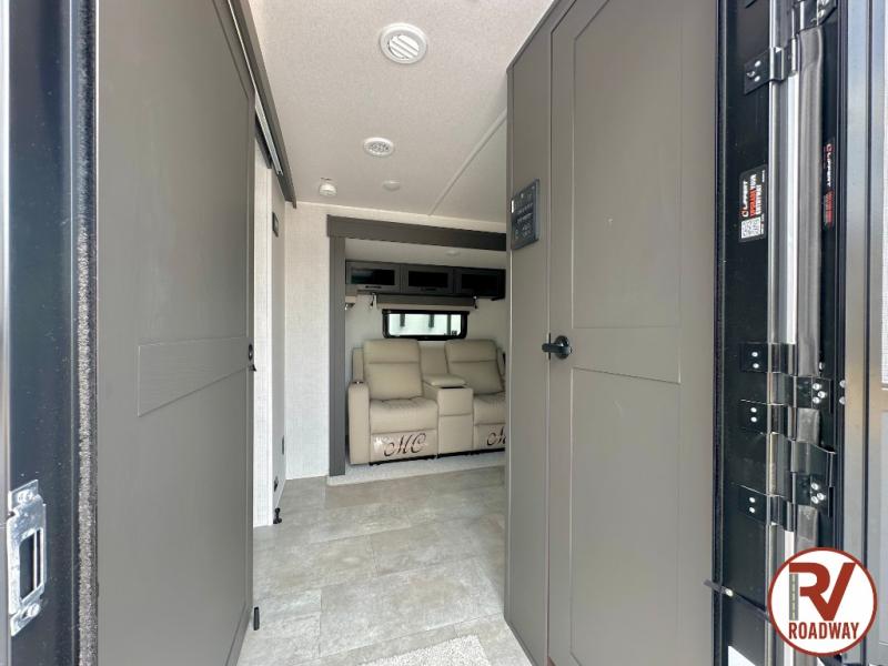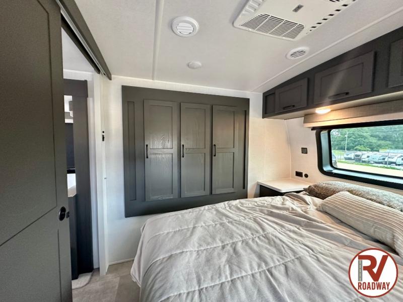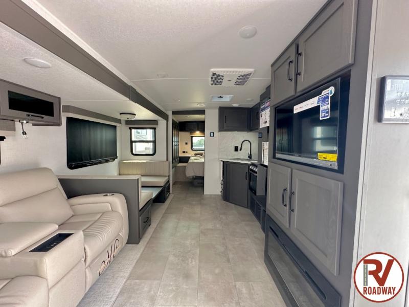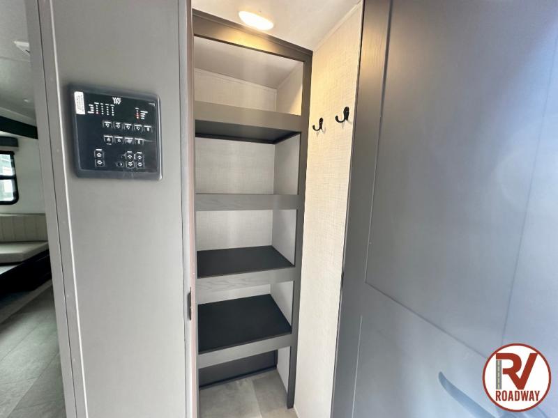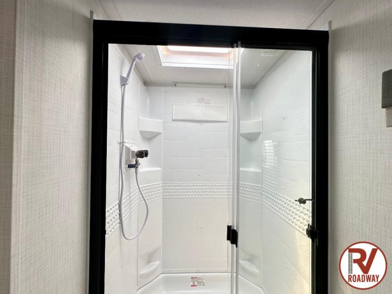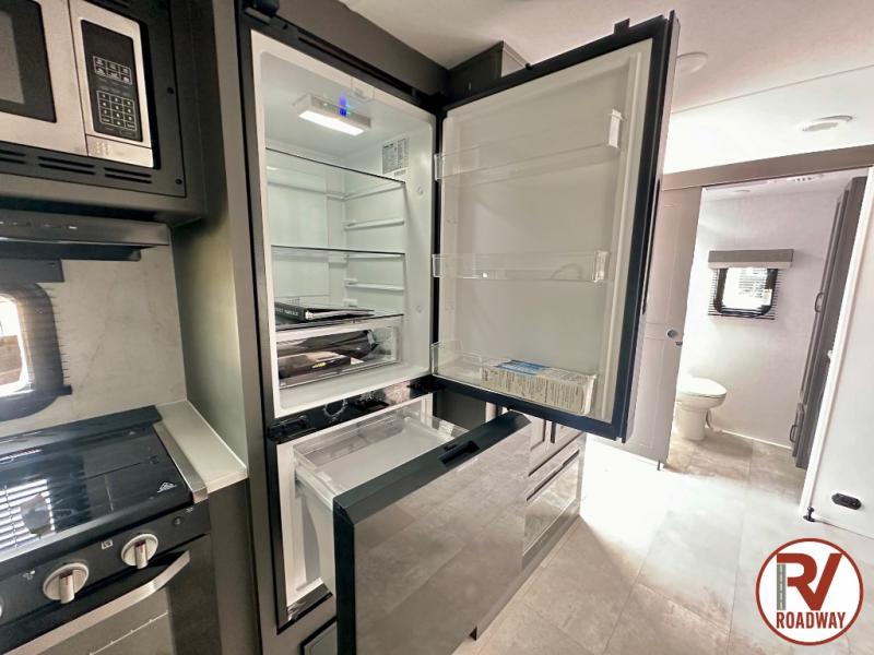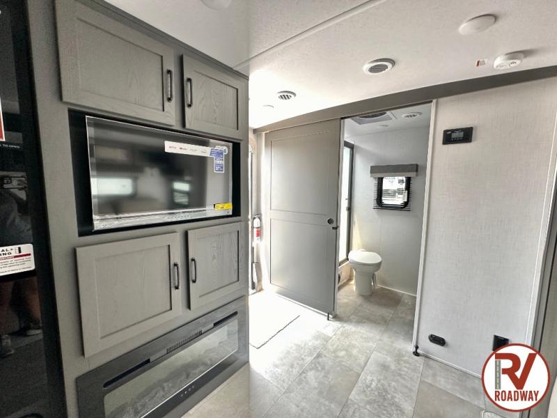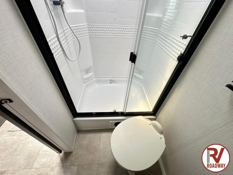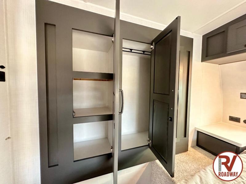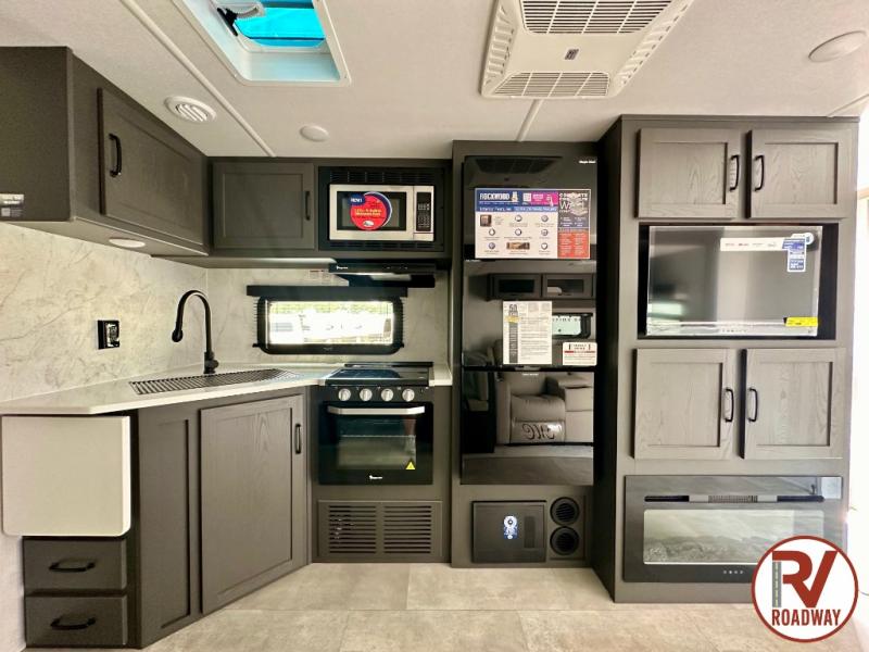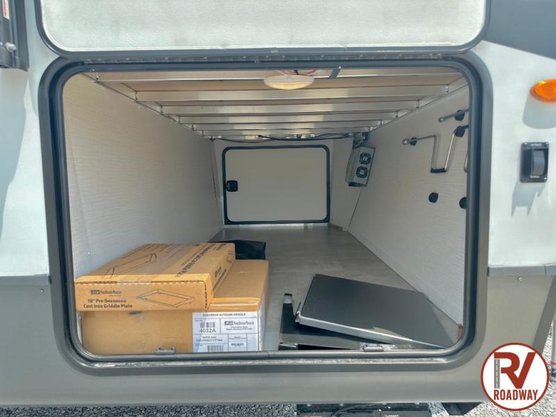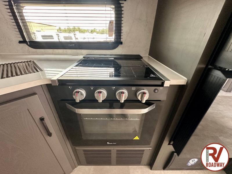 This trailer is the perfect couple's retreat with its private bedroom up front which includes a queen bed, a slide out wardrobe, and a TV option. The spacious rear full bathroom provides a shower and linen storage, and a space savings sliding door. The cook will have full amenities with ample counter space, a walk-in pantry for food storage, and a three burner range to cook meals on. If the weather is nice outside, you can make dinner on the exterior griddle, and there is a 21' awning to relax under. Or you can stay inside to enjoy the fireplace and Smart TV! You will also appreciate the pass thru storage with an optional steel sliding tray to easily access gear!