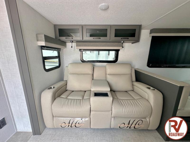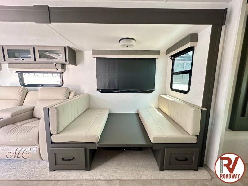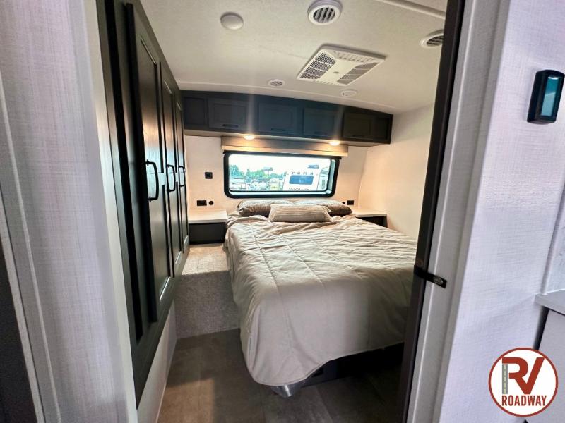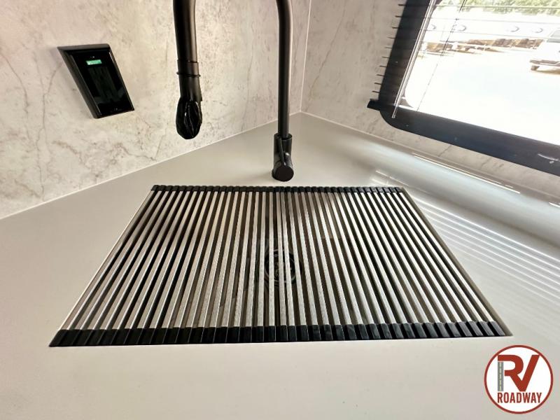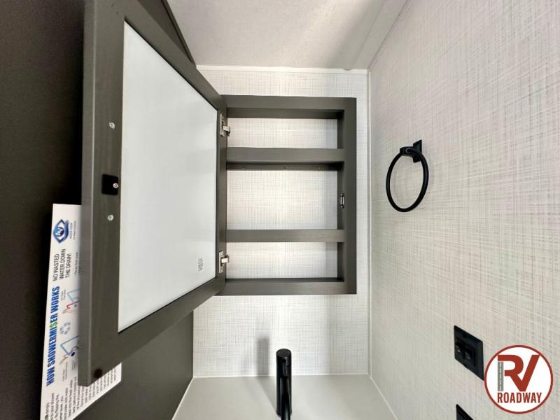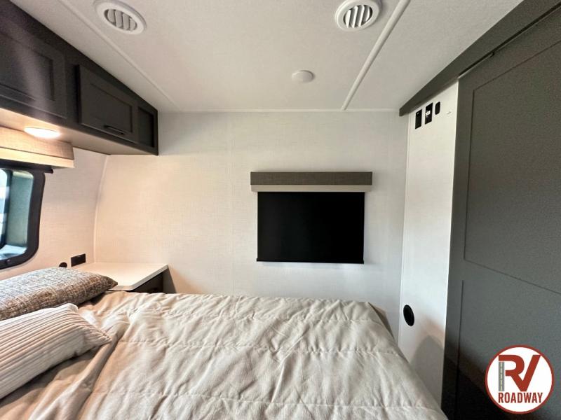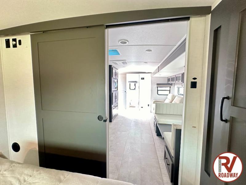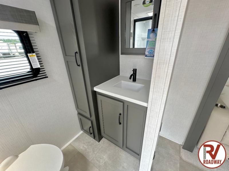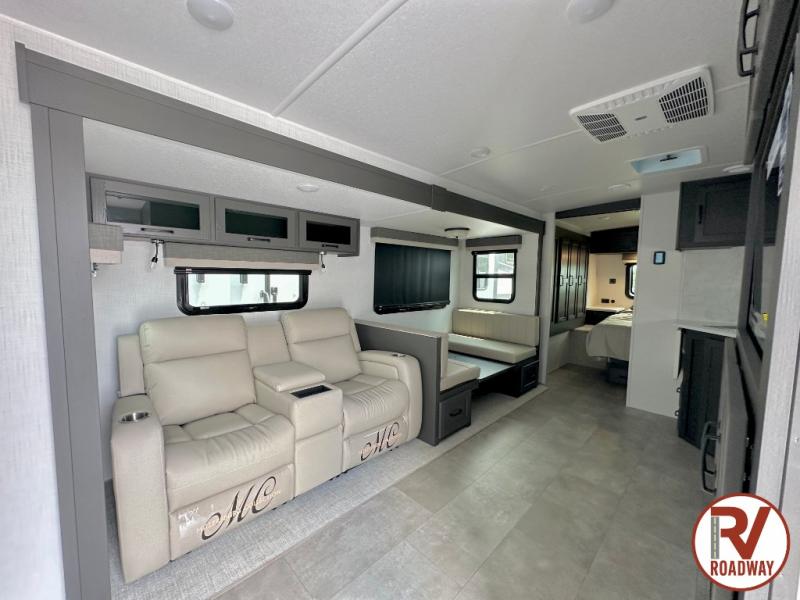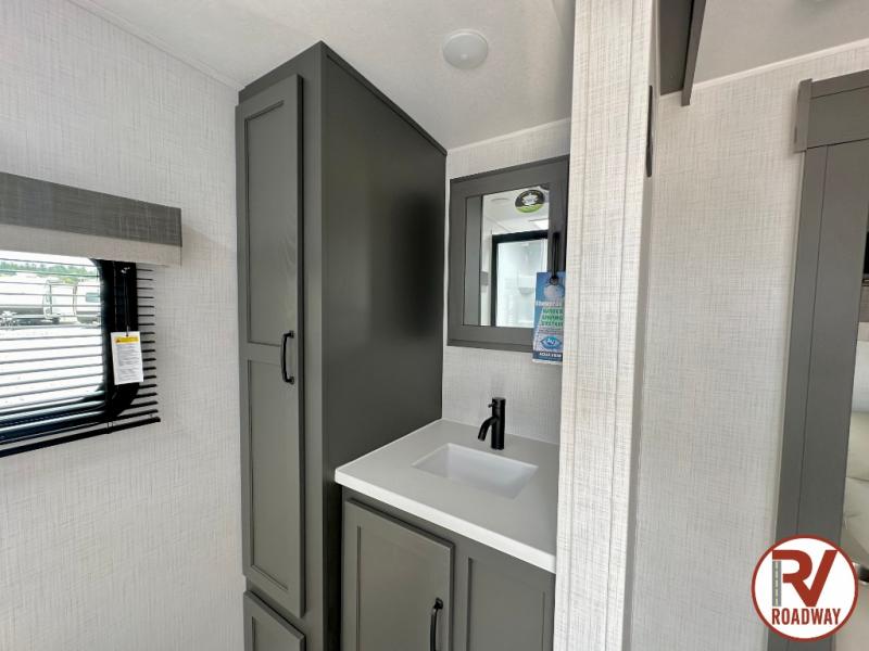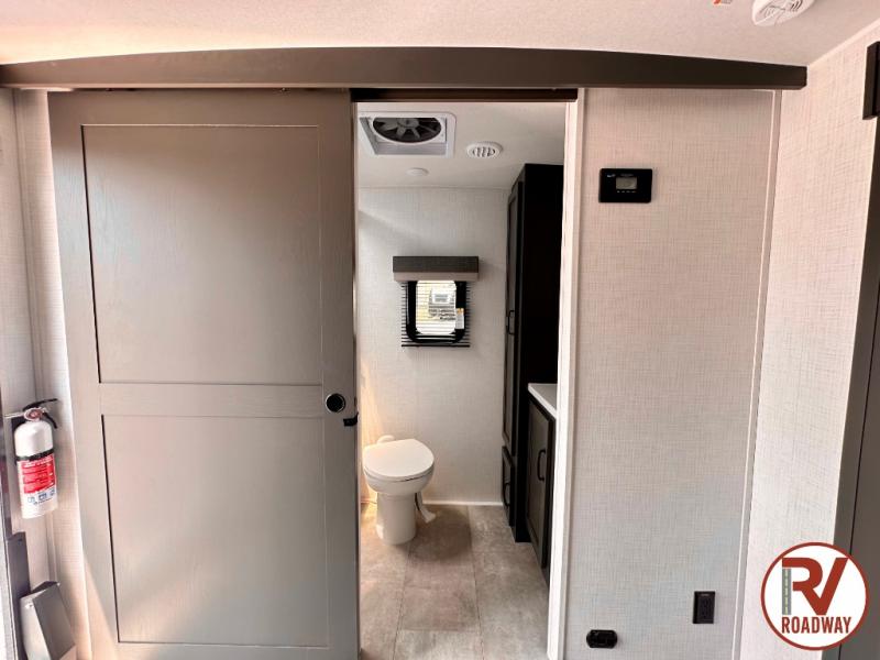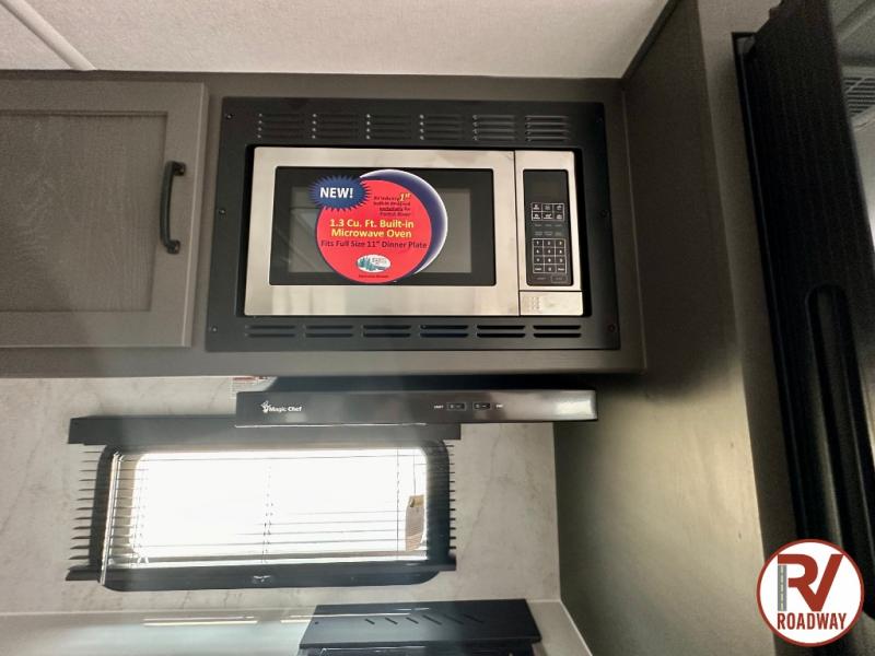 This trailer is the perfect couple's retreat with its private bedroom up front which includes a queen bed, a slide out wardrobe, and a TV option. The spacious rear full bathroom provides a shower and linen storage, and a space savings sliding door. The cook will have full amenities with ample counter space, a walk-in pantry for food storage, and a three burner range to cook meals on. If the weather is nice outside, you can make dinner on the exterior griddle, and there is a 21' awning to relax under. Or you can stay inside to enjoy the fireplace and Smart TV! You will also appreciate the pass thru storage with an optional steel sliding tray to easily access gear!