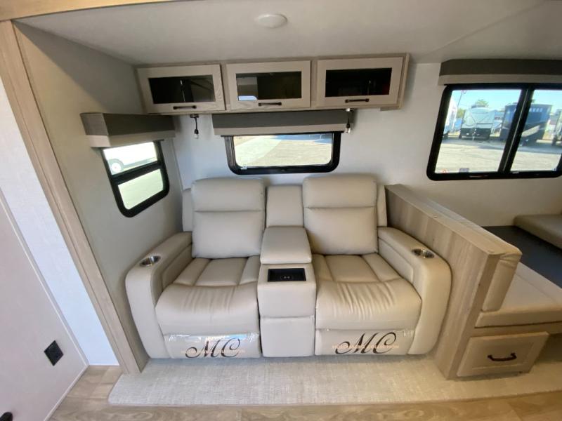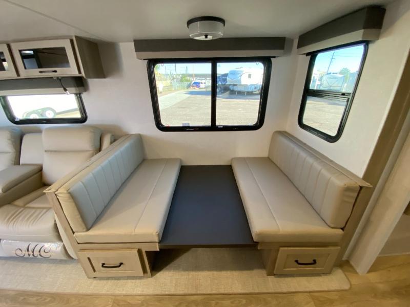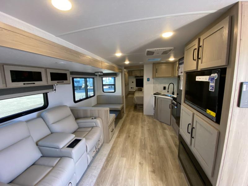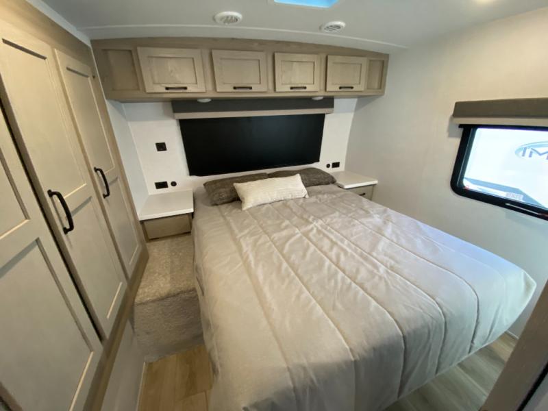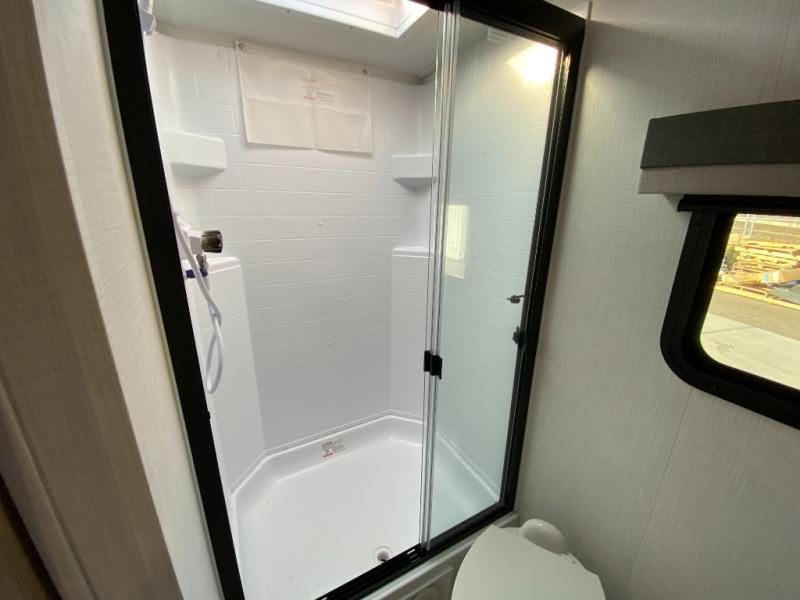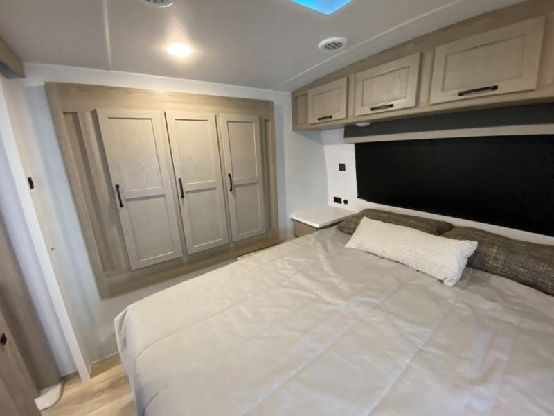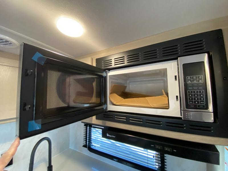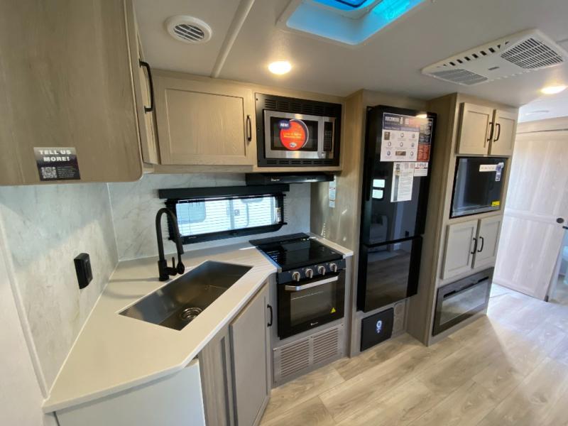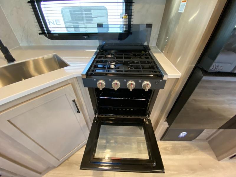 This trailer is the perfect couple's retreat with its private bedroom up front which includes a queen bed, a slide out wardrobe, and a TV option. The spacious rear full bathroom provides a shower and linen storage, and a space savings sliding door. The cook will have full amenities with ample counter space, a walk-in pantry for food storage, and a three burner range to cook meals on. If the weather is nice outside, you can make dinner on the exterior griddle, and there is a 21' awning to relax under. Or you can stay inside to enjoy the fireplace and Smart TV! You will also appreciate the pass thru storage with an optional steel sliding tray to easily access gear!