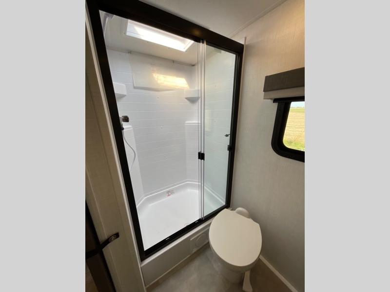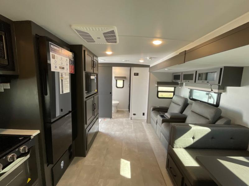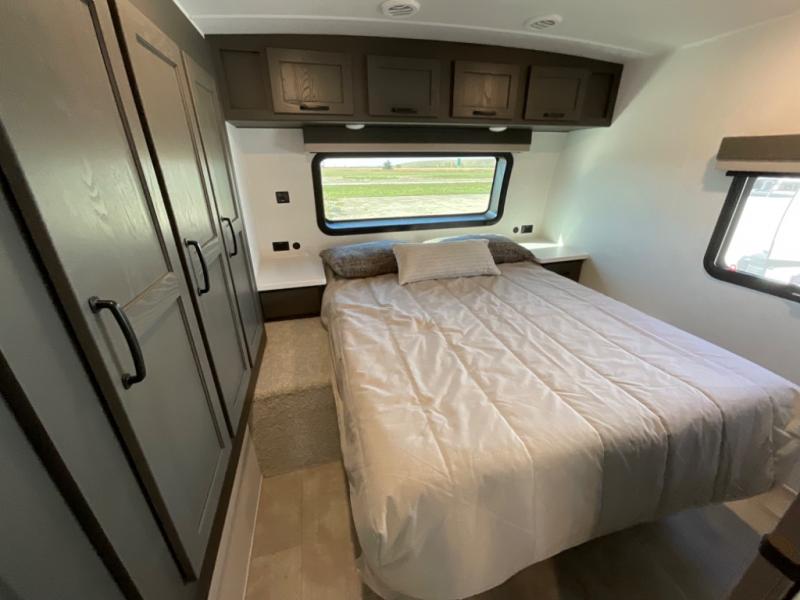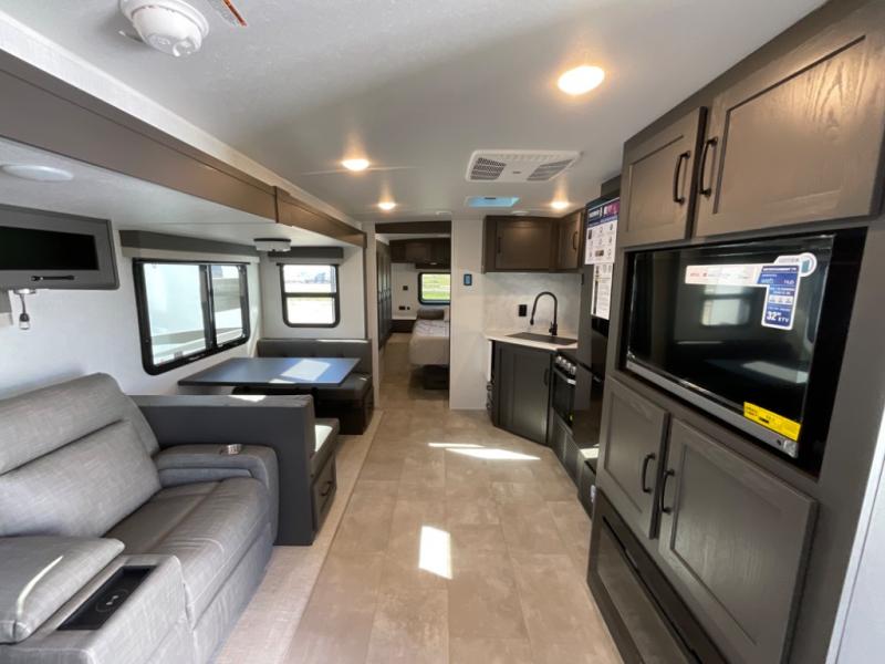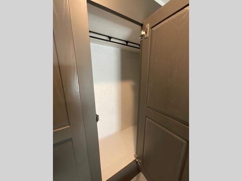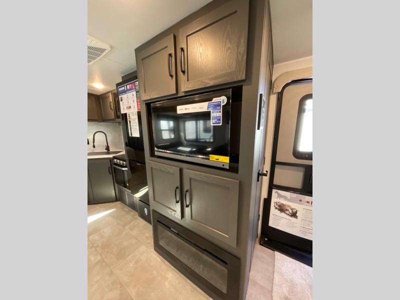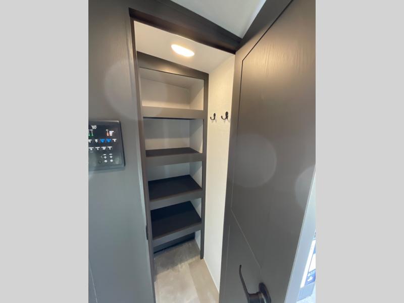 This trailer is the perfect couple's retreat with its private bedroom up front which includes a queen bed, a slide out wardrobe, and a TV option. The spacious rear full bathroom provides a shower and linen storage, and a space savings sliding door. The cook will have full amenities with ample counter space, a walk-in pantry for food storage, and a three burner range to cook meals on. If the weather is nice outside, you can make dinner on the exterior griddle, and there is a 21' awning to relax under. Or you can stay inside to enjoy the fireplace and Smart TV! You will also appreciate the pass thru storage with an optional steel sliding tray to easily access gear!