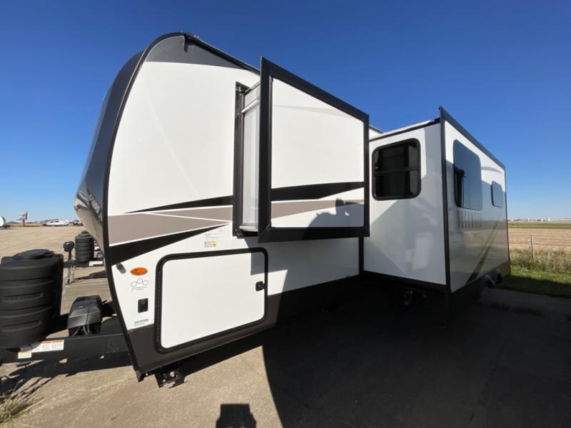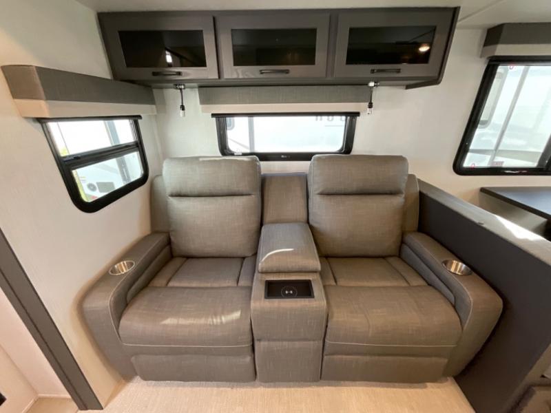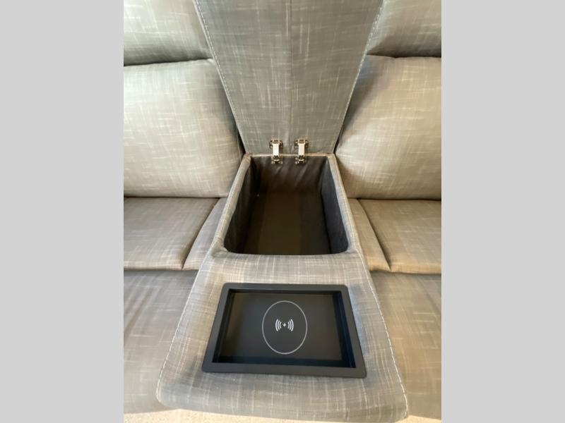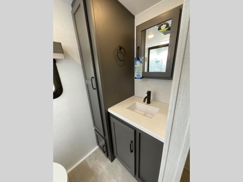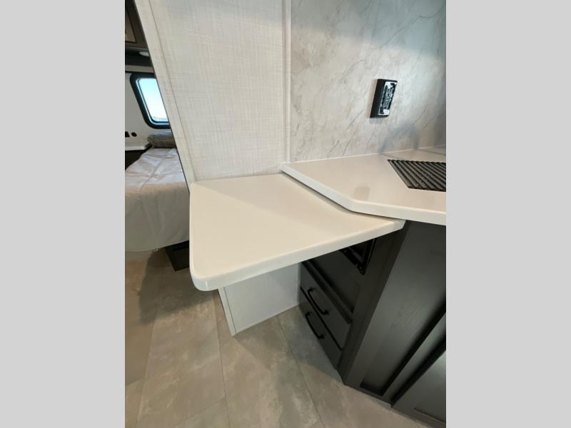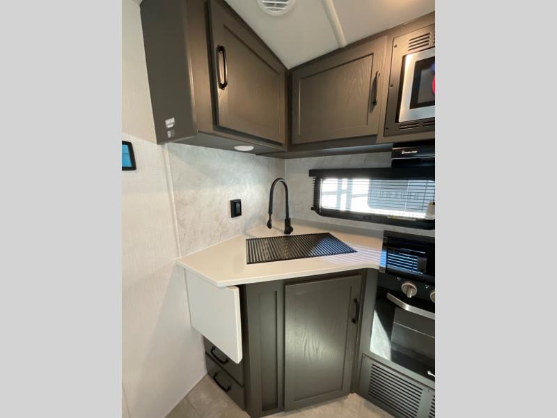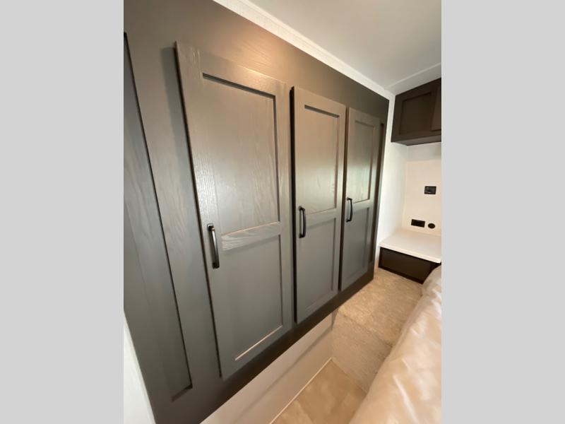 This trailer is the perfect couple's retreat with its private bedroom up front which includes a queen bed, a slide out wardrobe, and a TV option. The spacious rear full bathroom provides a shower and linen storage, and a space savings sliding door. The cook will have full amenities with ample counter space, a walk-in pantry for food storage, and a three burner range to cook meals on. If the weather is nice outside, you can make dinner on the exterior griddle, and there is a 21' awning to relax under. Or you can stay inside to enjoy the fireplace and Smart TV! You will also appreciate the pass thru storage with an optional steel sliding tray to easily access gear!