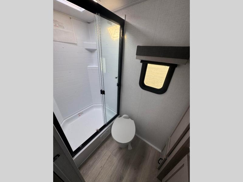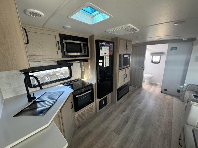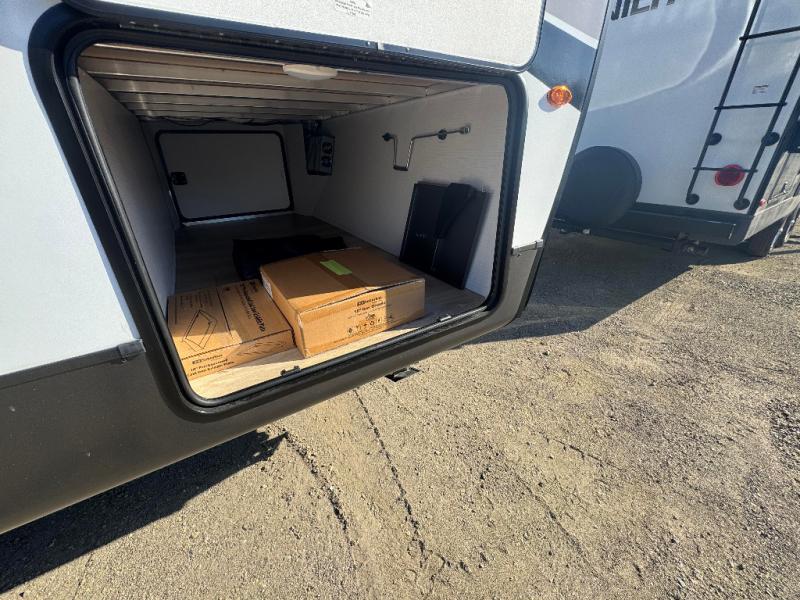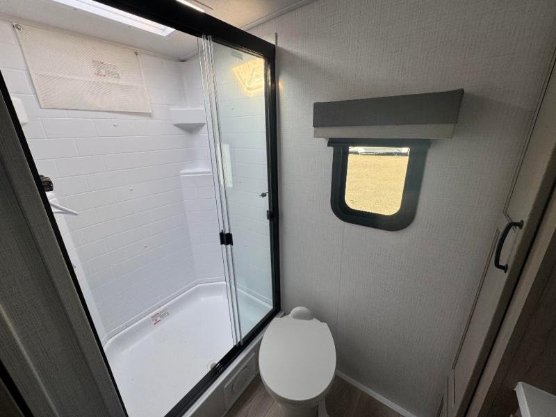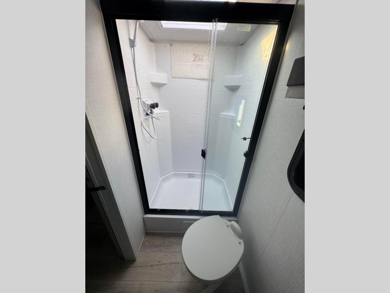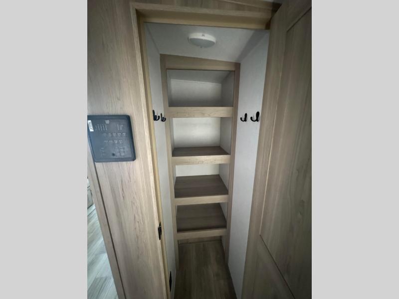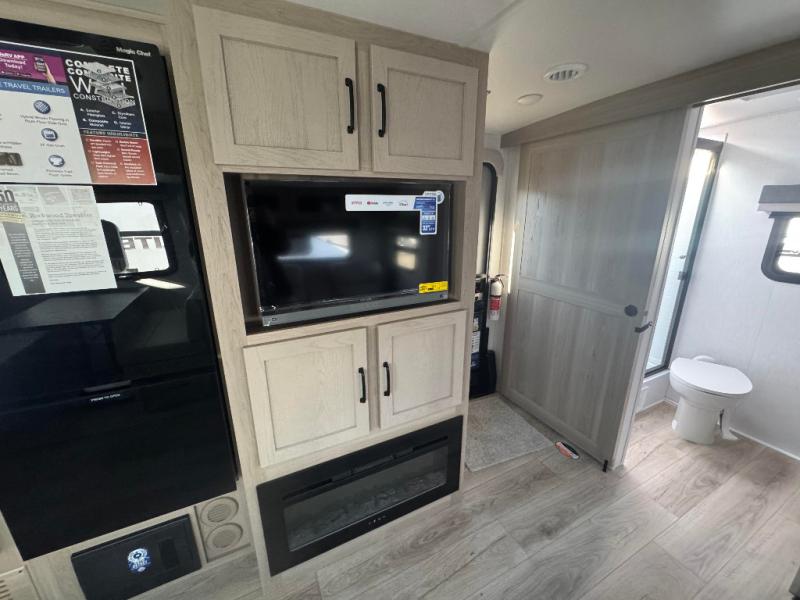 This trailer is the perfect couple's retreat with its private bedroom up front which includes a queen bed, a slide out wardrobe, and a TV option. The spacious rear full bathroom provides a shower and linen storage, and a space savings sliding door. The cook will have full amenities with ample counter space, a walk-in pantry for food storage, and a three burner range to cook meals on. If the weather is nice outside, you can make dinner on the exterior griddle, and there is a 21' awning to relax under. Or you can stay inside to enjoy the fireplace and Smart TV! You will also appreciate the pass thru storage with an optional steel sliding tray to easily access gear!