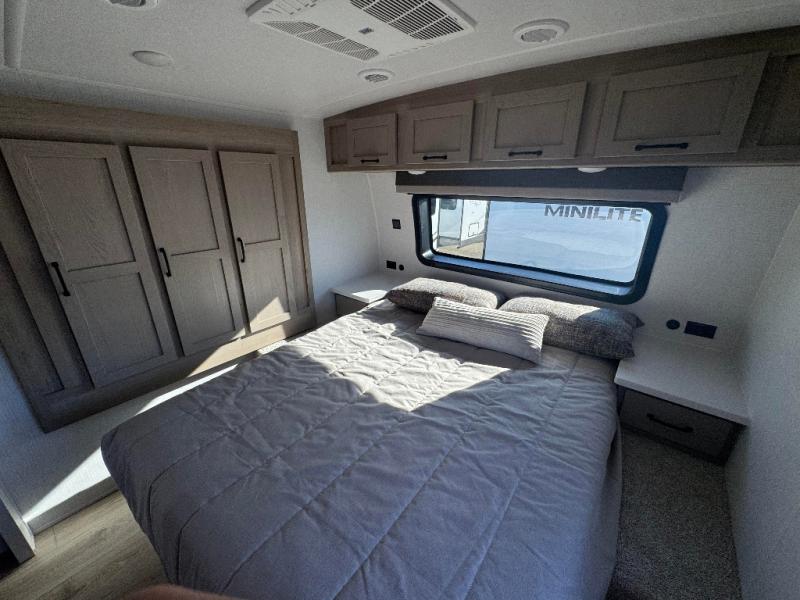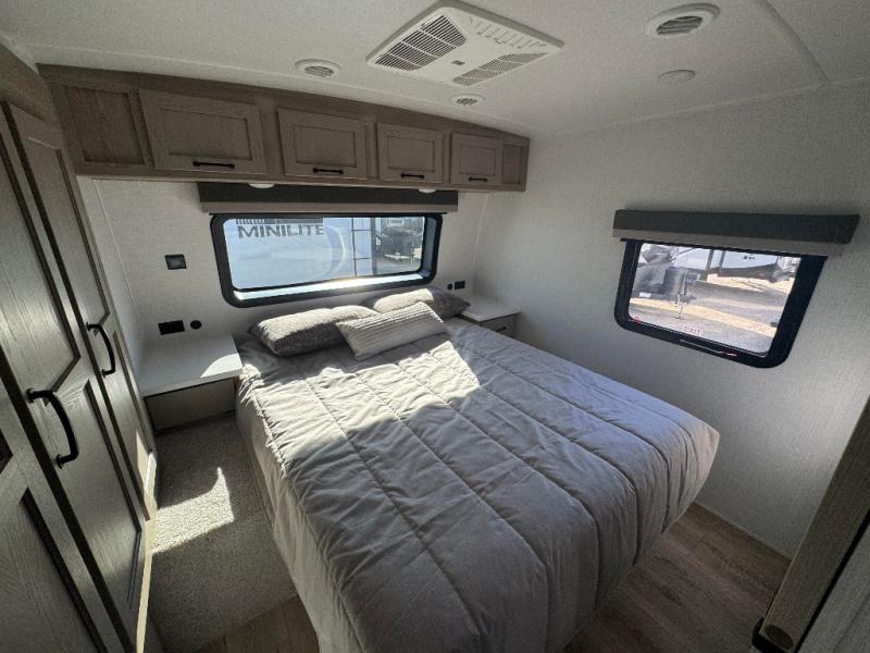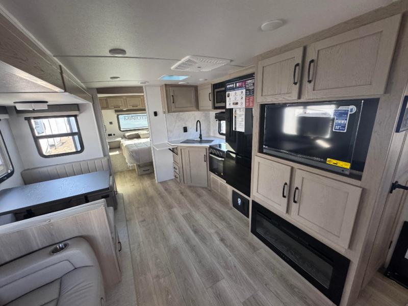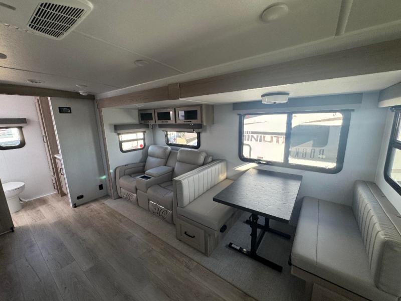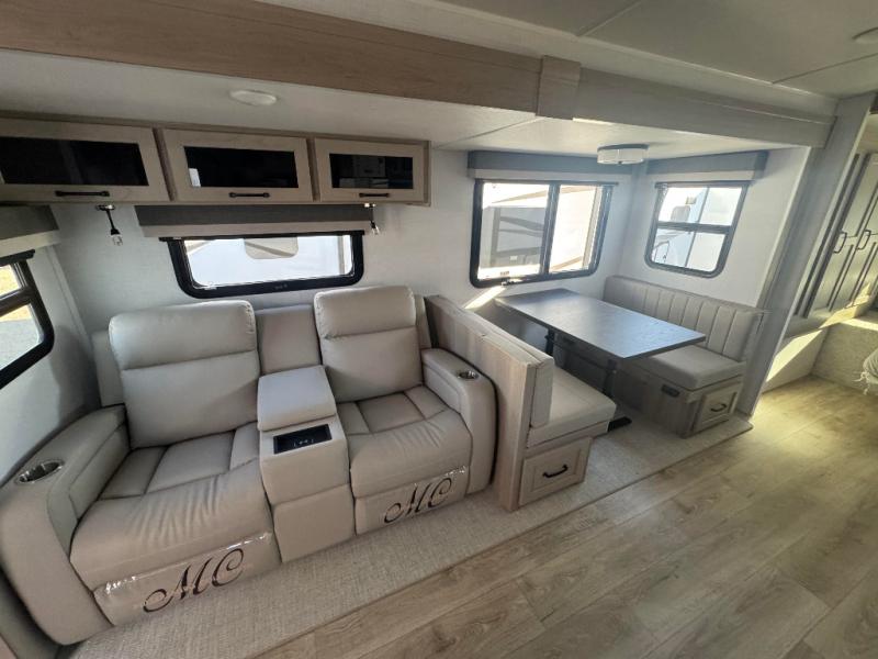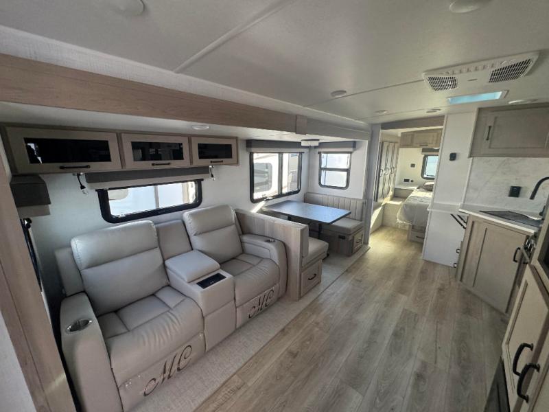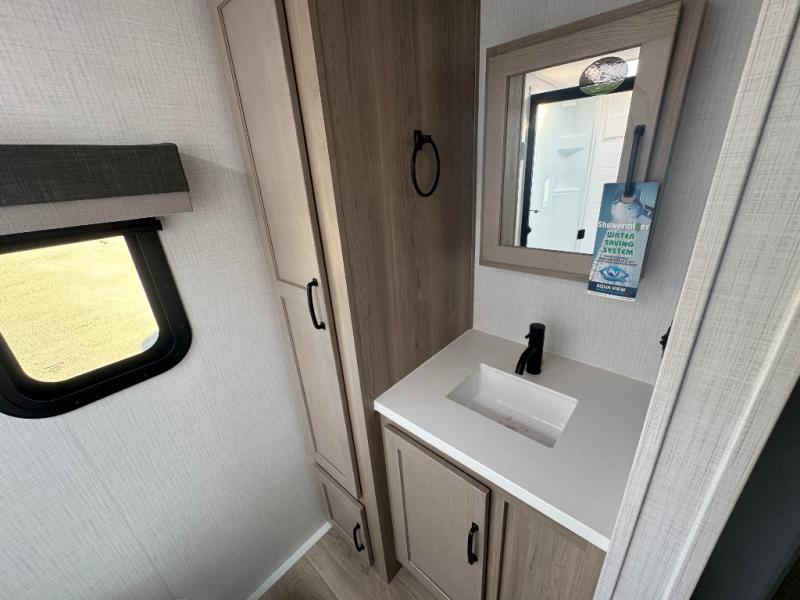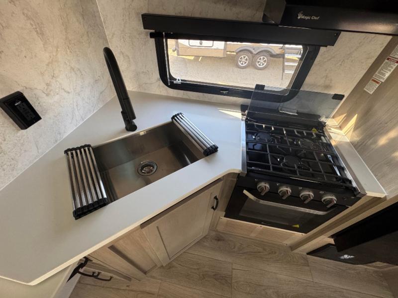 This trailer is the perfect couple's retreat with its private bedroom up front which includes a queen bed, a slide out wardrobe, and a TV option. The spacious rear full bathroom provides a shower and linen storage, and a space savings sliding door. The cook will have full amenities with ample counter space, a walk-in pantry for food storage, and a three burner range to cook meals on. If the weather is nice outside, you can make dinner on the exterior griddle, and there is a 21' awning to relax under. Or you can stay inside to enjoy the fireplace and Smart TV! You will also appreciate the pass thru storage with an optional steel sliding tray to easily access gear!