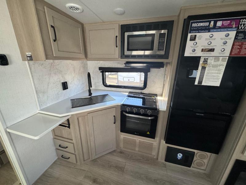 Each Rockwood Ultra Lite travel trailer by Forest River includes superior construction with a high gloss front cap, laminated white fiberglass sidewalls, and tinted frameless windows for a sleek look. The torsion axle, Rubber-Ryde suspension will make towing smooth and hassle-free, along with the nitrogen filled, Goodyear Endurance tires and the tire pressure monitor system. Interior comforts include designer kitchen backsplash, solid wood cabinet doors with hidden hinges, and night roller shades to name a few. Choose a Rockwood Ultra Lite travel trailer today!