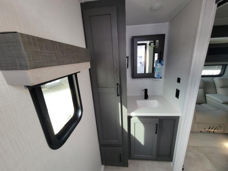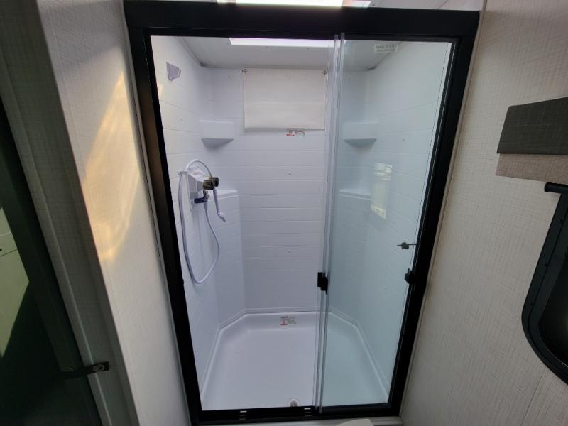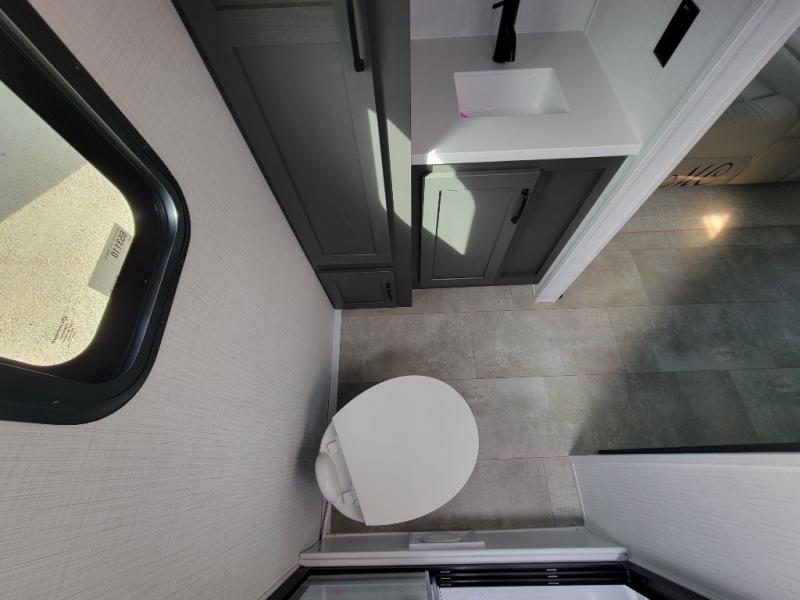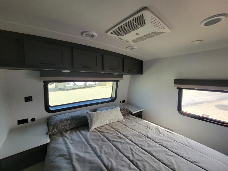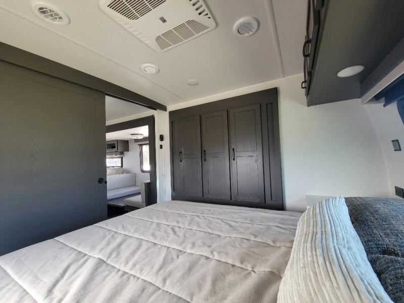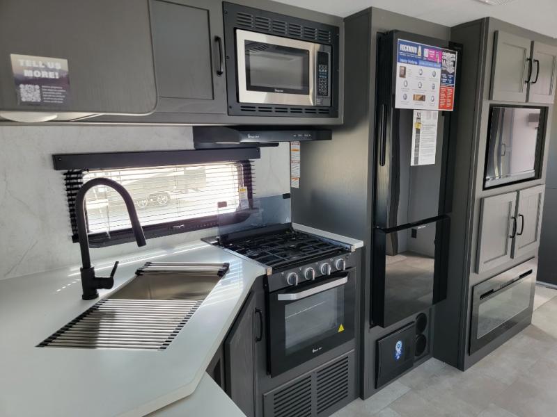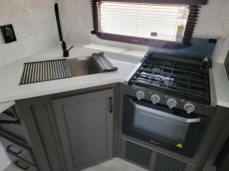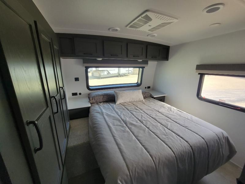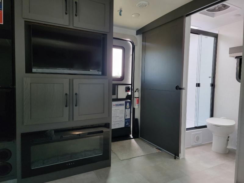 This trailer is the perfect couple's retreat with its private bedroom up front which includes a queen bed, a slide out wardrobe, and a TV option. The spacious rear full bathroom provides a shower and linen storage, and a space savings sliding door. The cook will have full amenities with ample counter space, a walk-in pantry for food storage, and a three burner range to cook meals on. If the weather is nice outside, you can make dinner on the exterior griddle, and there is a 21' awning to relax under. Or you can stay inside to enjoy the fireplace and Smart TV! You will also appreciate the pass thru storage with an optional steel sliding tray to easily access gear!