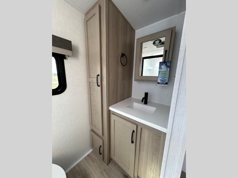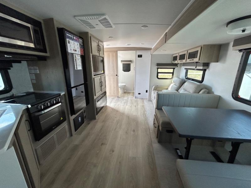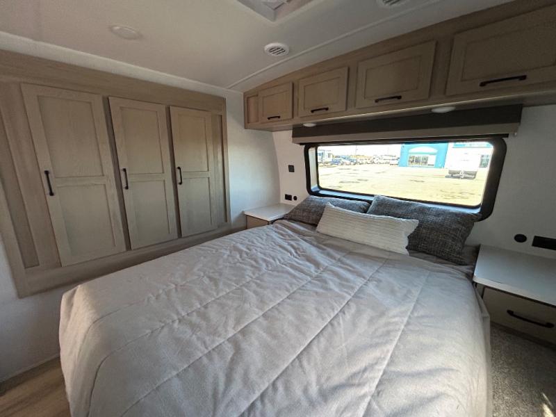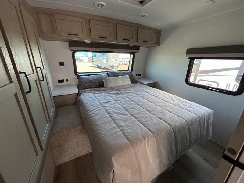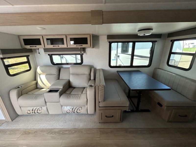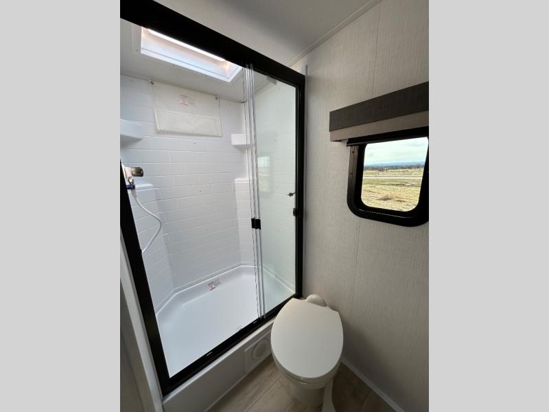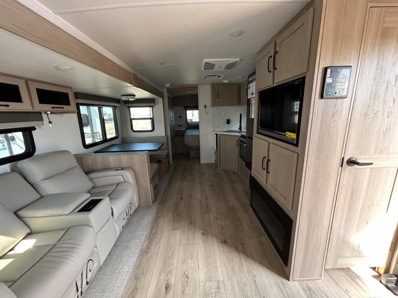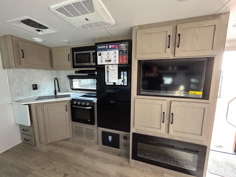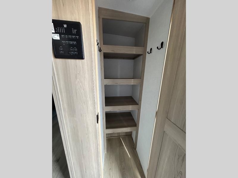 This trailer is the perfect couple's retreat with its private bedroom up front which includes a queen bed, a slide out wardrobe, and a TV option. The spacious rear full bathroom provides a shower and linen storage, and a space savings sliding door. The cook will have full amenities with ample counter space, a walk-in pantry for food storage, and a three burner range to cook meals on. If the weather is nice outside, you can make dinner on the exterior griddle, and there is a 21' awning to relax under. Or you can stay inside to enjoy the fireplace and Smart TV! You will also appreciate the pass thru storage with an optional steel sliding tray to easily access gear!