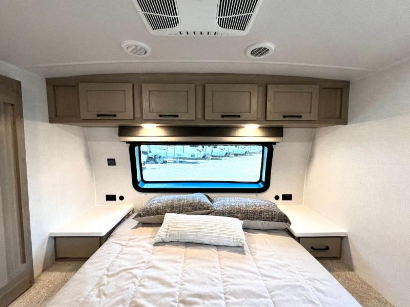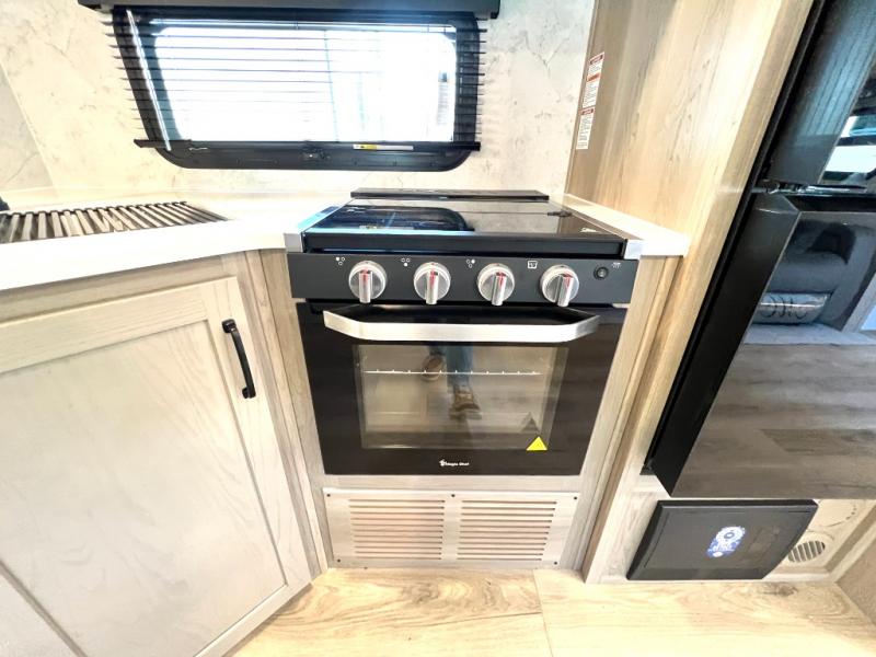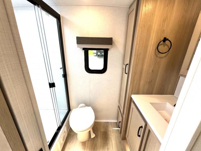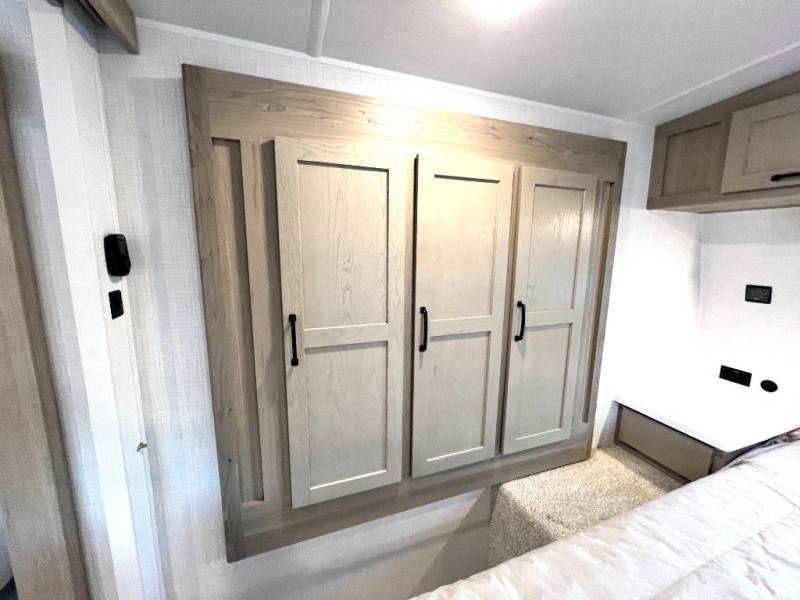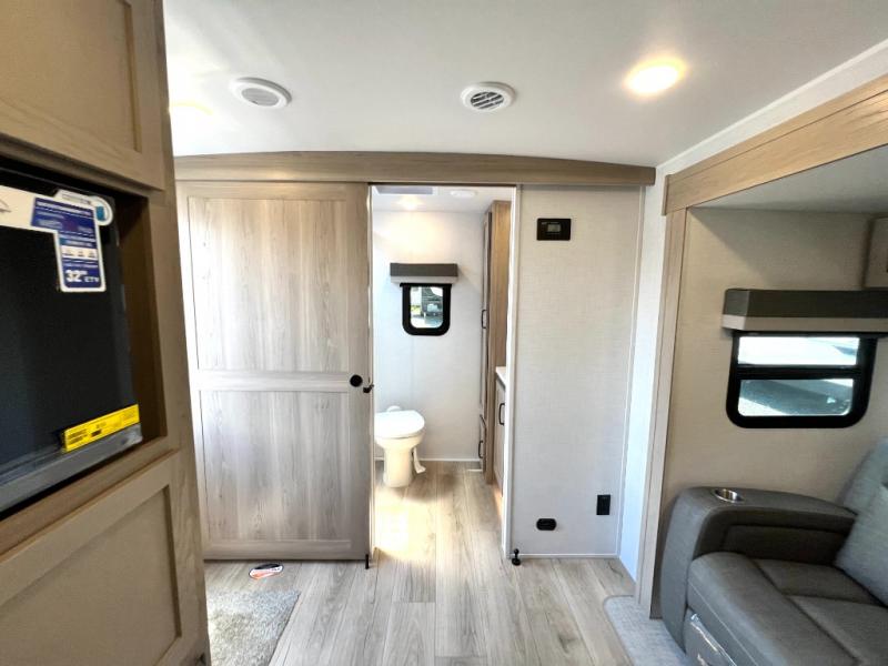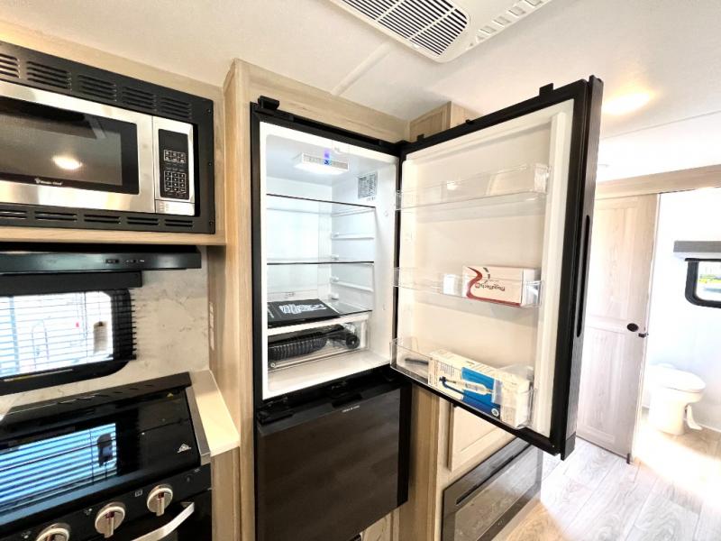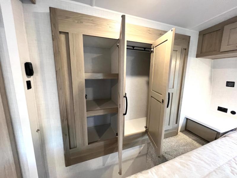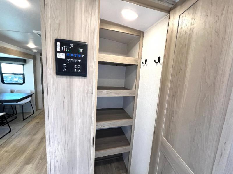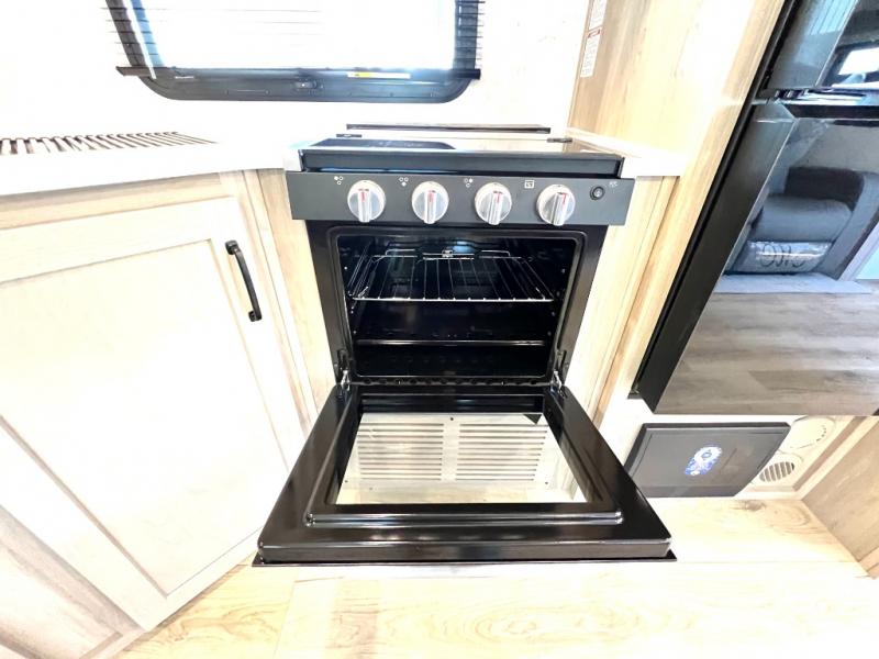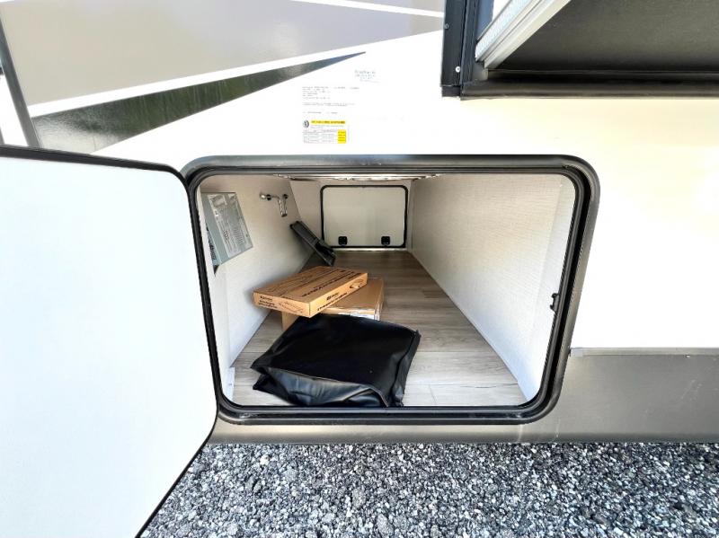 This trailer is the perfect couple's retreat with its private bedroom up front which includes a queen bed, a slide out wardrobe, and a TV option. The spacious rear full bathroom provides a shower and linen storage, and a space savings sliding door. The cook will have full amenities with ample counter space, a walk-in pantry for food storage, and a three burner range to cook meals on. If the weather is nice outside, you can make dinner on the exterior griddle, and there is a 21' awning to relax under. Or you can stay inside to enjoy the fireplace and Smart TV! You will also appreciate the pass thru storage with an optional steel sliding tray to easily access gear!