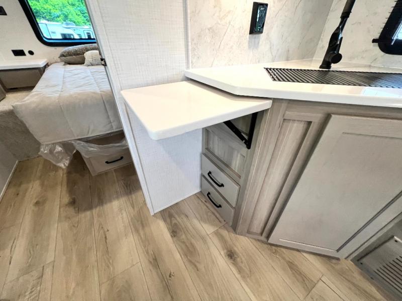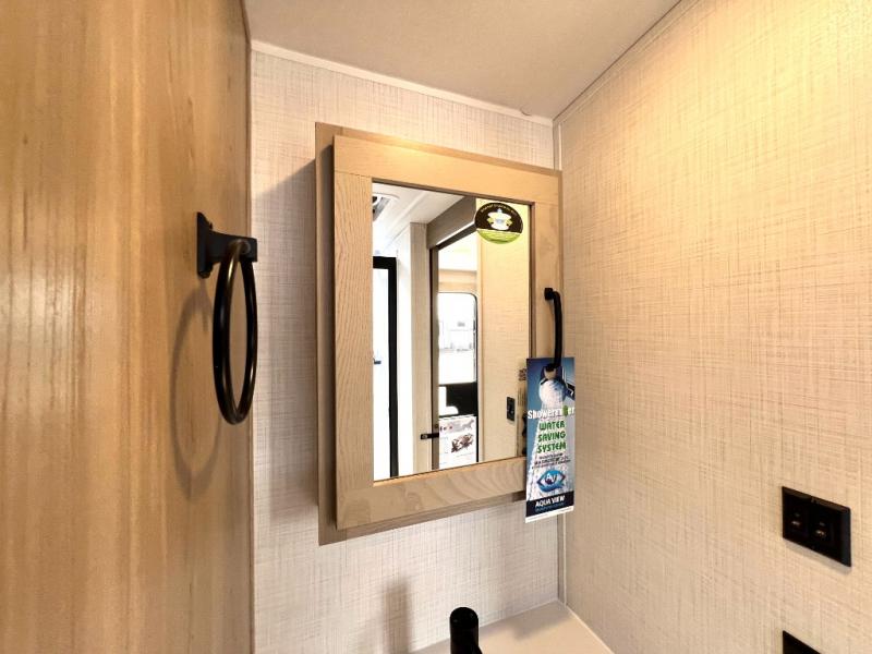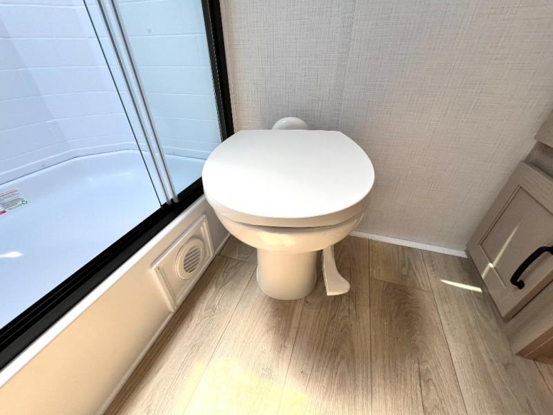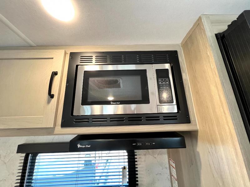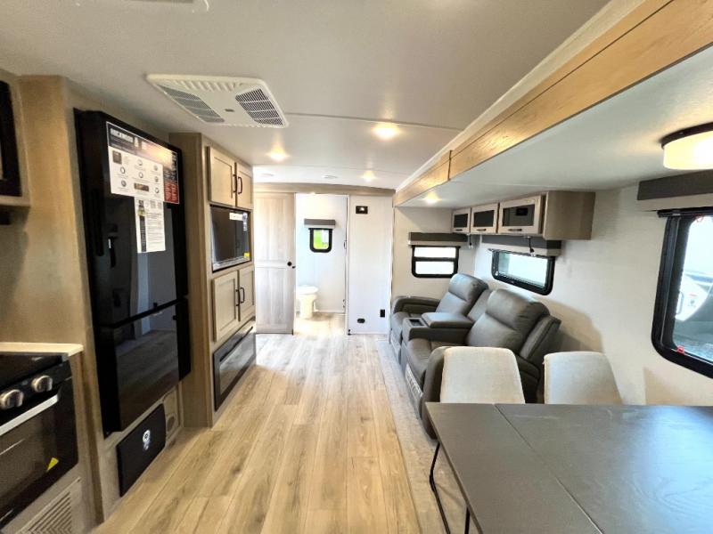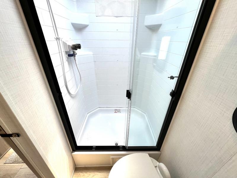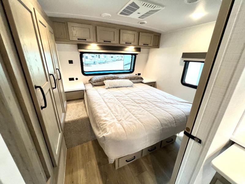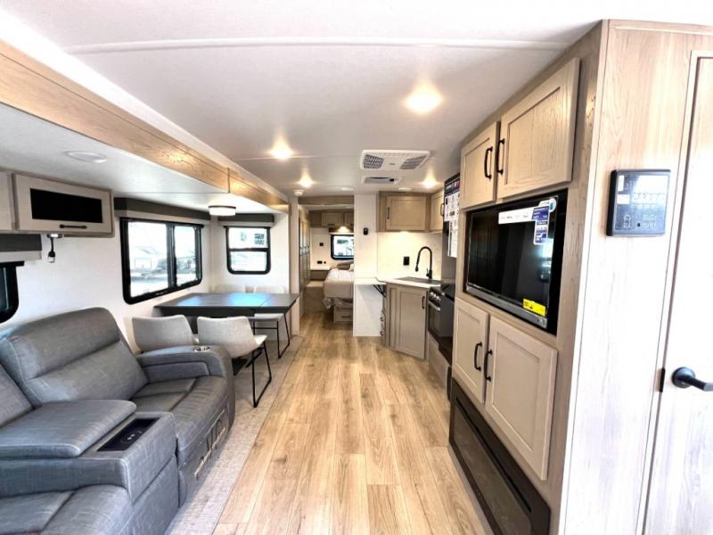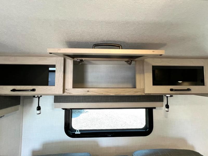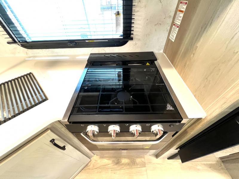 This trailer is the perfect couple's retreat with its private bedroom up front which includes a queen bed, a slide out wardrobe, and a TV option. The spacious rear full bathroom provides a shower and linen storage, and a space savings sliding door. The cook will have full amenities with ample counter space, a walk-in pantry for food storage, and a three burner range to cook meals on. If the weather is nice outside, you can make dinner on the exterior griddle, and there is a 21' awning to relax under. Or you can stay inside to enjoy the fireplace and Smart TV! You will also appreciate the pass thru storage with an optional steel sliding tray to easily access gear!