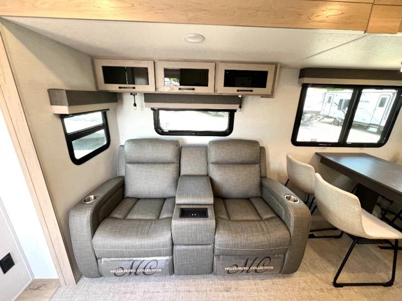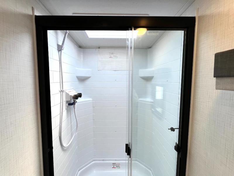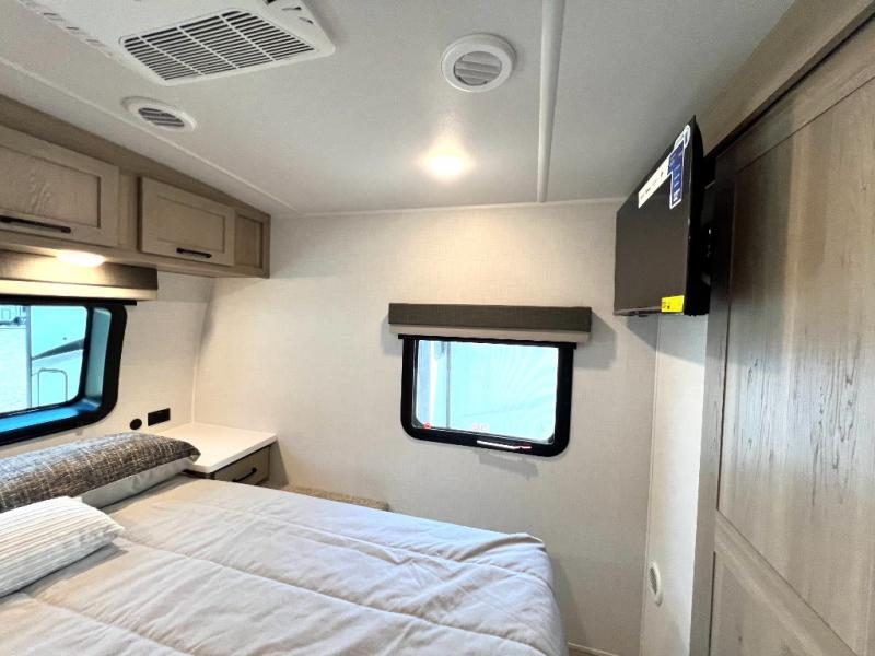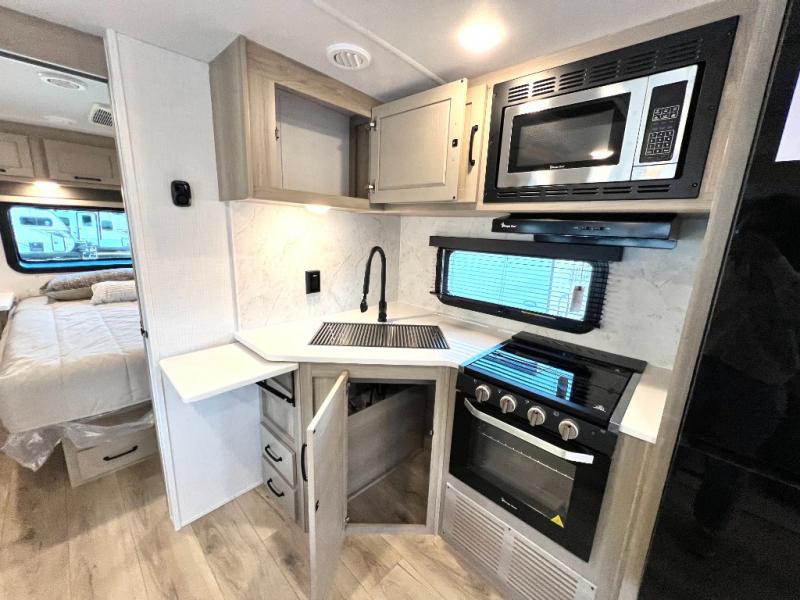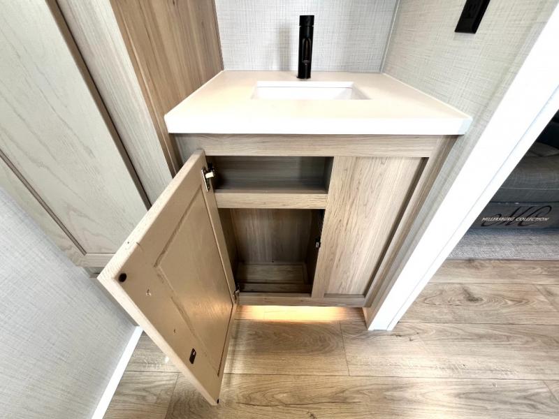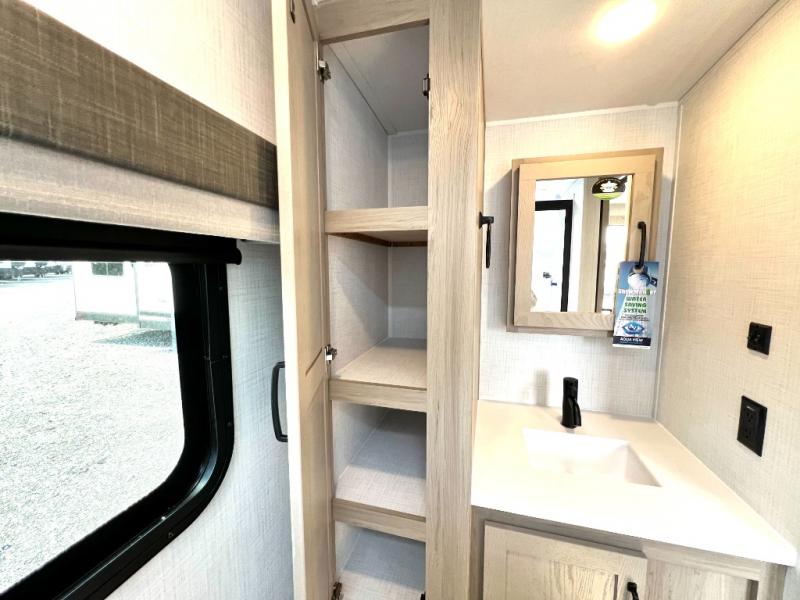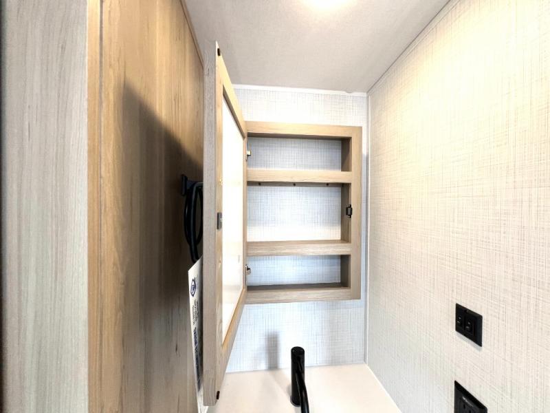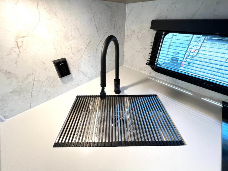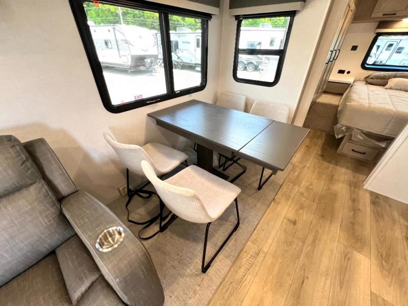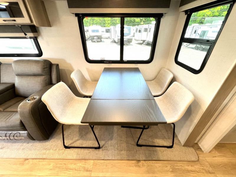 This trailer is the perfect couple's retreat with its private bedroom up front which includes a queen bed, a slide out wardrobe, and a TV option. The spacious rear full bathroom provides a shower and linen storage, and a space savings sliding door. The cook will have full amenities with ample counter space, a walk-in pantry for food storage, and a three burner range to cook meals on. If the weather is nice outside, you can make dinner on the exterior griddle, and there is a 21' awning to relax under. Or you can stay inside to enjoy the fireplace and Smart TV! You will also appreciate the pass thru storage with an optional steel sliding tray to easily access gear!