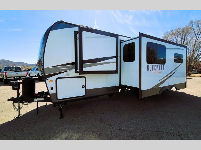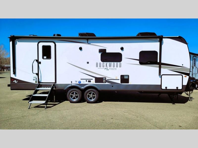 Each Rockwood Ultra Lite travel trailer by Forest River includes superior construction with a high gloss front cap, laminated white fiberglass sidewalls, and tinted frameless windows for a sleek look. The torsion axle, Rubber-Ryde suspension will make towing smooth and hassle-free, along with the nitrogen filled, Goodyear Endurance tires and the tire pressure monitor system. Interior comforts include designer kitchen backsplash, solid wood cabinet doors with hidden hinges, and night roller shades to name a few. Choose a Rockwood Ultra Lite travel trailer today!