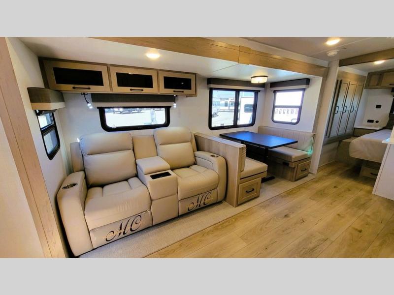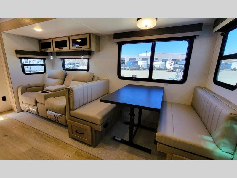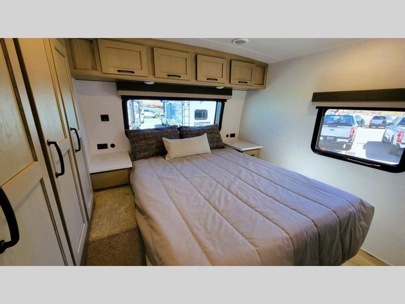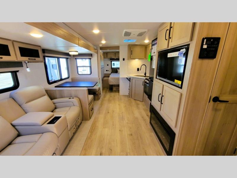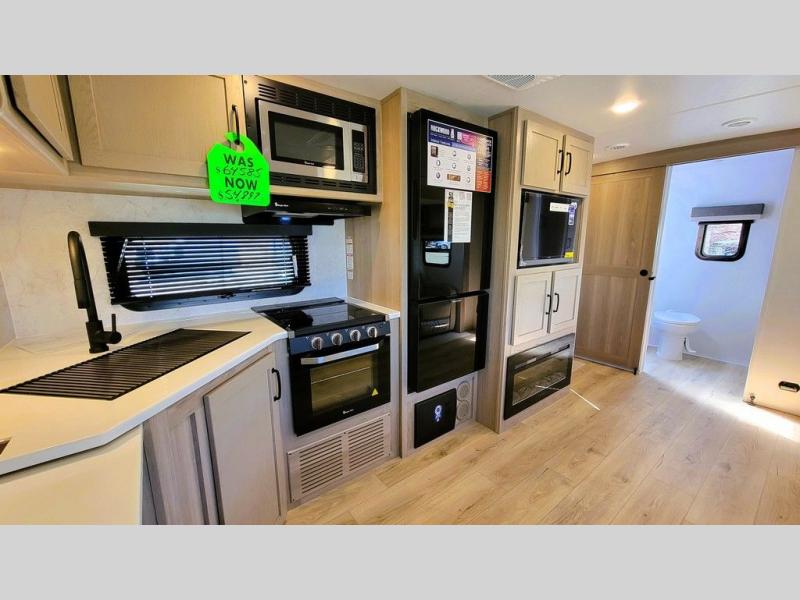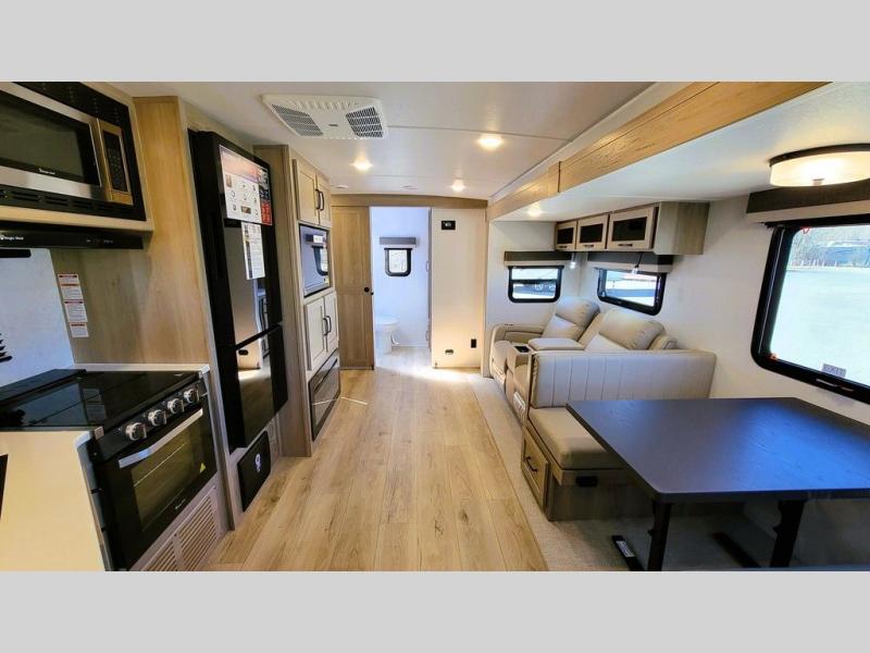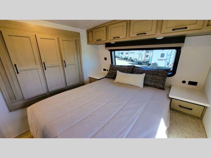This trailer is the perfect couple's retreat with its private bedroom up front which includes a queen bed, a slide out wardrobe, and a TV option. The spacious rear full bathroom provides a shower and linen storage, and a space savings sliding door. The cook will have full amenities with ample counter space, a walk-in pantry for food storage, and a three burner range to cook meals on. If the weather is nice outside, you can make dinner on the exterior griddle, and there is a 21' awning to relax under. Or you can stay inside to enjoy the fireplace and Smart TV! You will also appreciate the pass thru storage with an optional steel sliding tray to easily access gear!