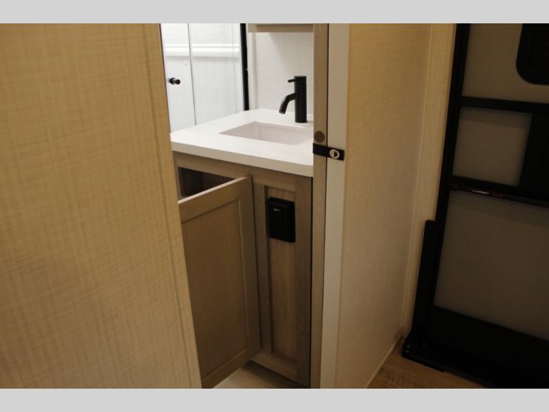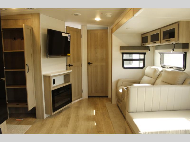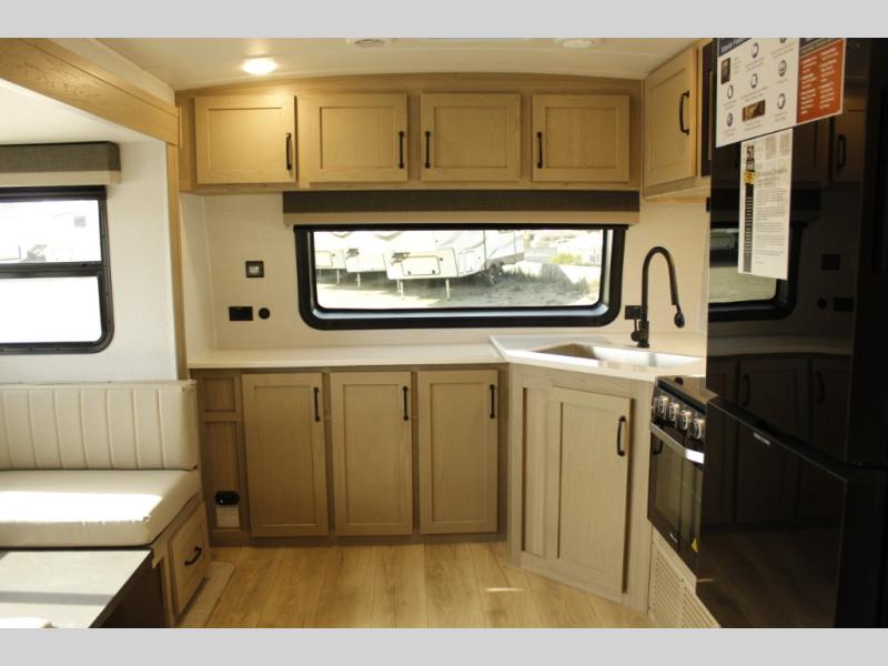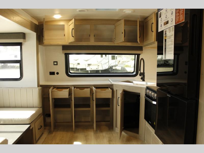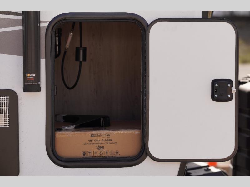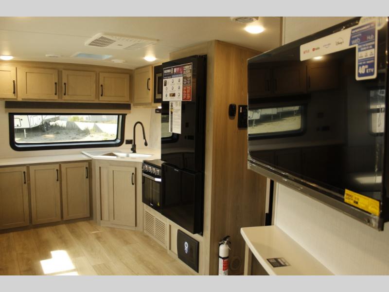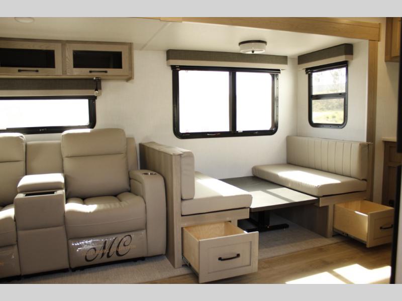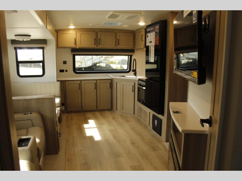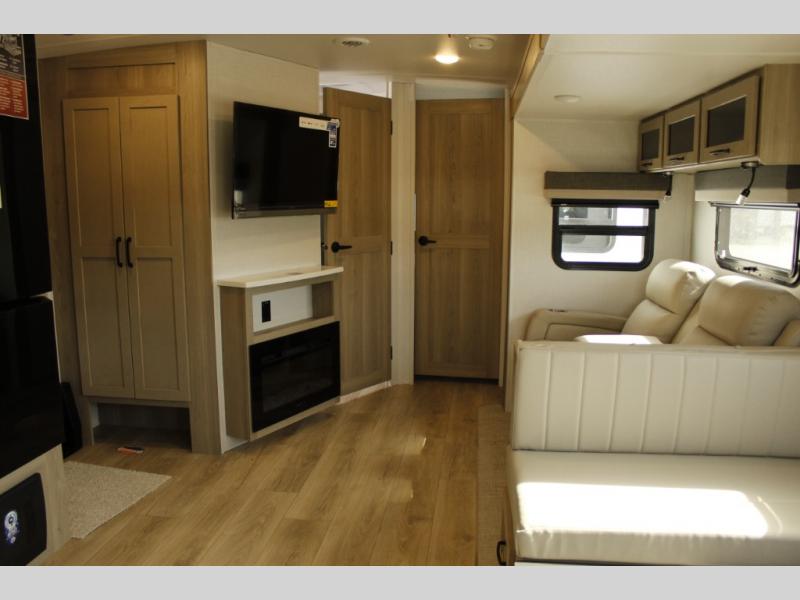 When you are outside this trailer you can enjoy the protection from the 21' power awning, and whip up a meal using the outside griddle. You will find exterior storage for your extra gear, and a ladder at the rear. You get to choose which entrance to step up into, be it the spacious rear bedroom with a queen bed slide and a wardrobe, or the main entry into the kitchen and living area. The furniture slide includes a booth dinette to eat your meals at, and theater seating to watch the Smart TV with a fireplace below. And the cook will love the front kitchen with extra counter space, a three burner range, plus a 12V refrigerator and pantry for food storage!