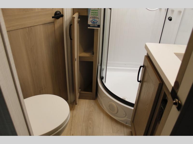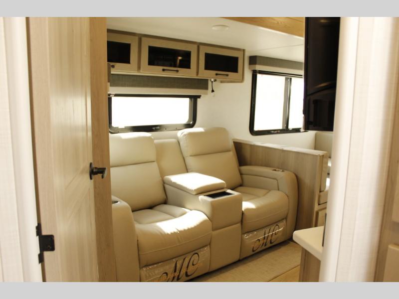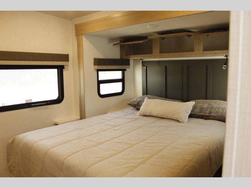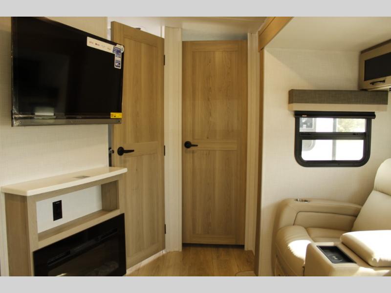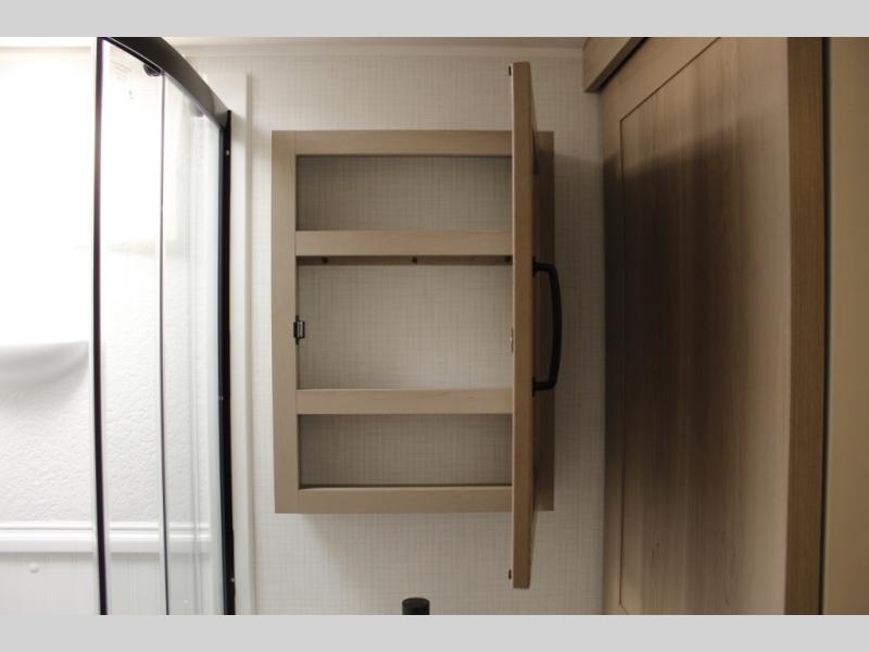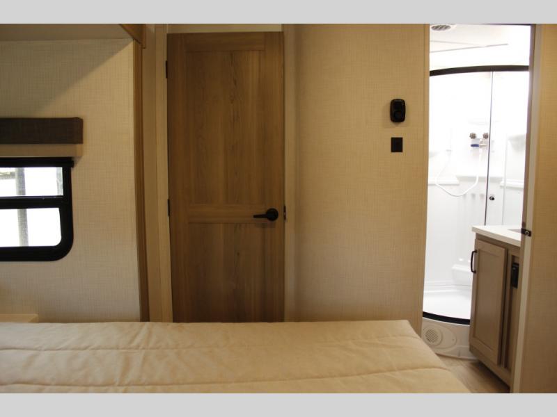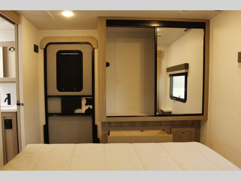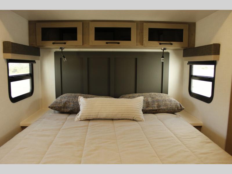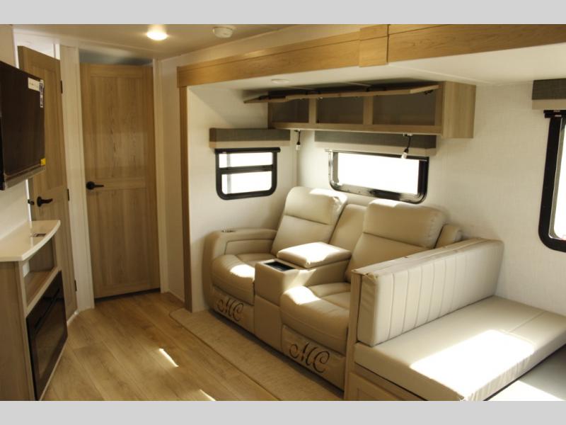 When you are outside this trailer you can enjoy the protection from the 21' power awning, and whip up a meal using the outside griddle. You will find exterior storage for your extra gear, and a ladder at the rear. You get to choose which entrance to step up into, be it the spacious rear bedroom with a queen bed slide and a wardrobe, or the main entry into the kitchen and living area. The furniture slide includes a booth dinette to eat your meals at, and theater seating to watch the Smart TV with a fireplace below. And the cook will love the front kitchen with extra counter space, a three burner range, plus a 12V refrigerator and pantry for food storage!