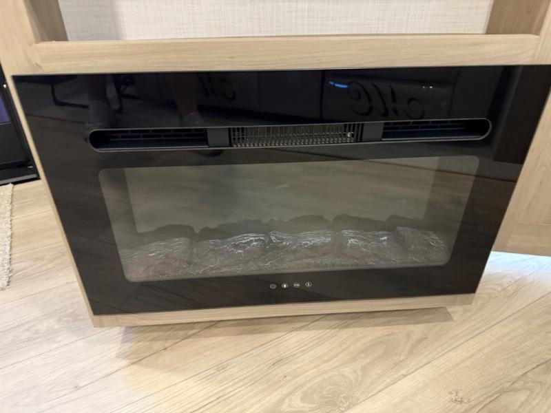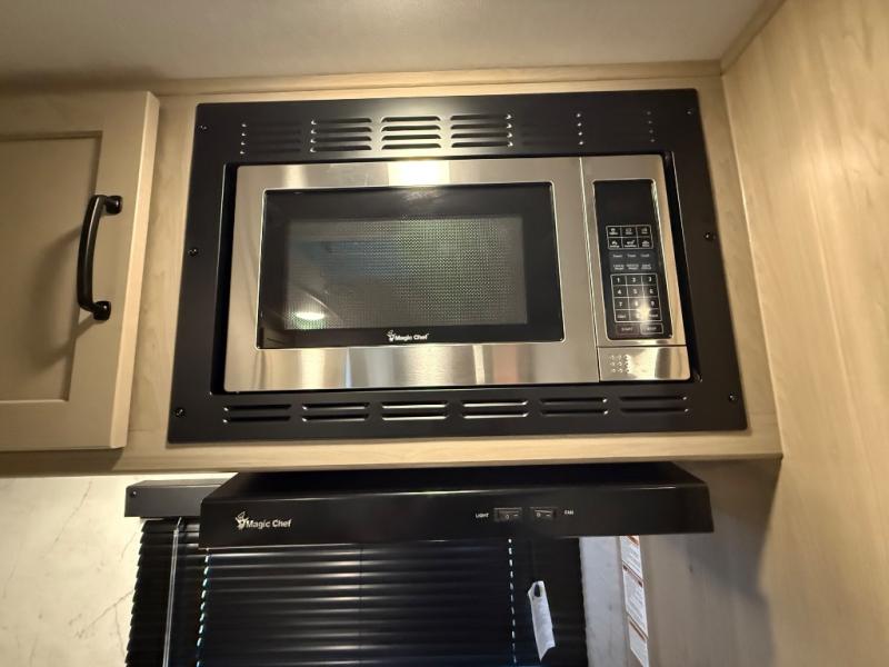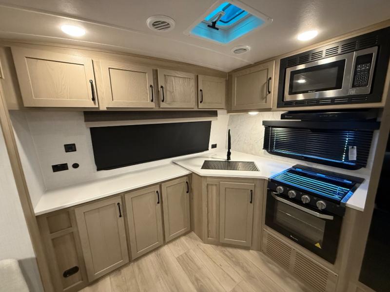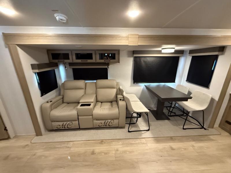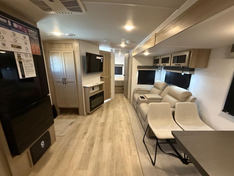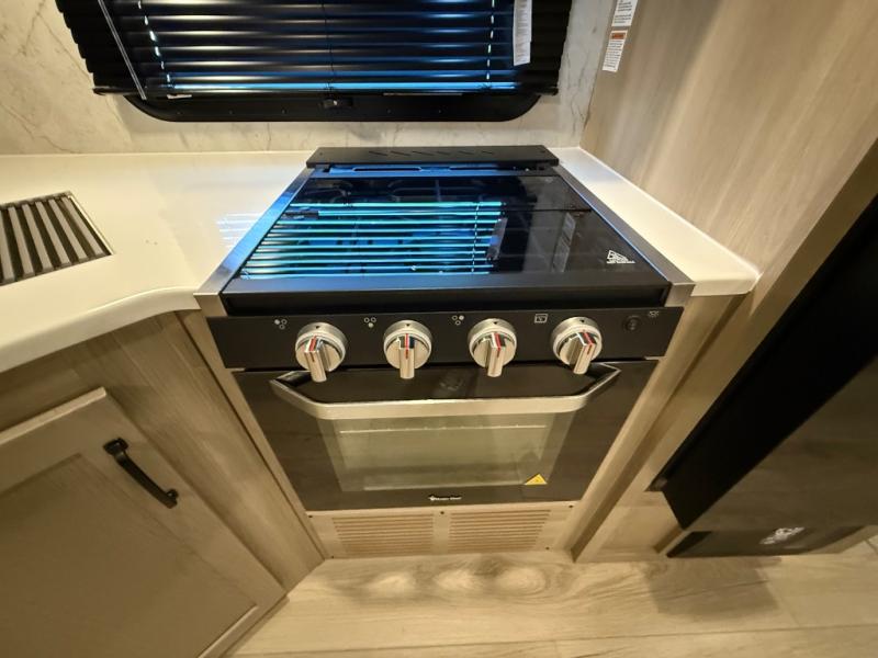 When you are outside this trailer you can enjoy the protection from the 21' power awning, and whip up a meal using the outside griddle. You will find exterior storage for your extra gear, and a ladder at the rear. You get to choose which entrance to step up into, be it the spacious rear bedroom with a queen bed slide and a wardrobe, or the main entry into the kitchen and living area. The furniture slide includes a booth dinette to eat your meals at, and theater seating to watch the Smart TV with a fireplace below. And the cook will love the front kitchen with extra counter space, a three burner range, plus a 12V refrigerator and pantry for food storage!
