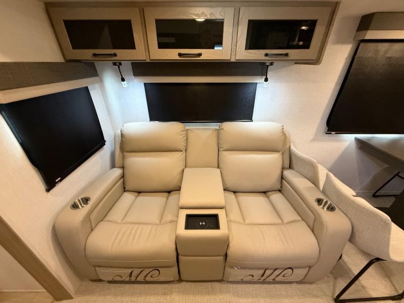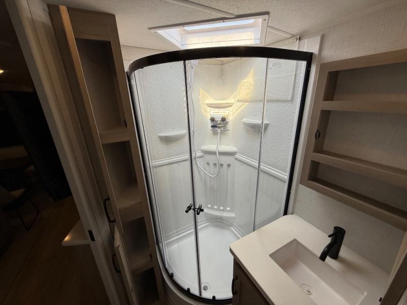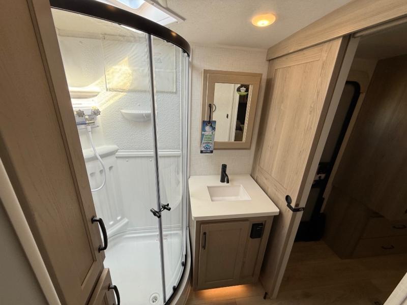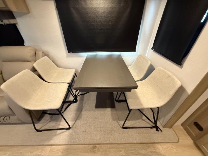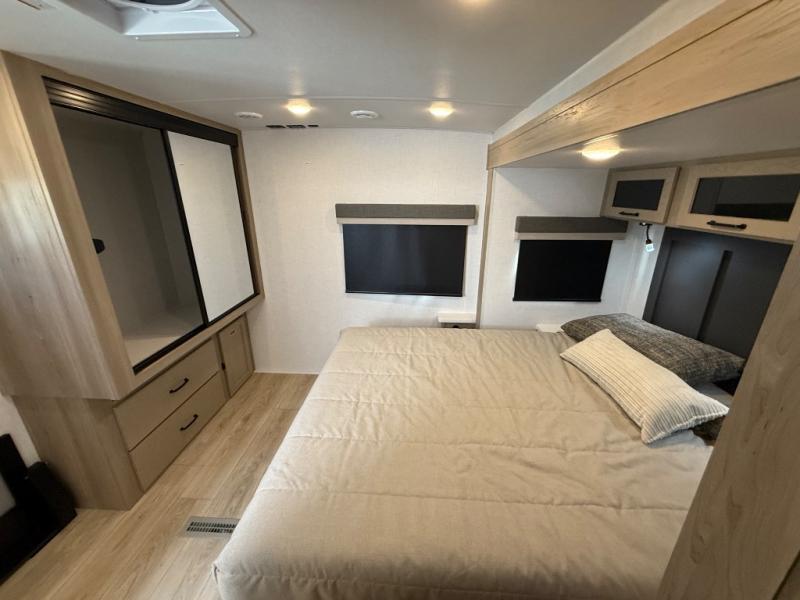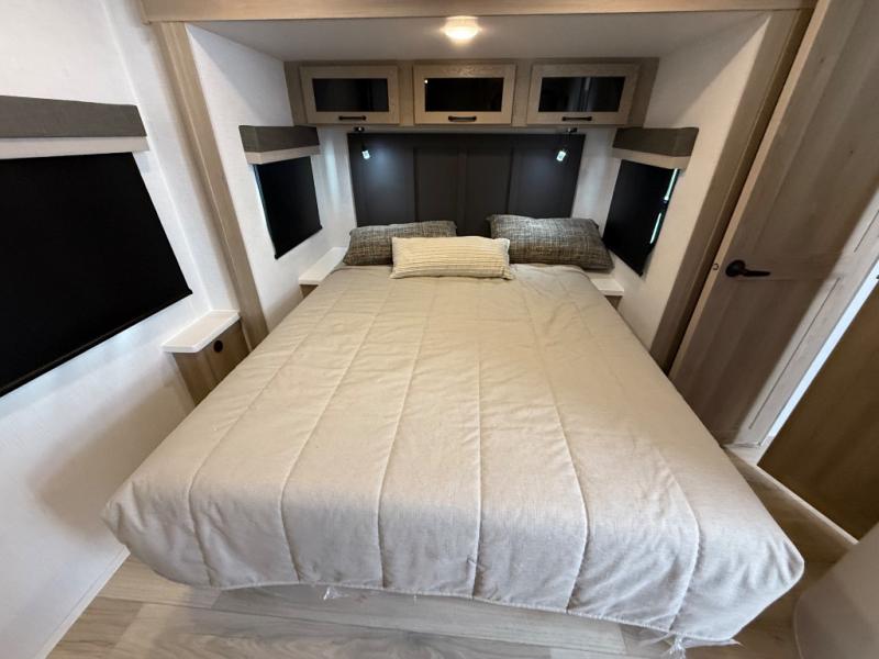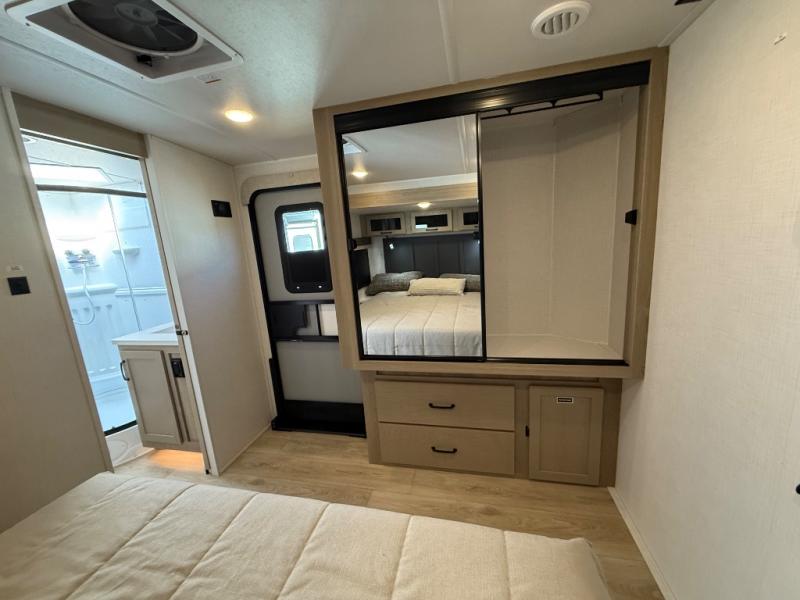 When you are outside this trailer you can enjoy the protection from the 21' power awning, and whip up a meal using the outside griddle. You will find exterior storage for your extra gear, and a ladder at the rear. You get to choose which entrance to step up into, be it the spacious rear bedroom with a queen bed slide and a wardrobe, or the main entry into the kitchen and living area. The furniture slide includes a booth dinette to eat your meals at, and theater seating to watch the Smart TV with a fireplace below. And the cook will love the front kitchen with extra counter space, a three burner range, plus a 12V refrigerator and pantry for food storage!