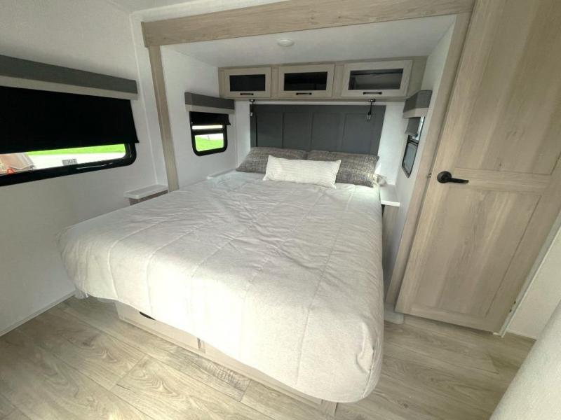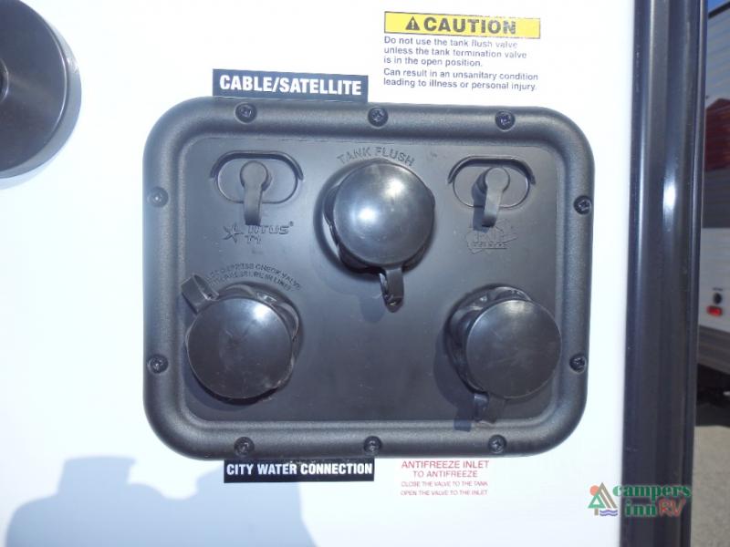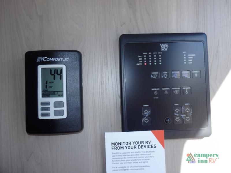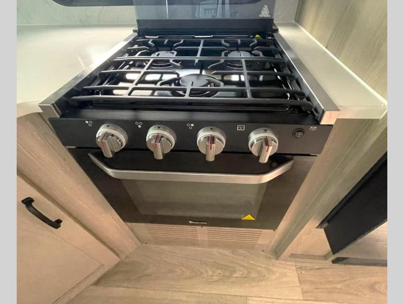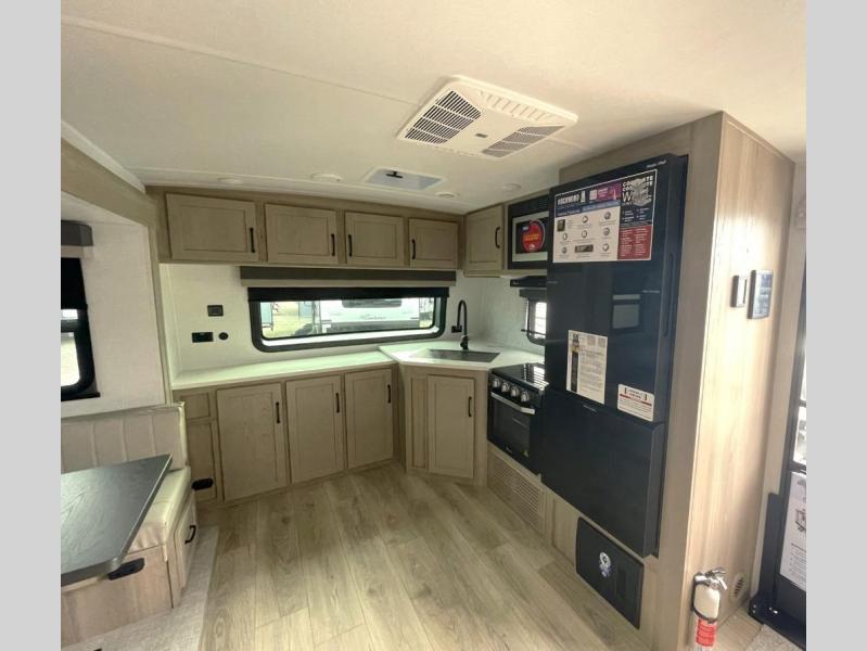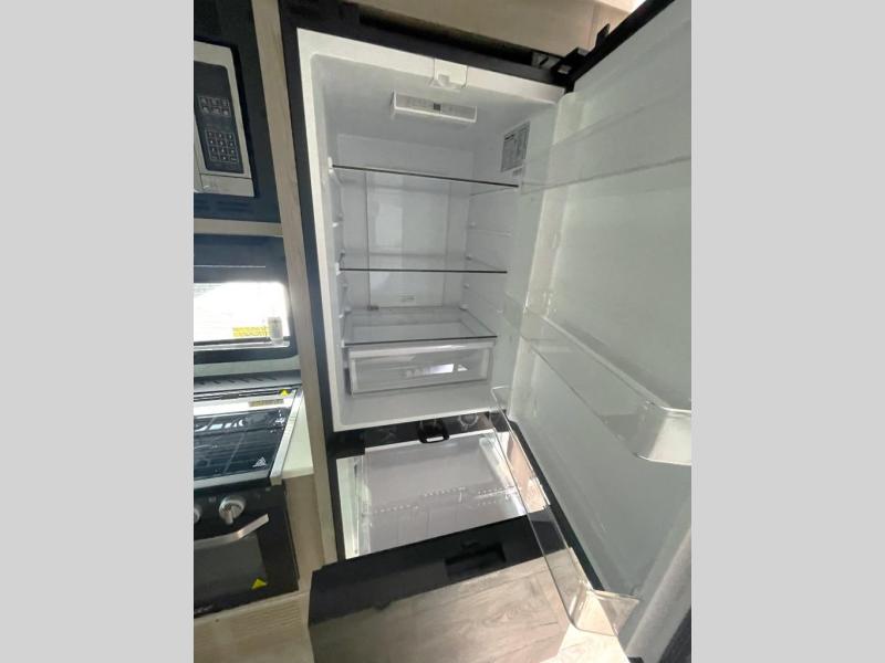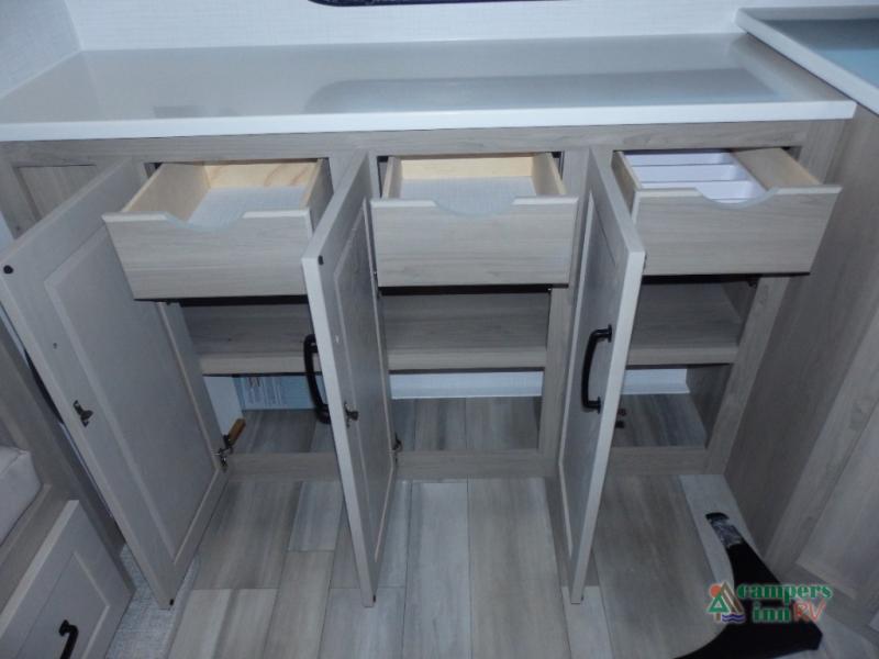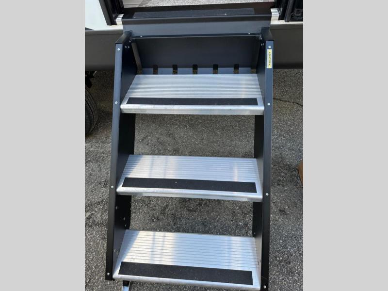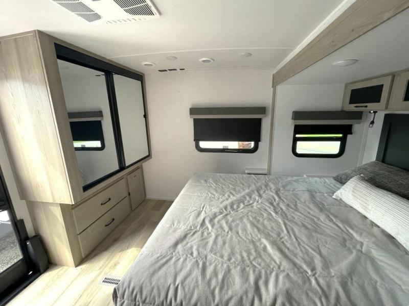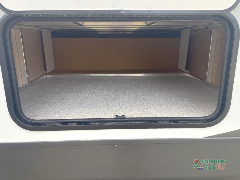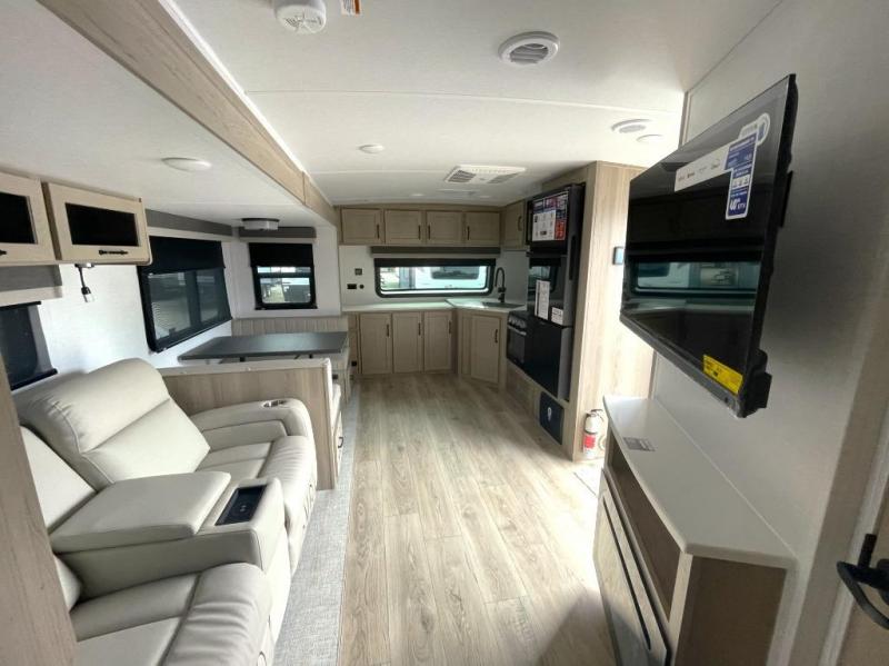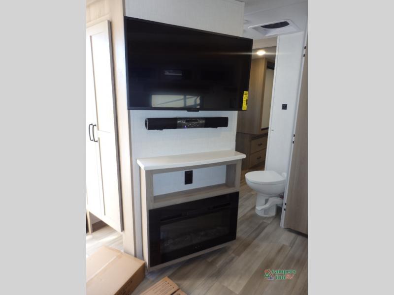 When you are outside this trailer you can enjoy the protection from the 21' power awning, and whip up a meal using the outside griddle. You will find exterior storage for your extra gear, and a ladder at the rear. You get to choose which entrance to step up into, be it the spacious rear bedroom with a queen bed slide and a wardrobe, or the main entry into the kitchen and living area. The furniture slide includes a booth dinette to eat your meals at, and theater seating to watch the Smart TV with a fireplace below. And the cook will love the front kitchen with extra counter space, a three burner range, plus a 12V refrigerator and pantry for food storage!