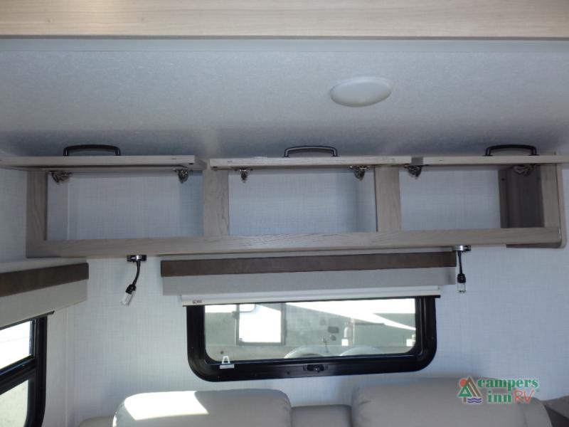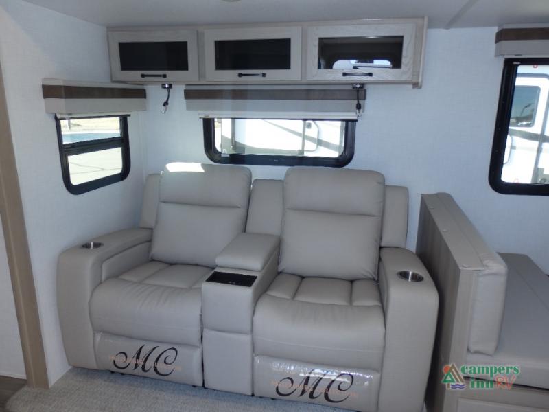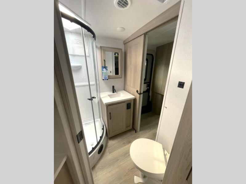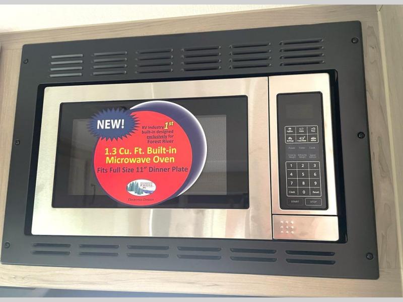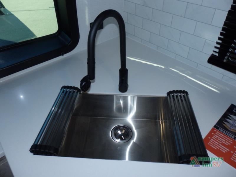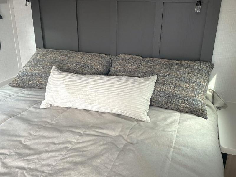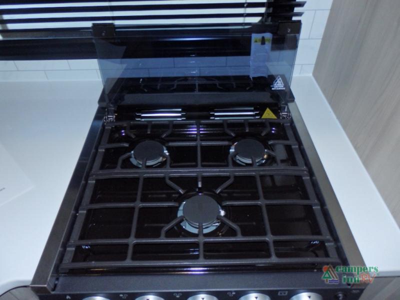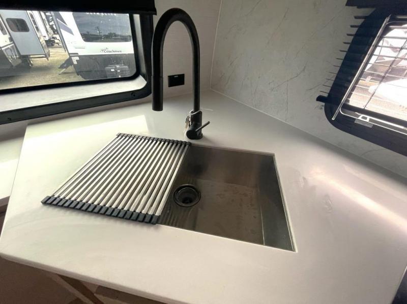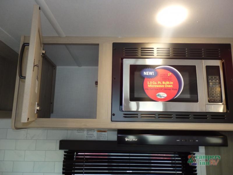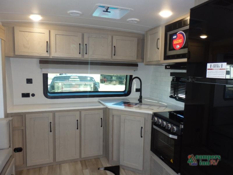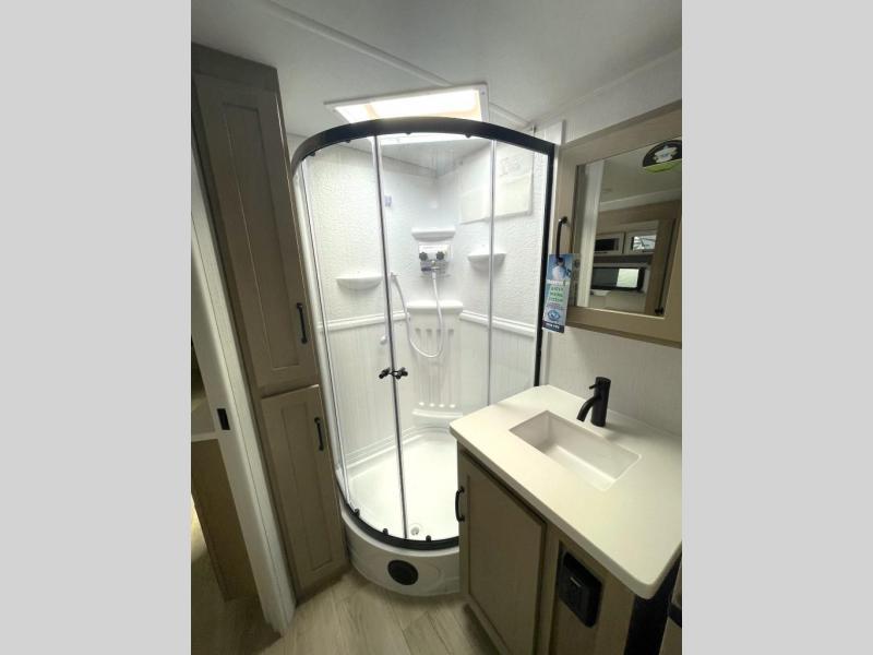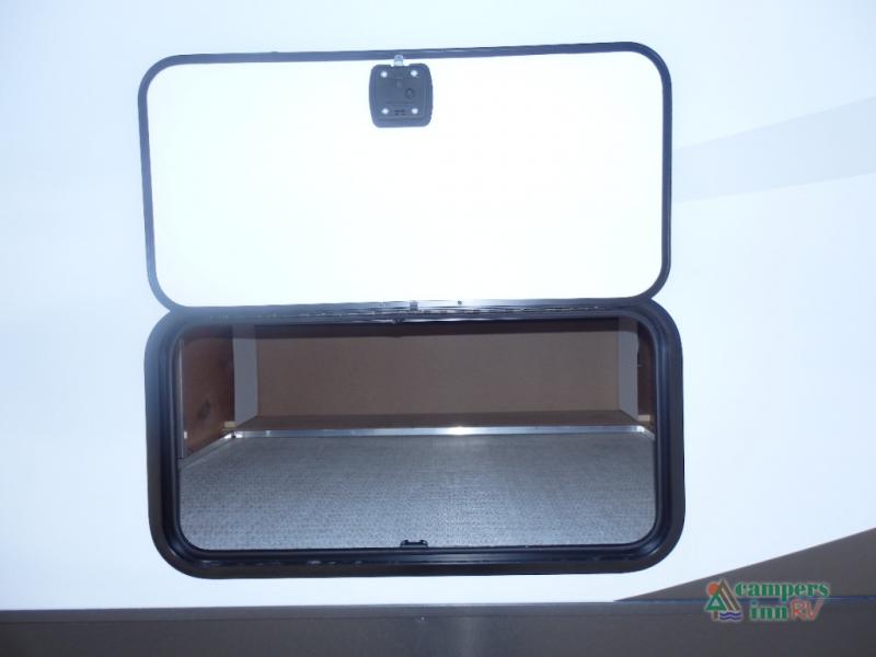 When you are outside this trailer you can enjoy the protection from the 21' power awning, and whip up a meal using the outside griddle. You will find exterior storage for your extra gear, and a ladder at the rear. You get to choose which entrance to step up into, be it the spacious rear bedroom with a queen bed slide and a wardrobe, or the main entry into the kitchen and living area. The furniture slide includes a booth dinette to eat your meals at, and theater seating to watch the Smart TV with a fireplace below. And the cook will love the front kitchen with extra counter space, a three burner range, plus a 12V refrigerator and pantry for food storage!