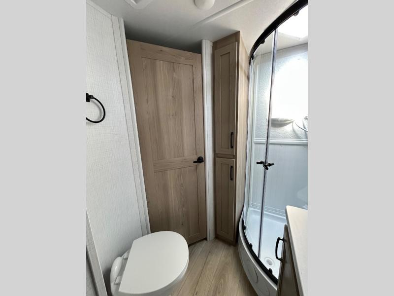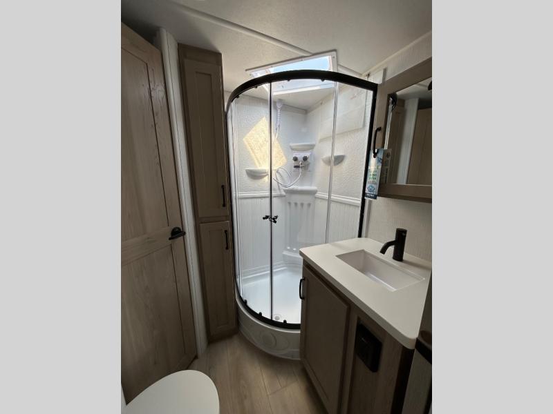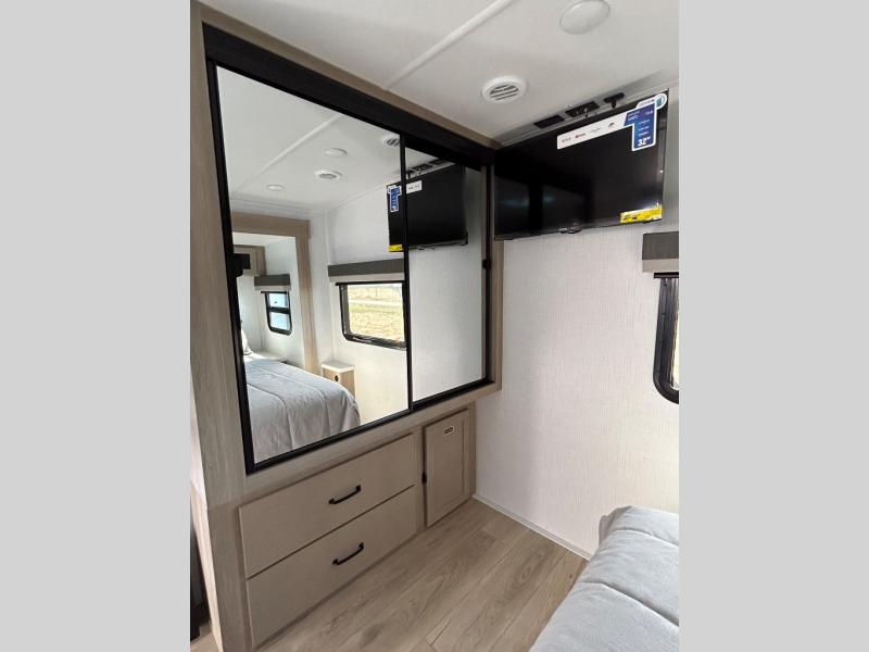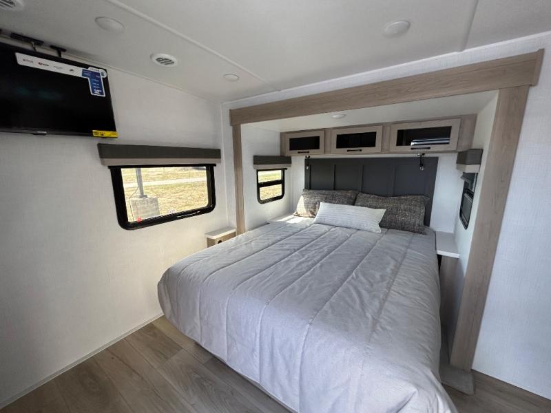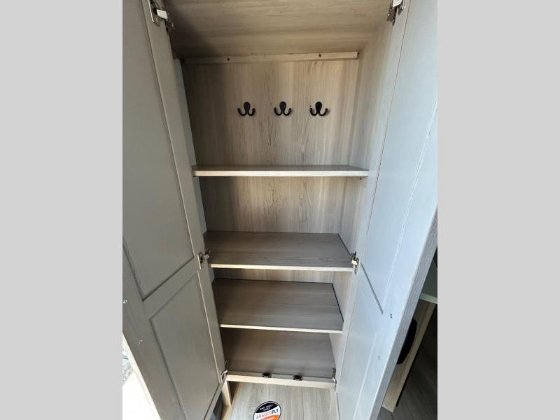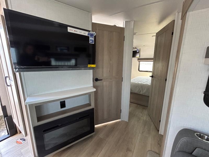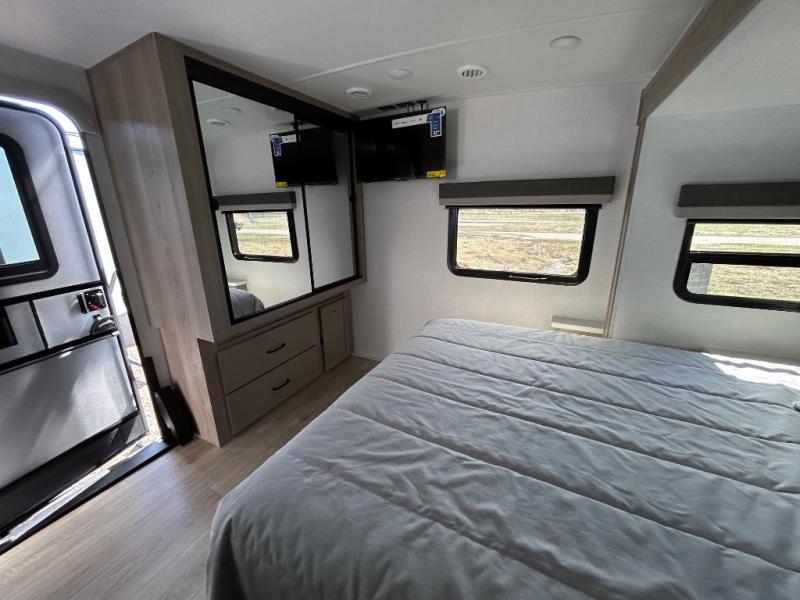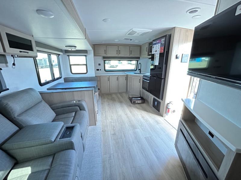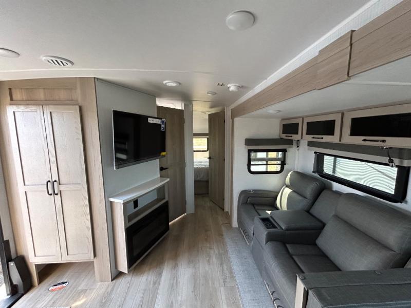 When you are outside this trailer you can enjoy the protection from the 21' power awning, and whip up a meal using the outside griddle. You will find exterior storage for your extra gear, and a ladder at the rear. You get to choose which entrance to step up into, be it the spacious rear bedroom with a queen bed slide and a wardrobe, or the main entry into the kitchen and living area. The furniture slide includes a booth dinette to eat your meals at, and theater seating to watch the Smart TV with a fireplace below. And the cook will love the front kitchen with extra counter space, a three burner range, plus a 12V refrigerator and pantry for food storage!